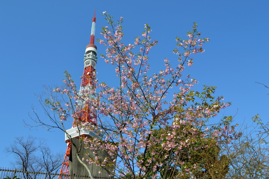 「一言」芝公園の梅林では、紅梅も白梅も花が咲き始めていました。増上寺の梵鐘の横の梅も咲いていて良い眺めです。 東京プリンスホテルの庭には早咲きの桜が咲いていました。東京タワーの下でも河津桜が咲いていました。 ザ・プリンスタワーの入り口の横にある桜が見頃になっていました。