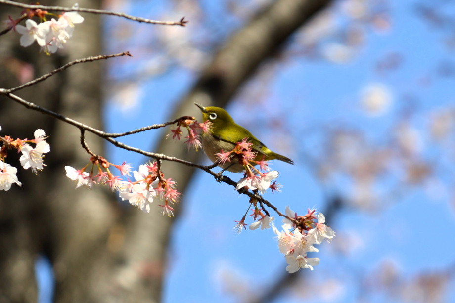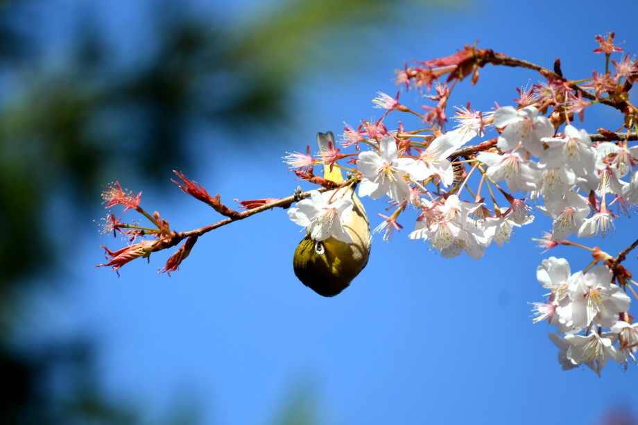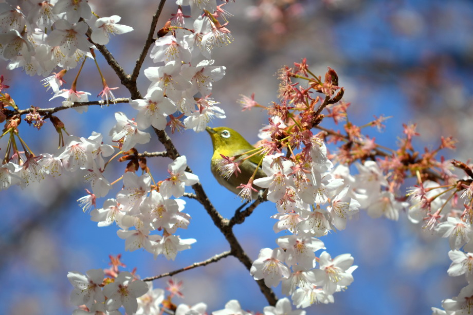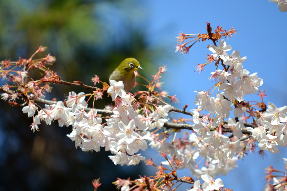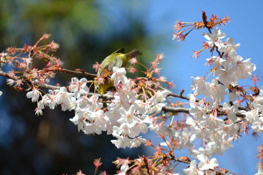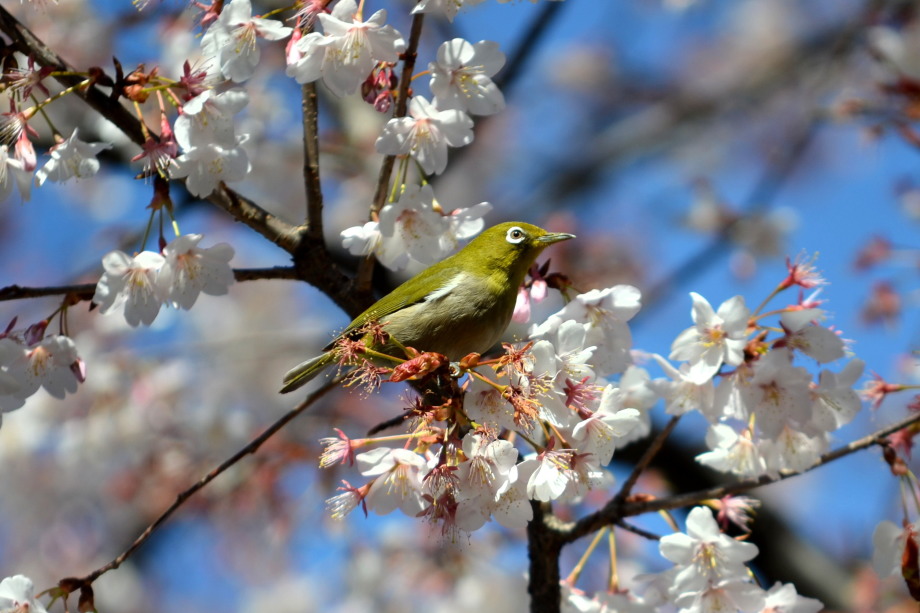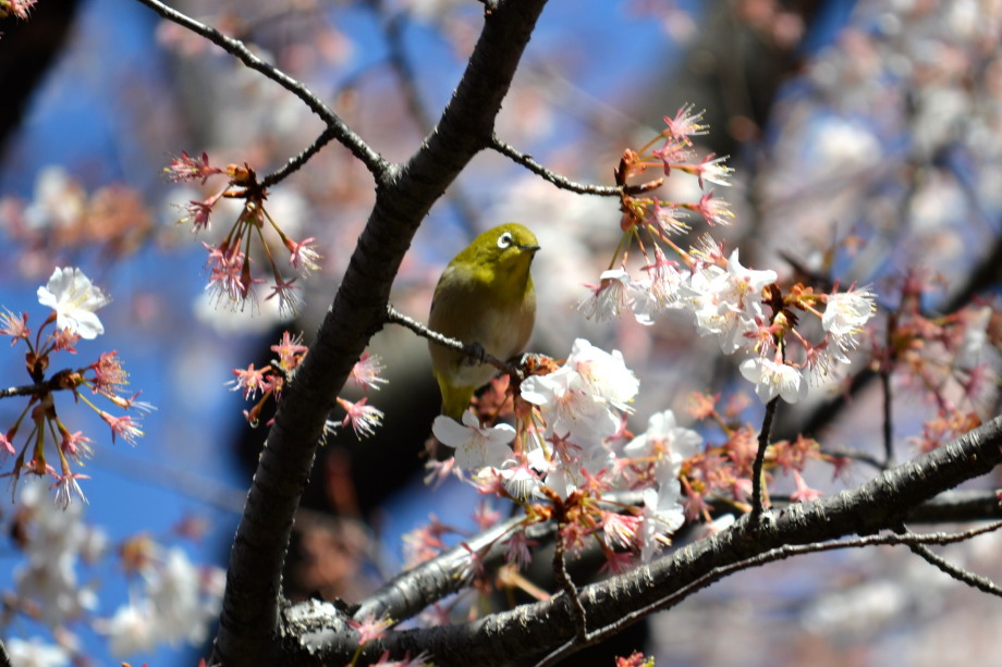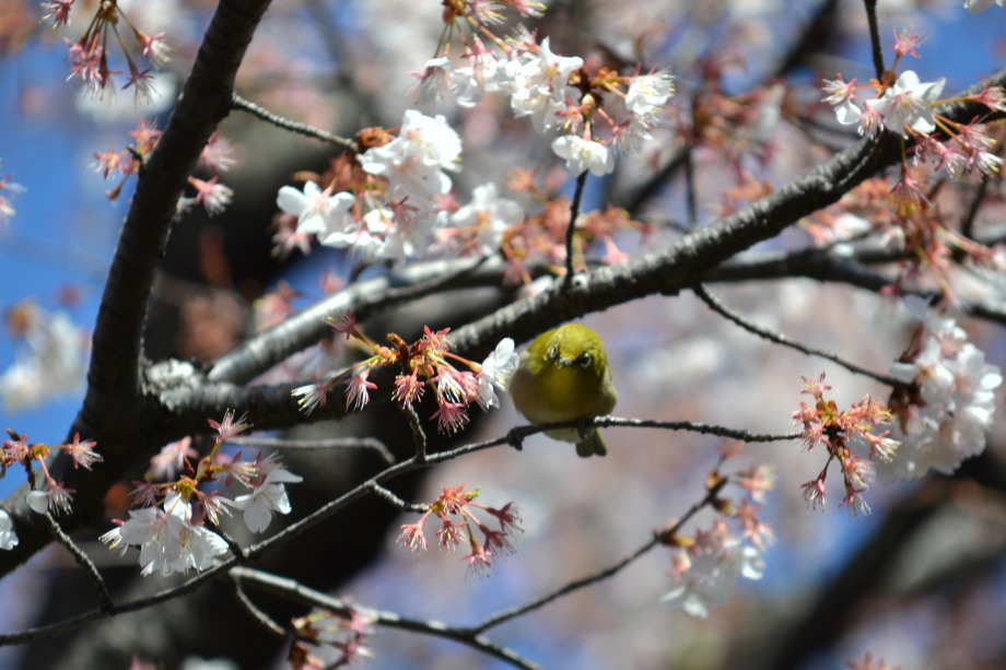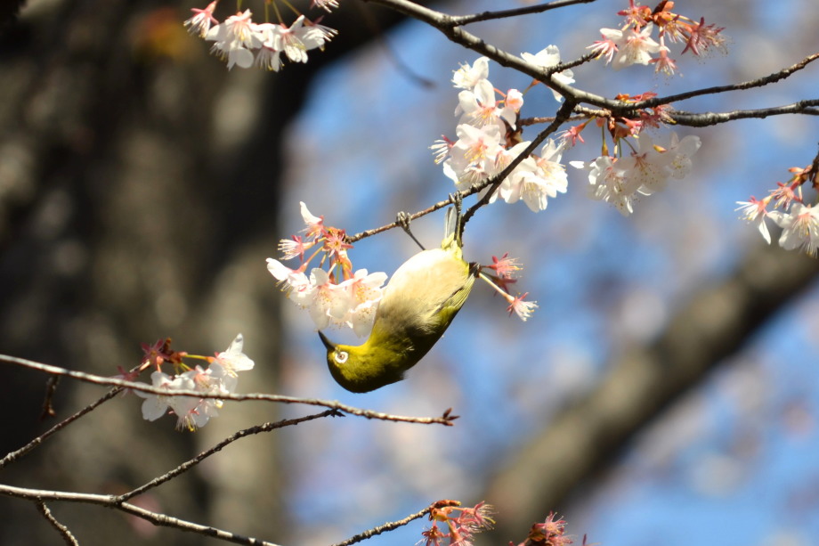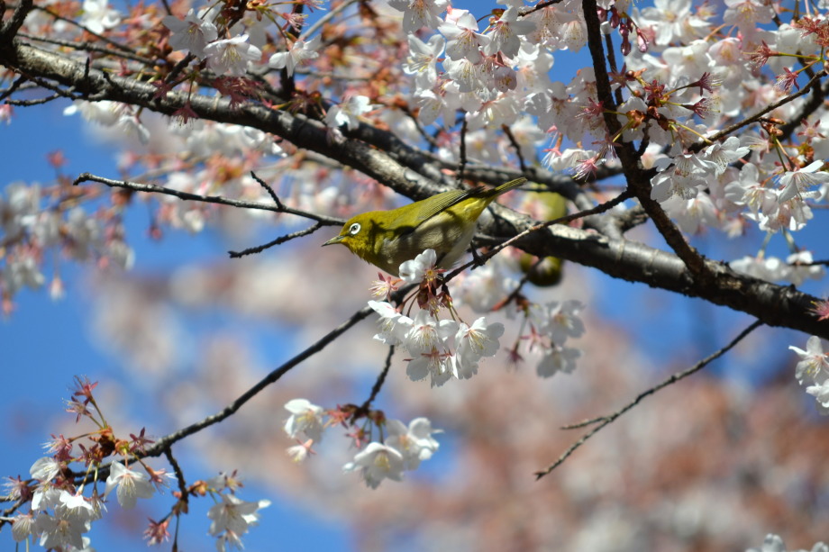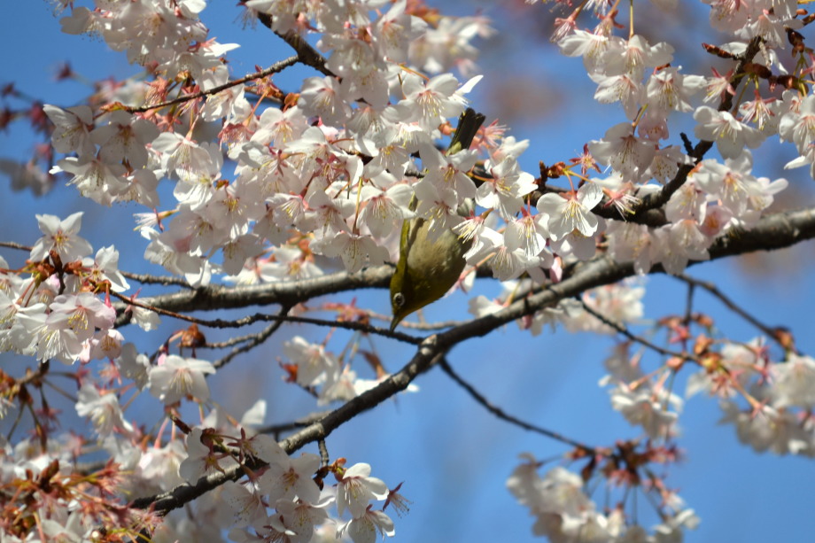 「一言」実相寺の桜の木に集まっているメジロの写真を撮りに行きました。非常にたくさんメジロが来ていて、ゆっくり 見ていると飽きない感じでした。メジロの写真を撮りましたが、動きが速く、なかなか面白い写真が撮れません でした。撮った写真を見ながら整理していると面白い写真が何枚か出来ました。