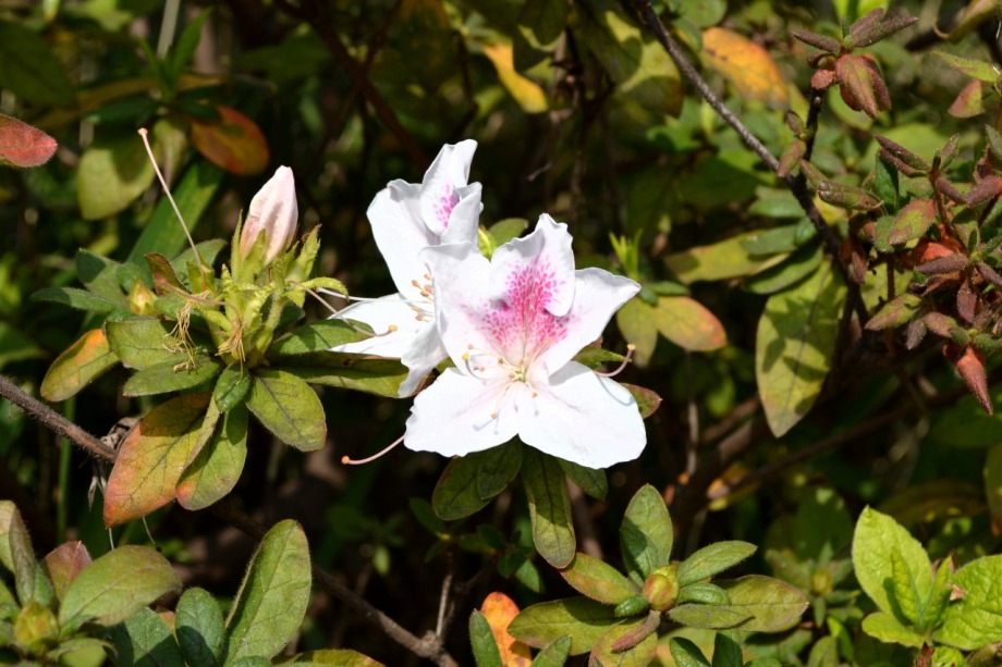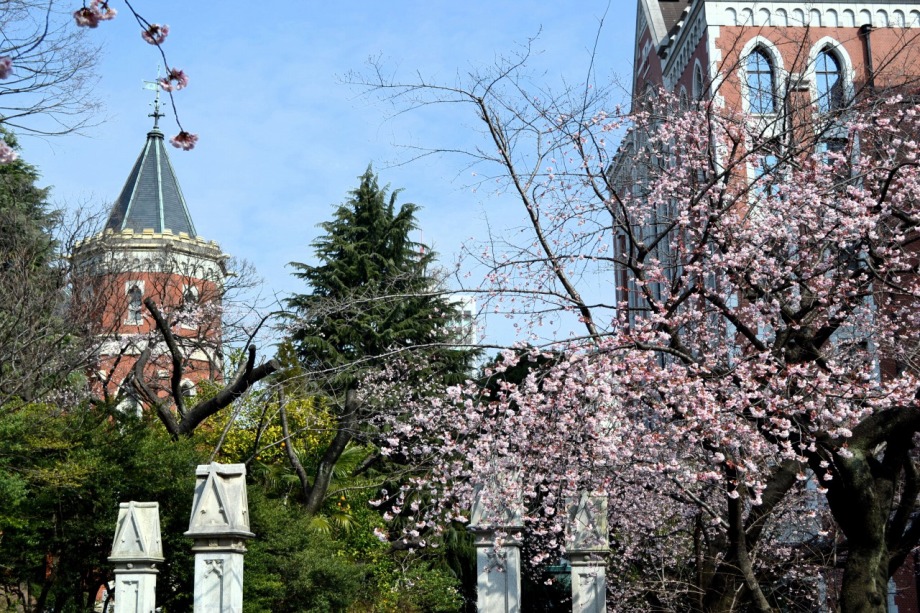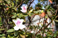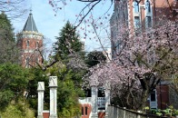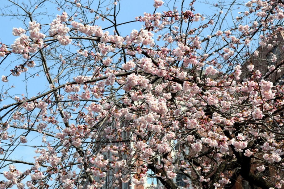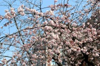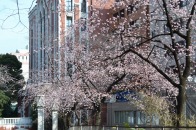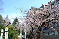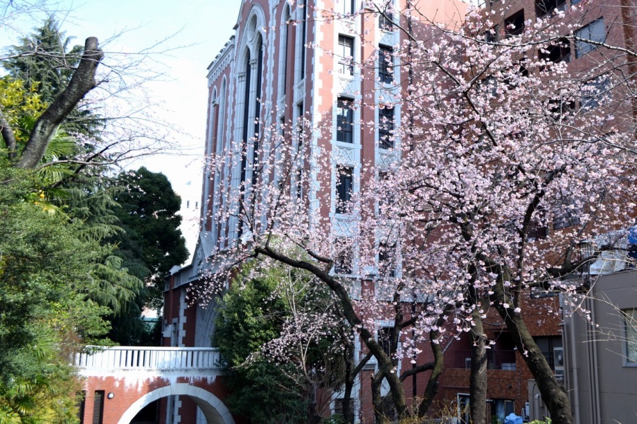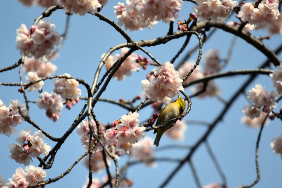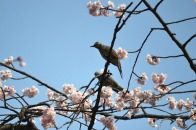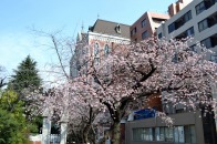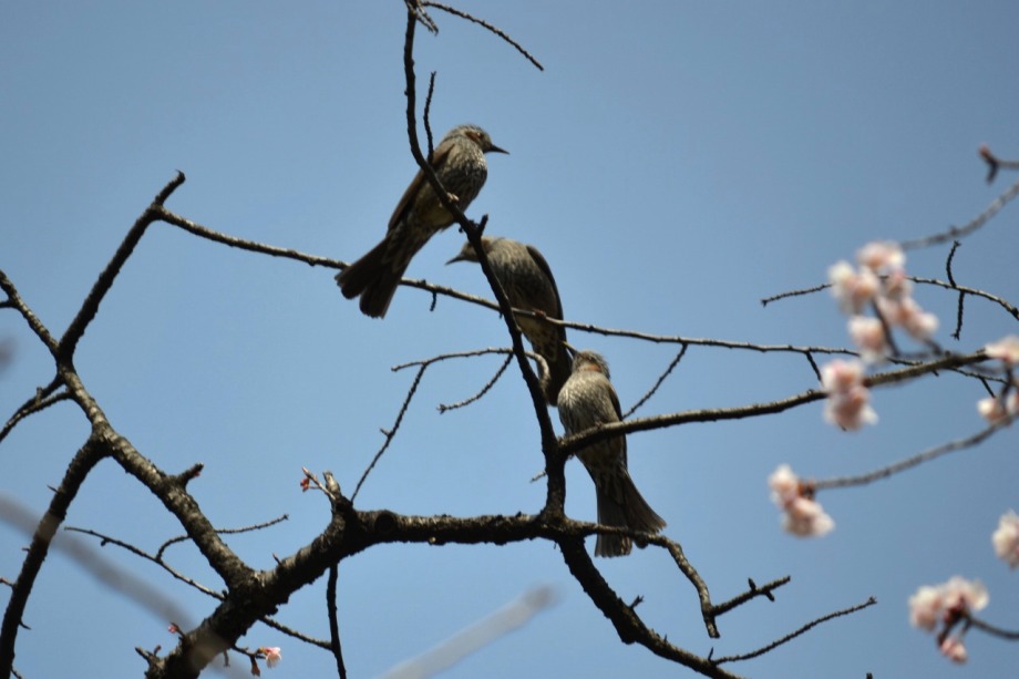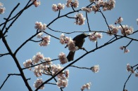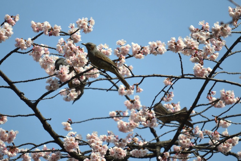 「一言」慶応大学の東門を入ったところに早咲きの桜が咲いています。花は少し小さい感じですが、木が大きいので見応えがあります。 慶応大学の校舎をバックにした風景も良いと思います。桜の木にメジロやムクドリが集まってきていました。時季外れのツツジが 咲いていました。