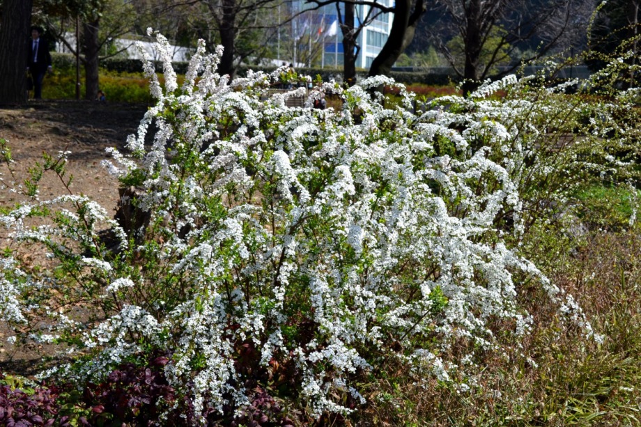 「一言」芝公園にはユキヤナギが見頃でした。東京プリンスホテルの庭にはエドヒガンザクラの大きな木が満開でした。