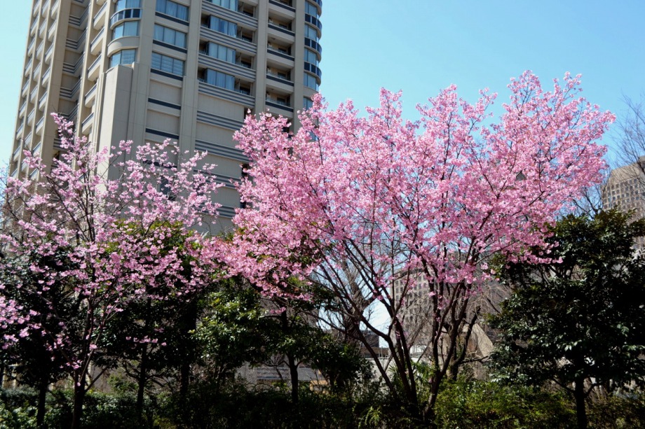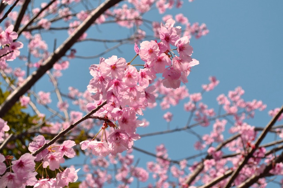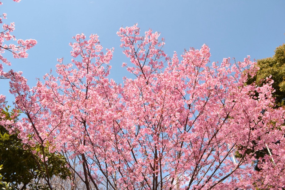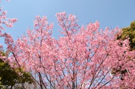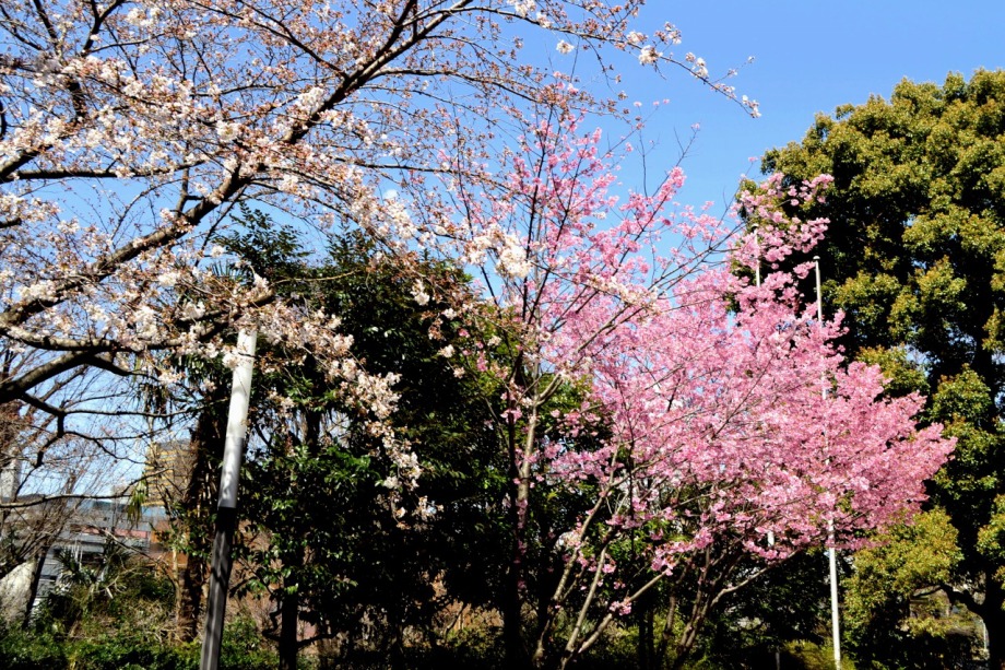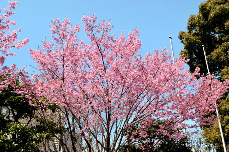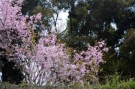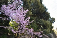 「一言」愛宕神社のお花の写真を撮りに行きました。愛宕神社の前の道にはネコヤナギがたくさん咲いていました。 愛宕神社の境内には濃いピンクの色の大きな木がいっぱい花をつけていて綺麗でした。白い花も咲いていました。 山の中腹には早咲きの桜が咲いていました。
