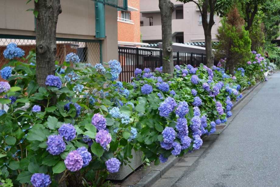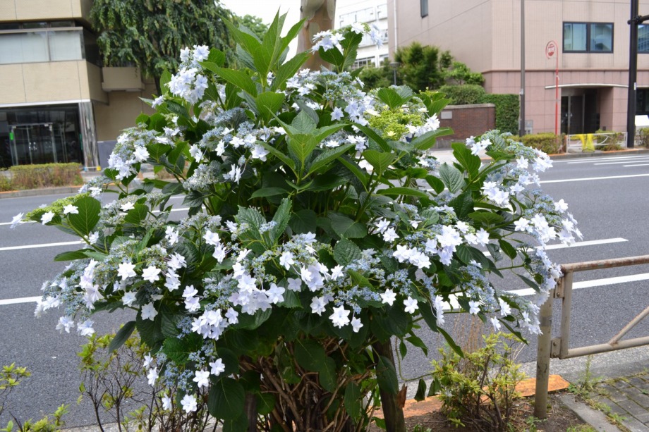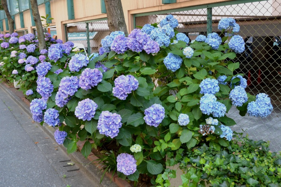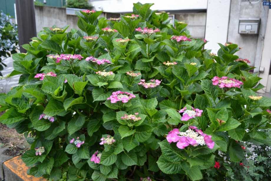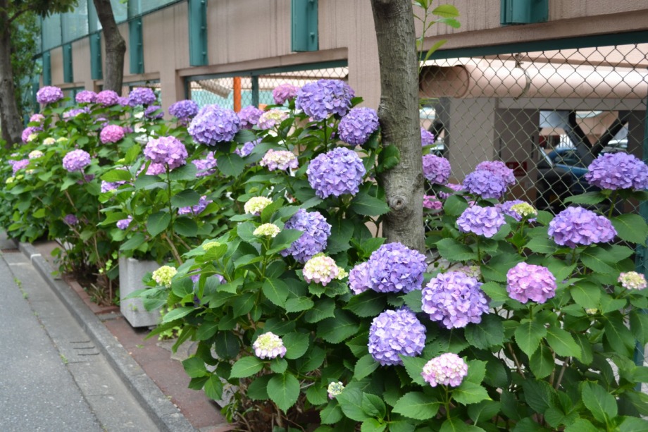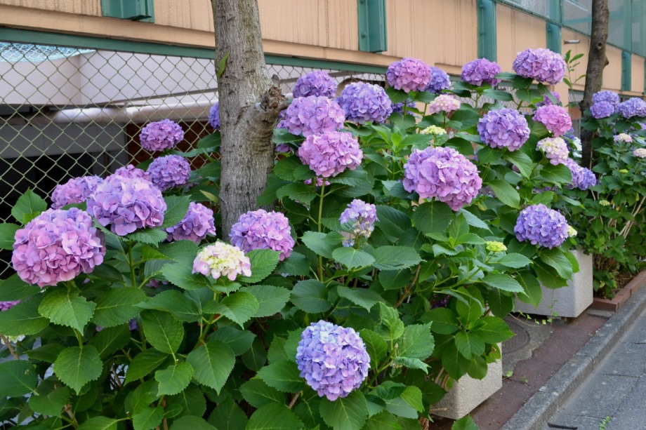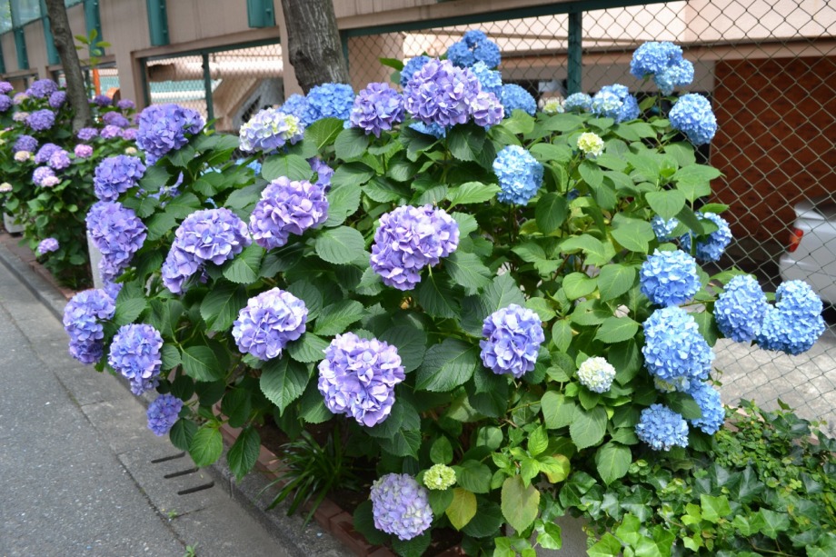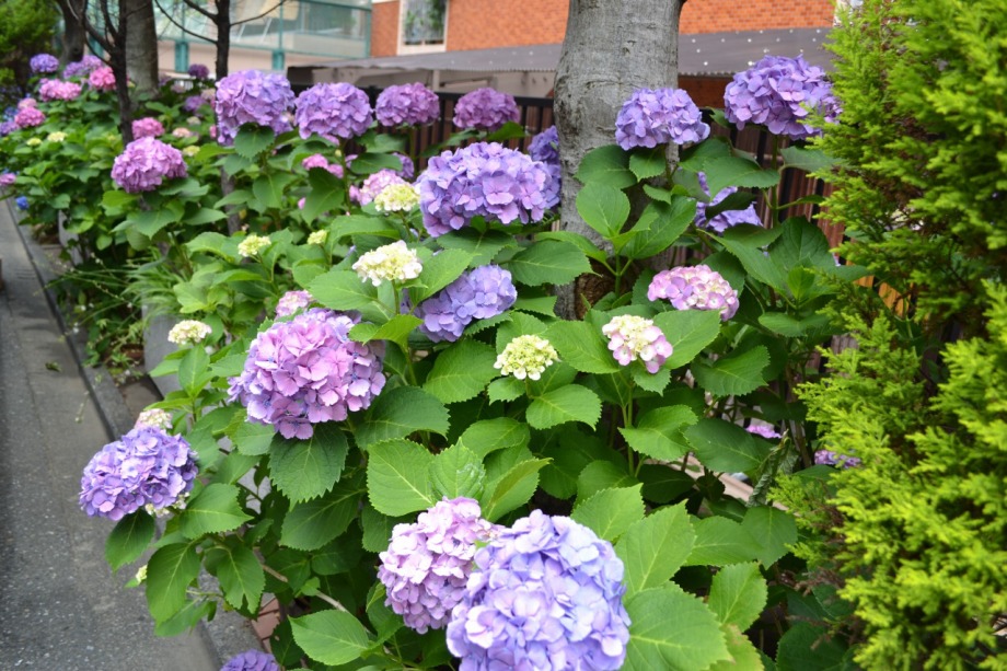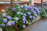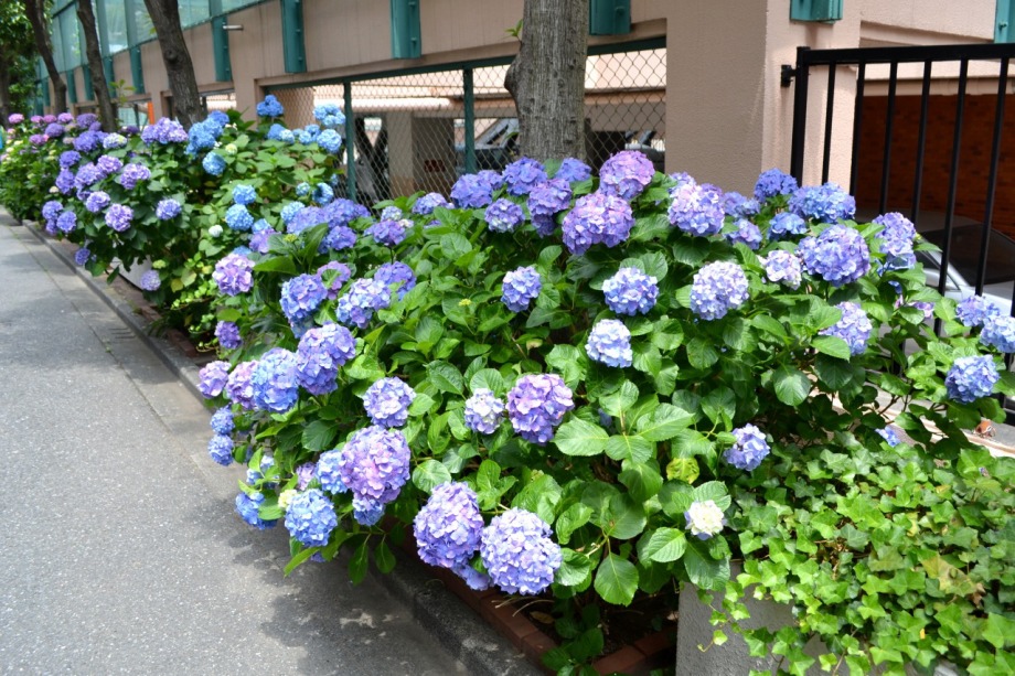 「一言」三田5丁目のマンションの横にたくさん紫陽花が咲いています。色々な色や形の花が通り沿いに今は盛りとたくさん咲いていて綺麗です。
