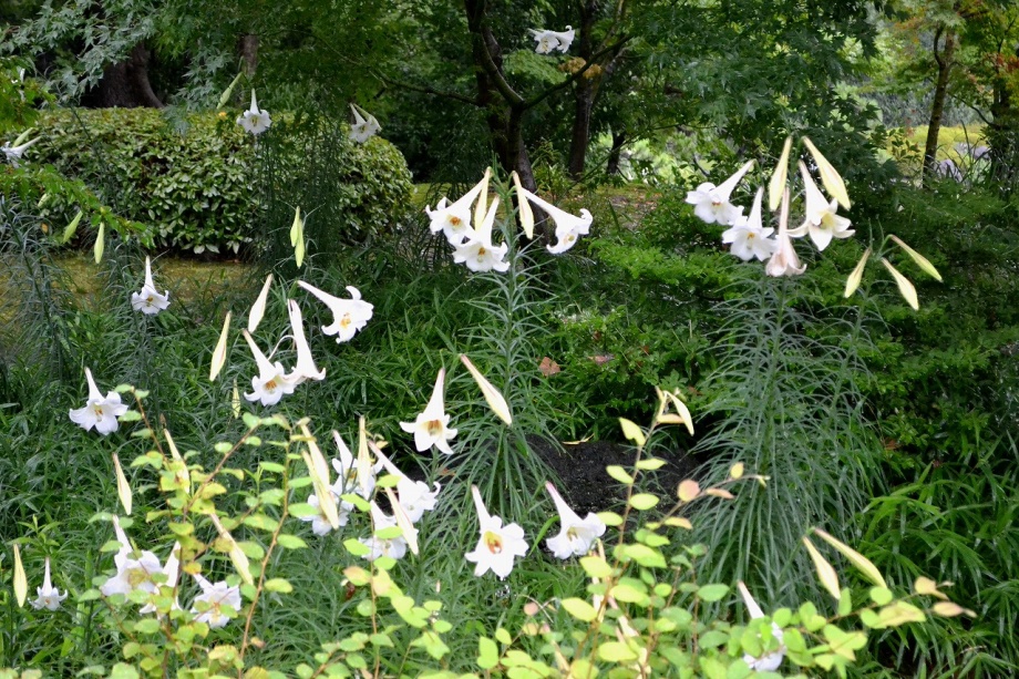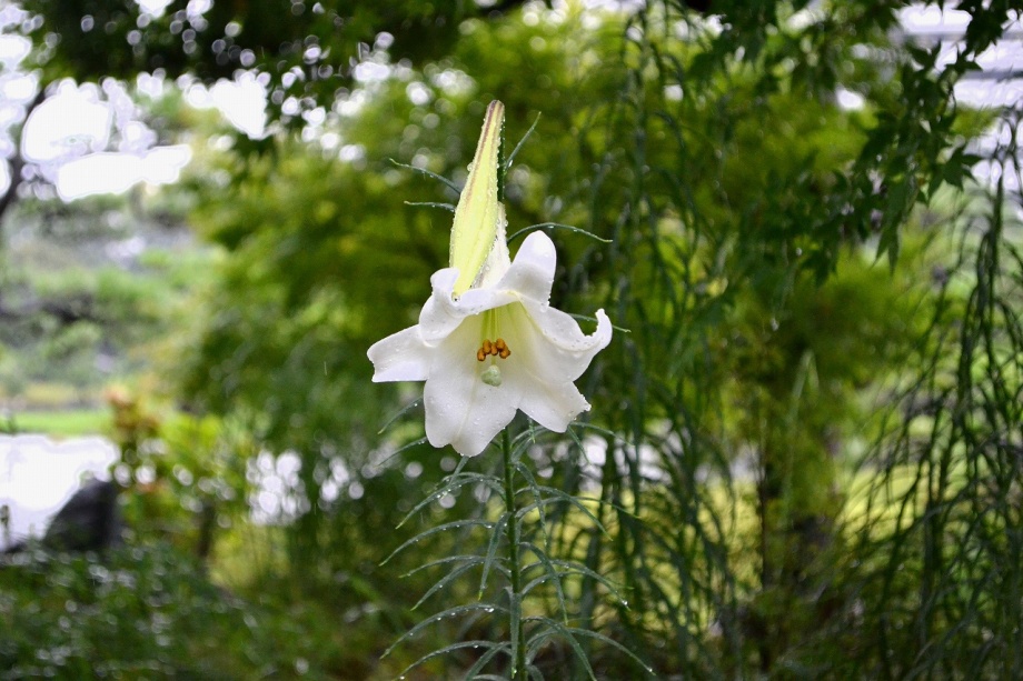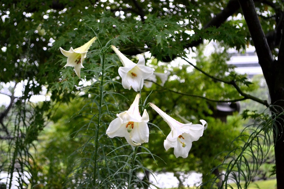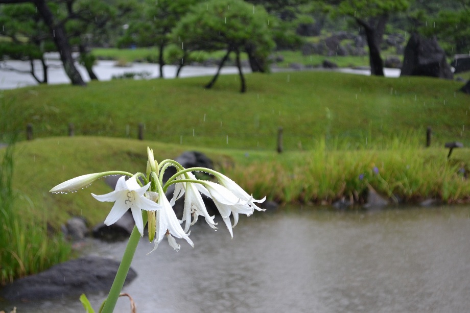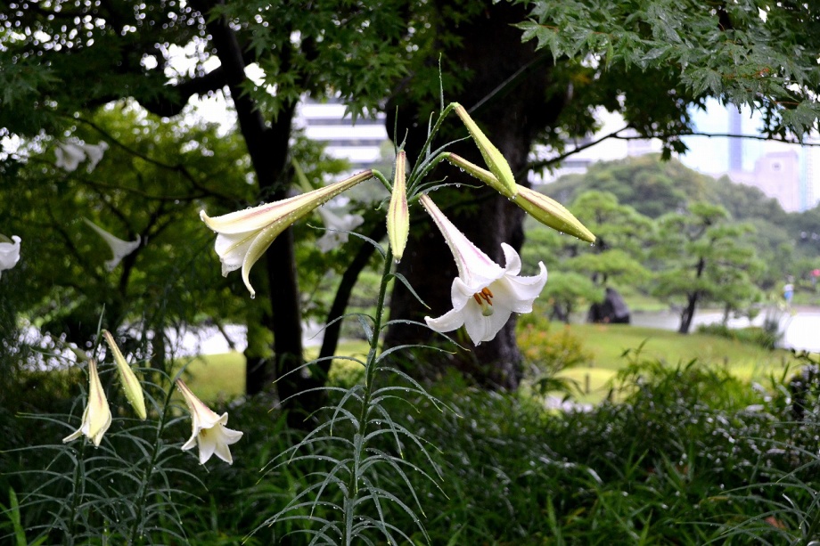 「一言」旧芝離宮恩賜庭園にタカサゴユリが咲き出したということを聞きましたので、写真を撮りに行きました。結構、たくさん花が植えられていました。 受付の人に聞くとこれから1~2週間は花が咲くということでした。非常に暑い時期に、白い花がたくさん咲く感じで、夕立の後でしたが綺麗でした。 受付の人に聞くと、タカサゴユリは8月中頃までは咲くとのことでした。