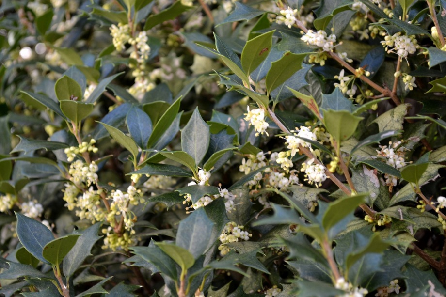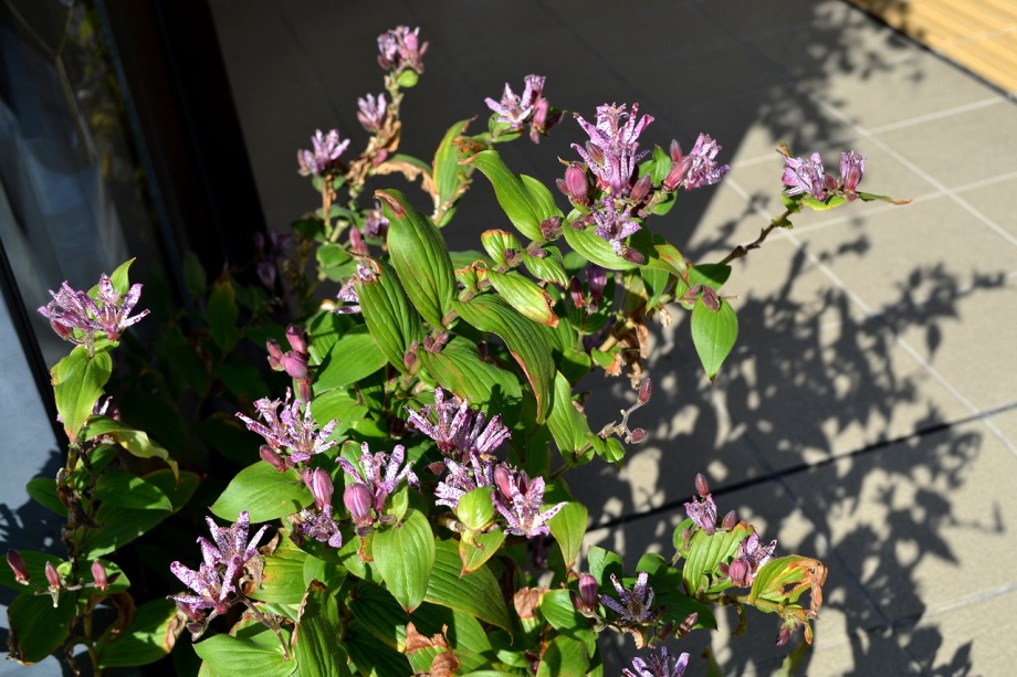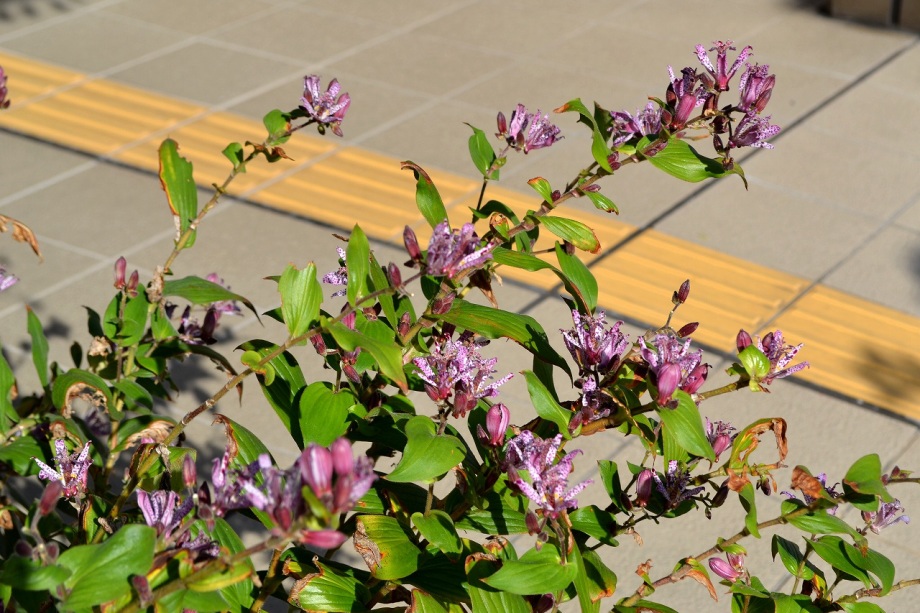 にはヒイラギ?の白い小さな花が咲いていました。豊岡児童館の前にはホトトギスが咲いていました。