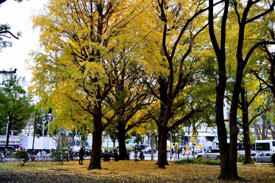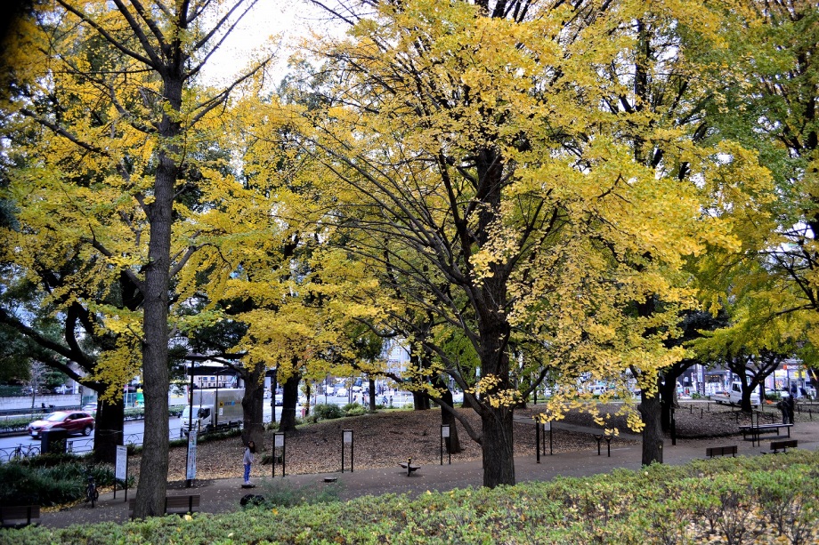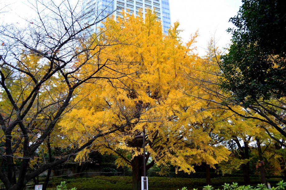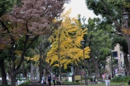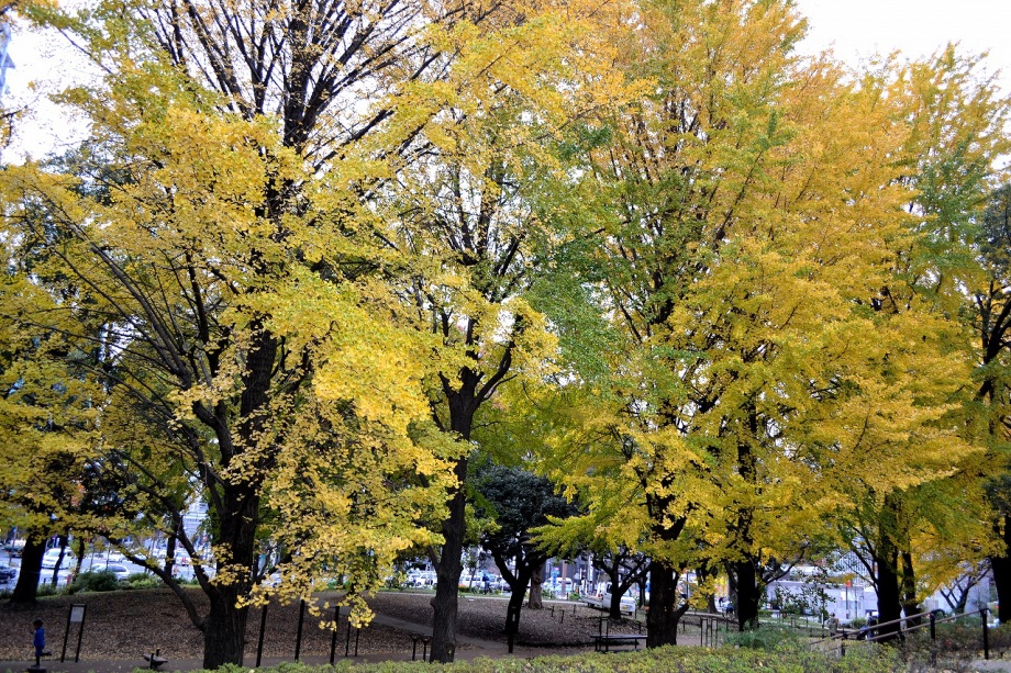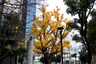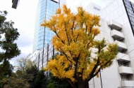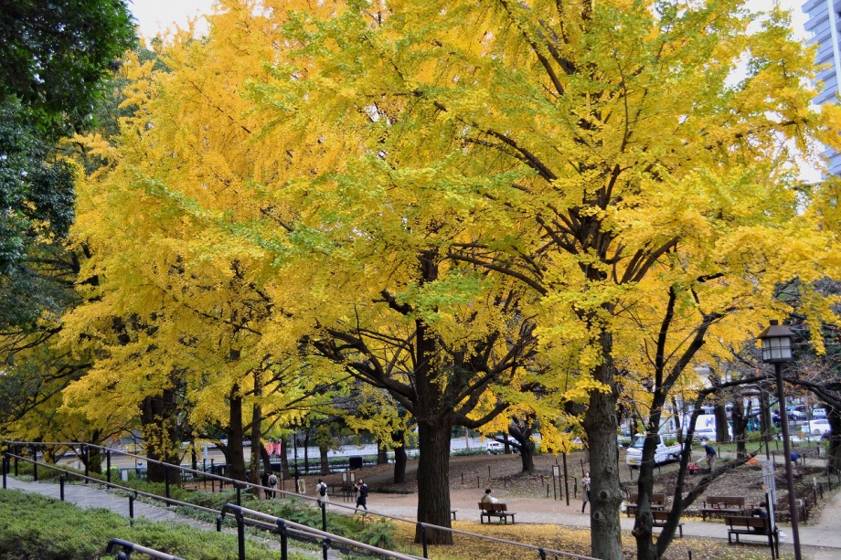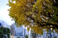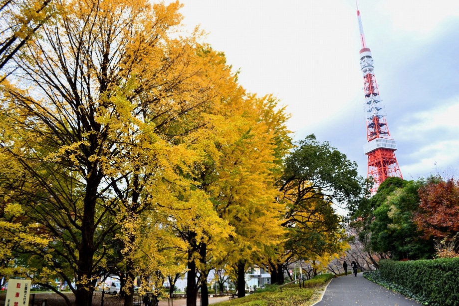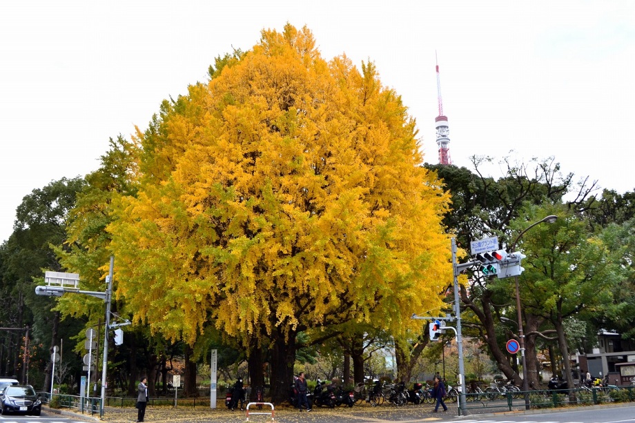 「一言」芝公園のイチョウが黄色くなってきました。公園の横の非常に大きなイチョウの木も良い色になっています。足元も、イチョウの葉が落ちていて、 黄色な絨毯のようになっています。着物を着た若い女性が集まって、イチョウの木を背景に写真を撮っていました。