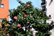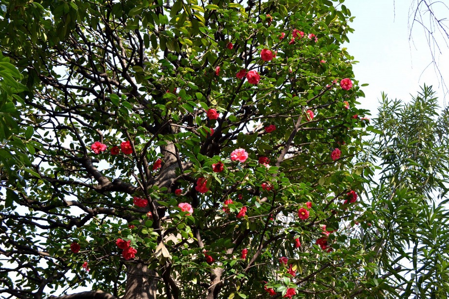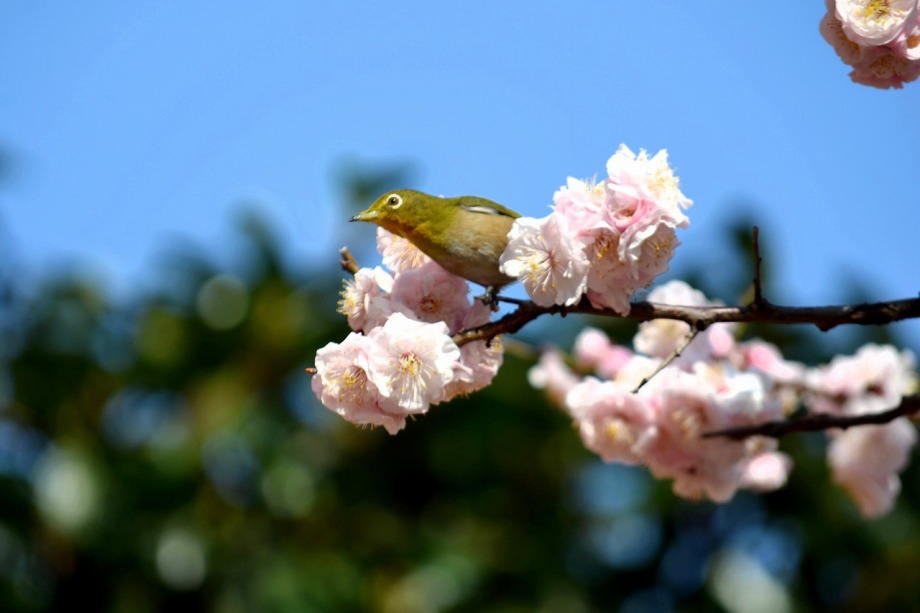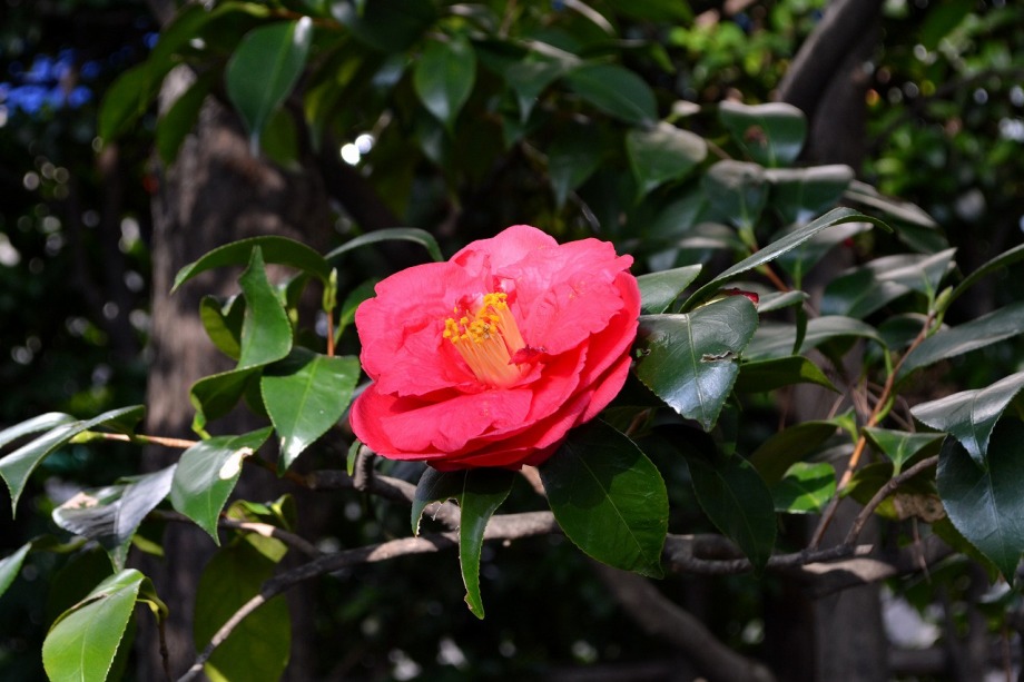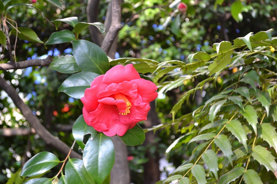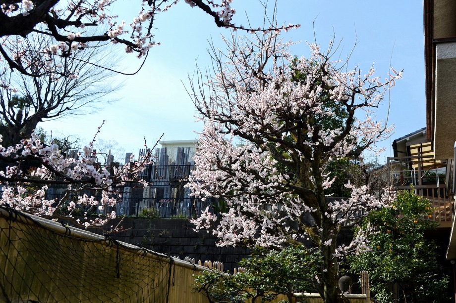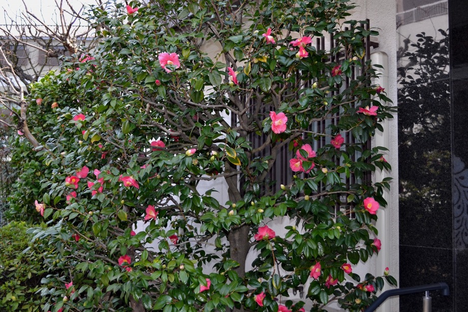 綺麗な椿も咲いていました。三田5丁目のバス停の近くの梅が満開でした。2羽のメジロが来て、花をついばんでいました。