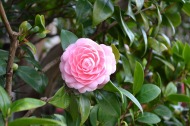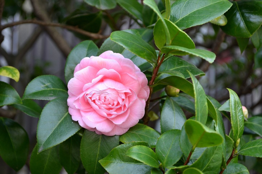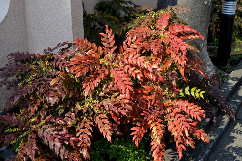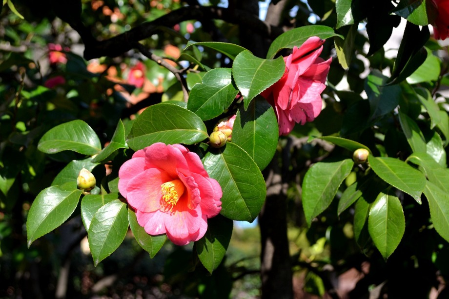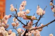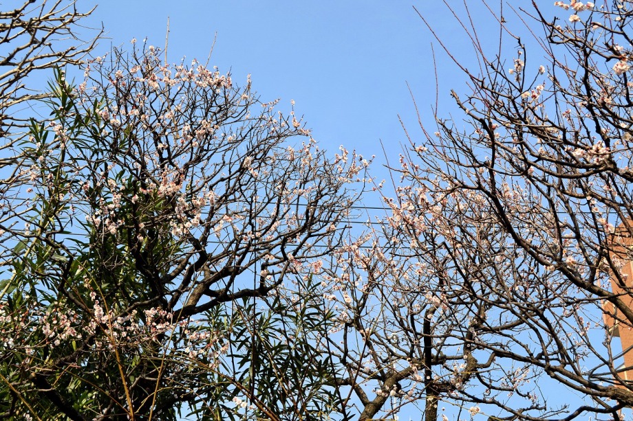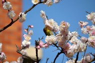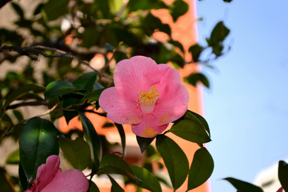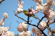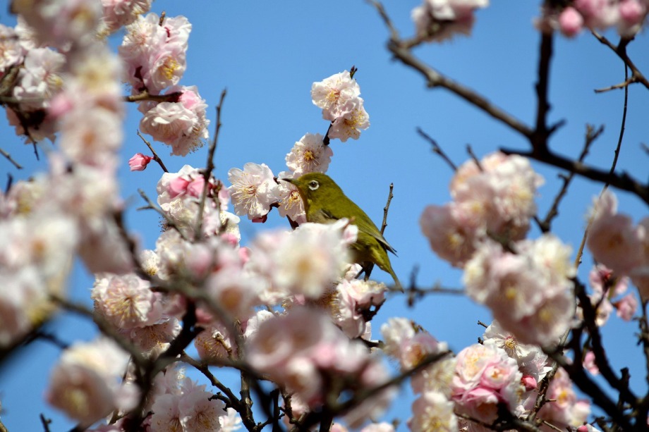 綺麗な椿も咲いていました。三田5丁目のバス停の近くの梅が満開でした。2羽のメジロが来て、花をついばんでいました。