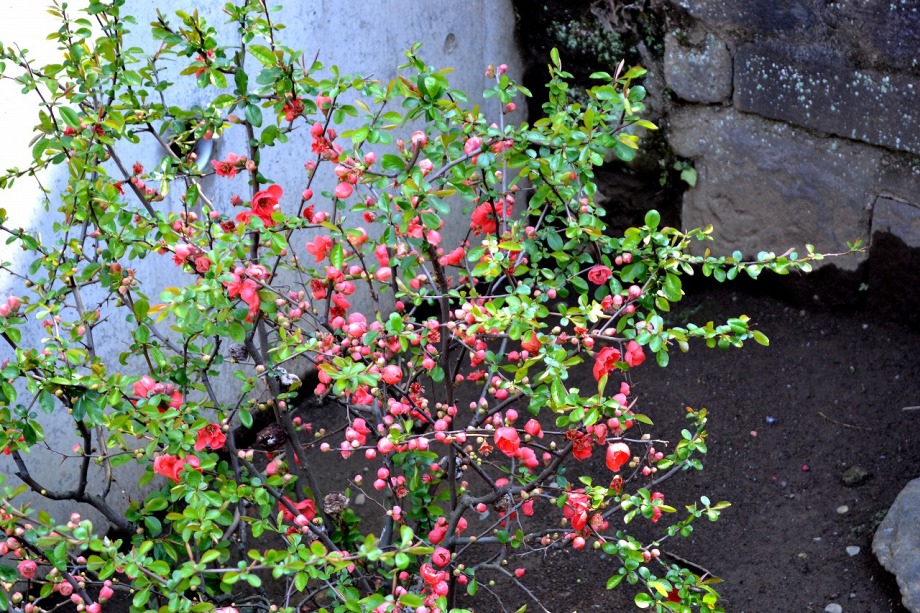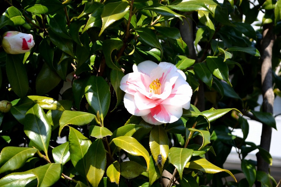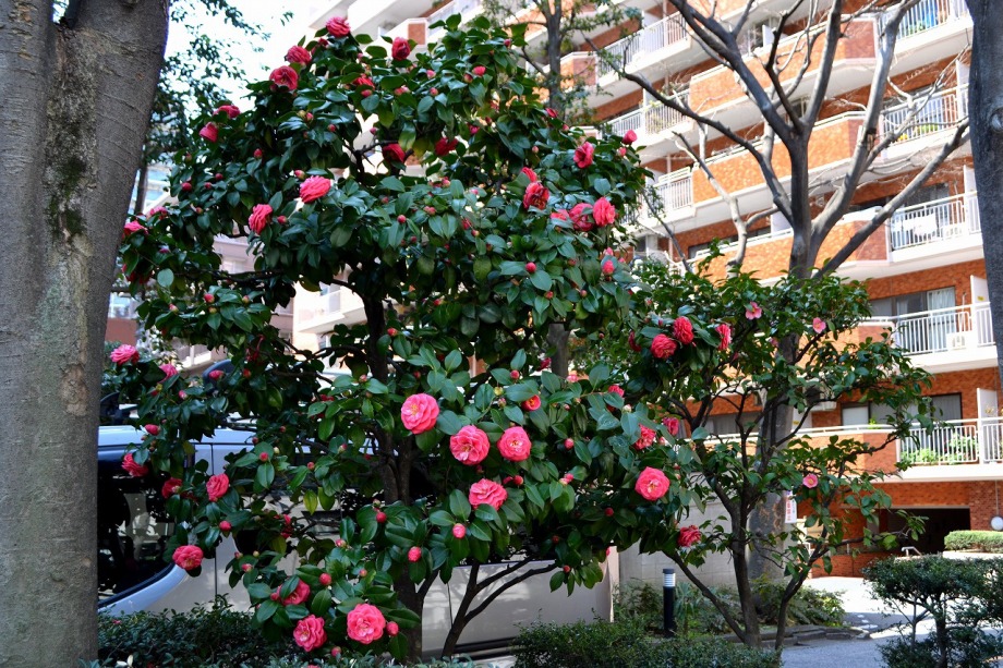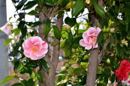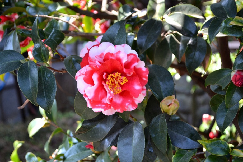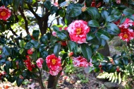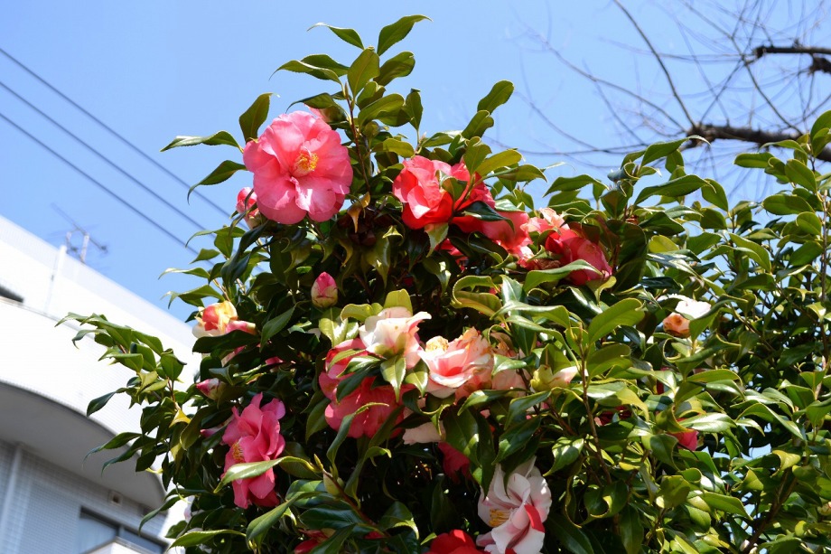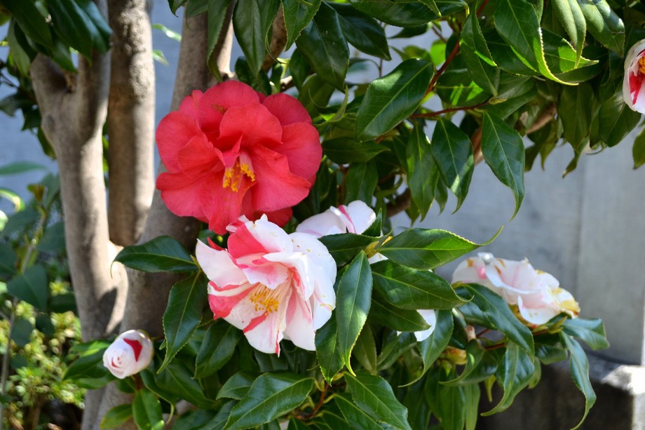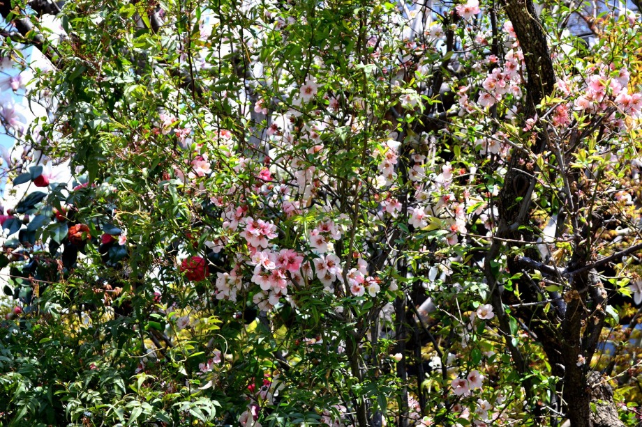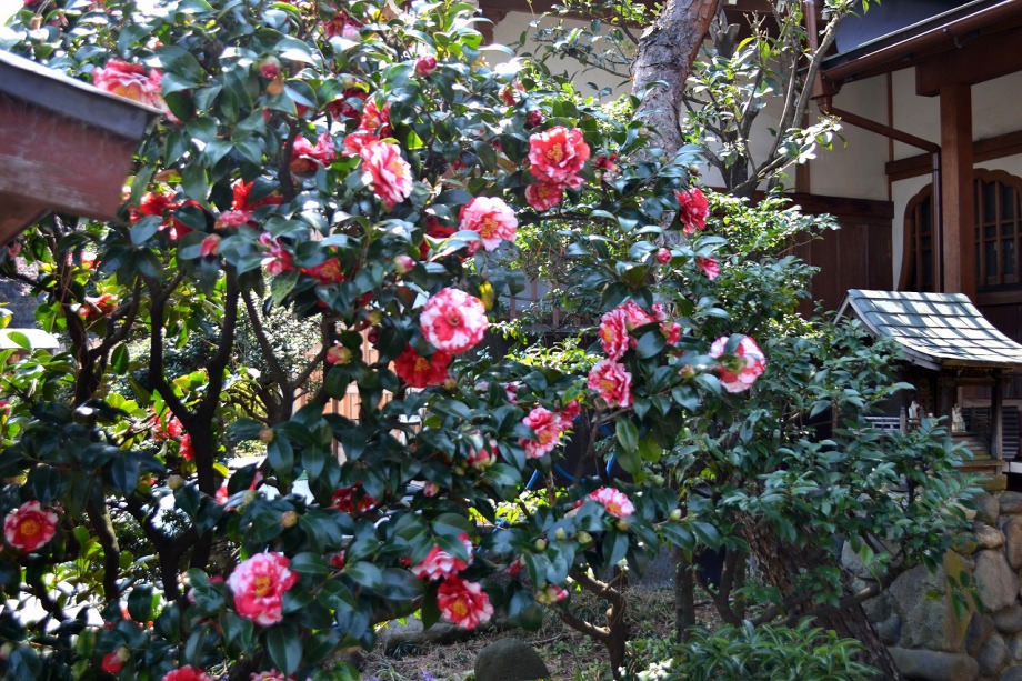 杏の花や桃の花も咲き出していました。色々な模様の花が咲いている椿の木がありました。玉鳳寺の椿も満開という感じです。