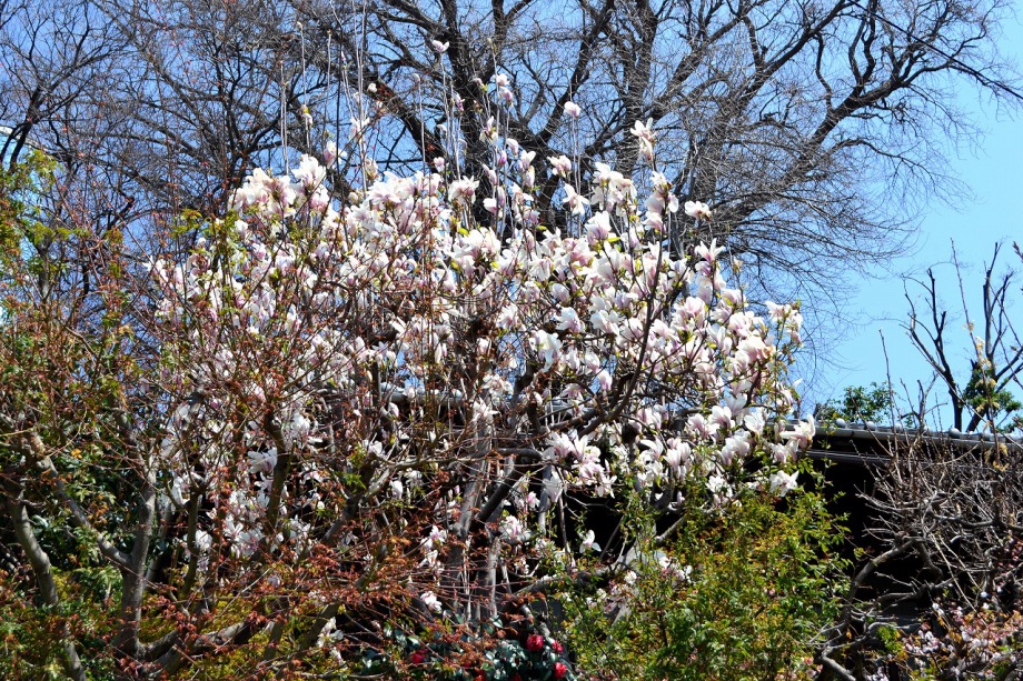 花が咲いていました。三田2丁目の交差点の近くの大島桜も咲いていましたが、枝が大きく切られて寂しそうでした。民家のモクレン