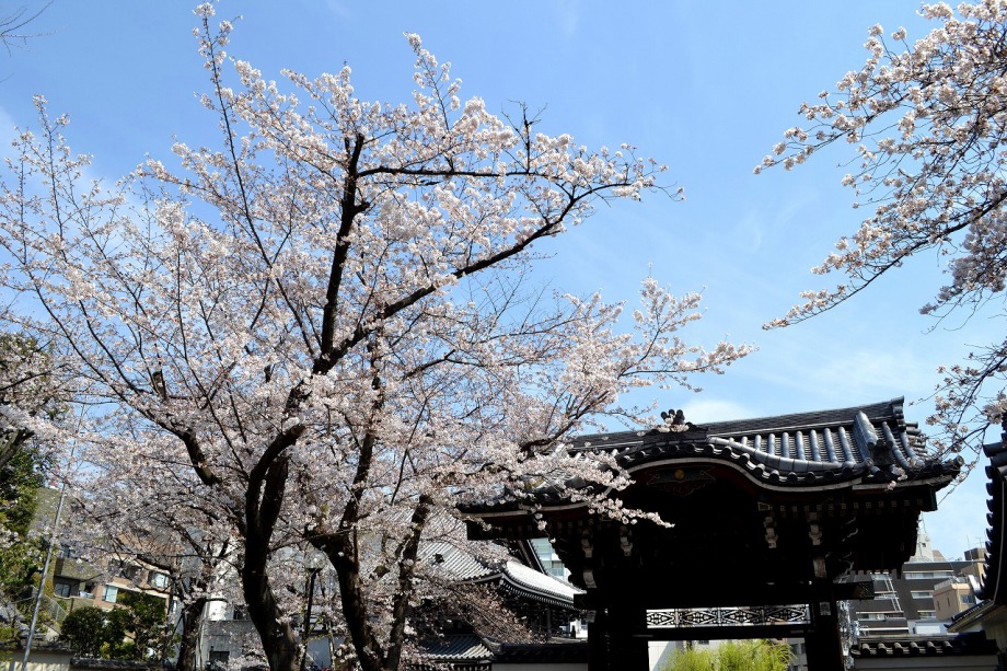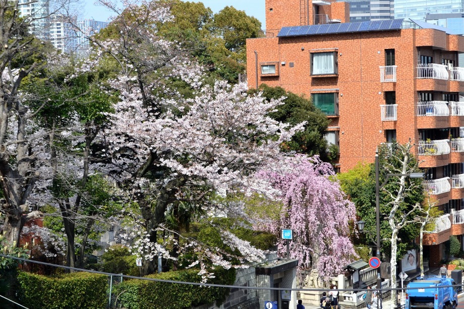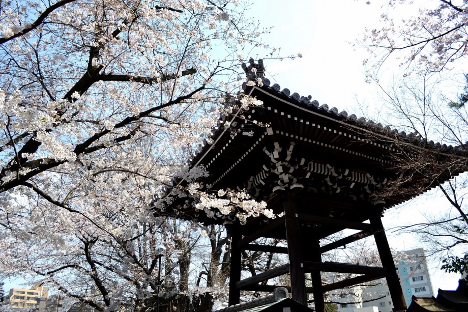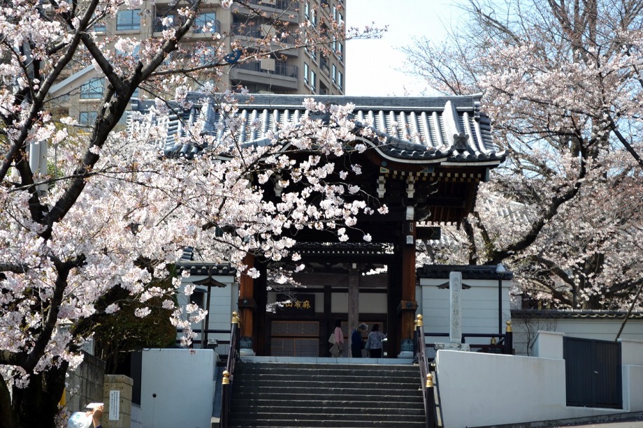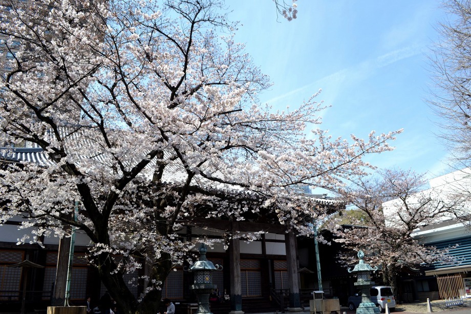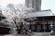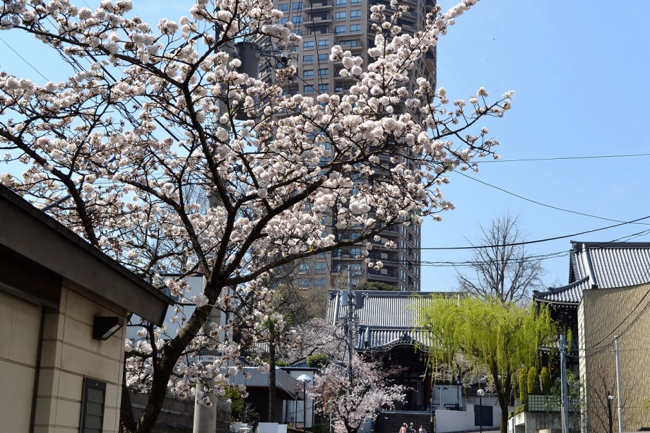 「一言」青山、赤坂地域の桜を見に行きました。行く途中で善福寺の桜が広い境内に咲いていました。桜の花を見に来る人が少なく、