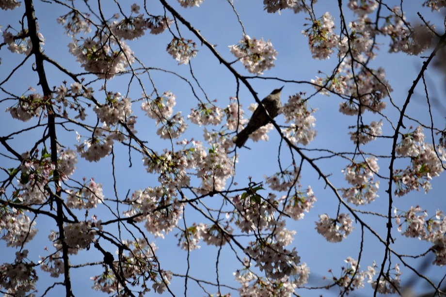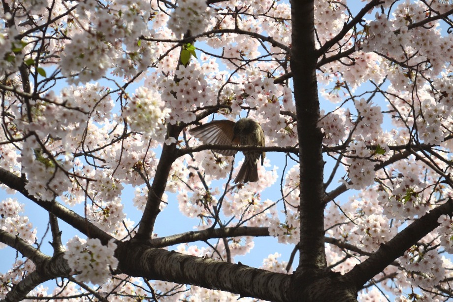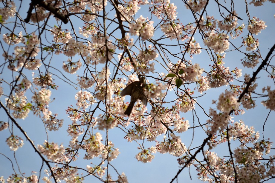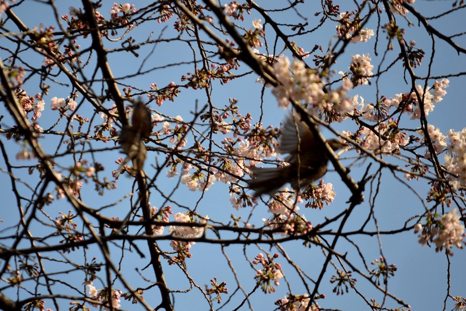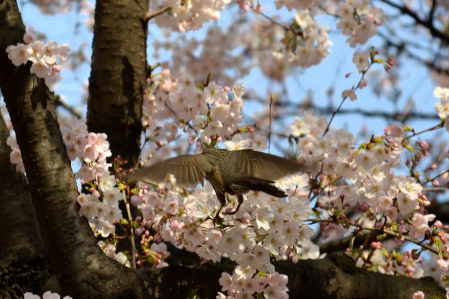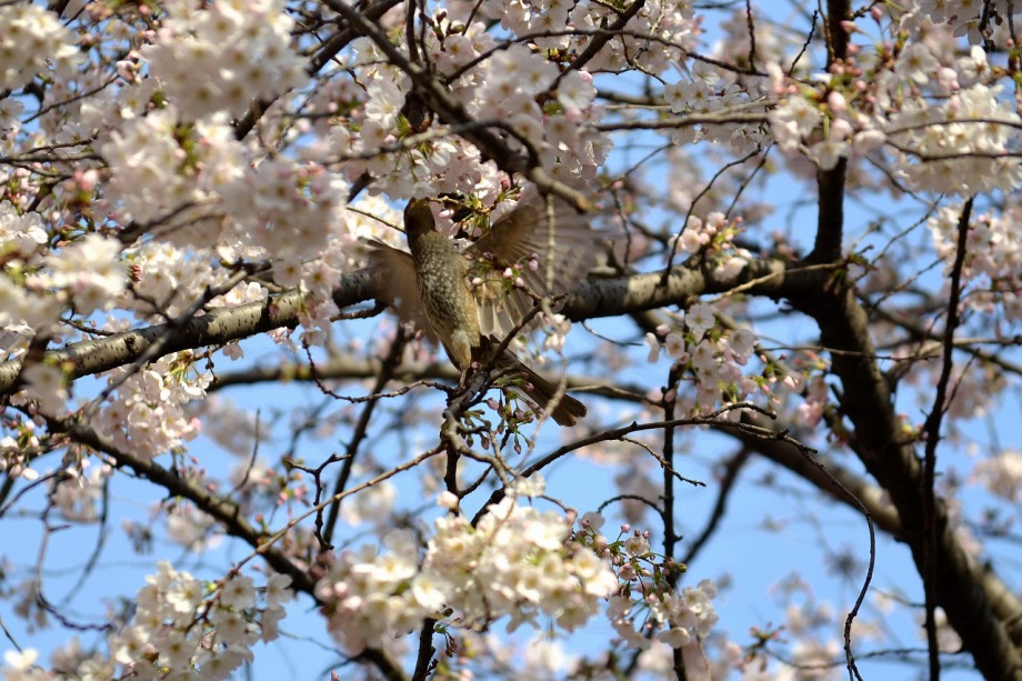 「一言」三田5丁目のバス停の近くに桜の綺麗なところがありますので、桜の花が咲く状況と飛んでくる鳥の写真を撮りました。