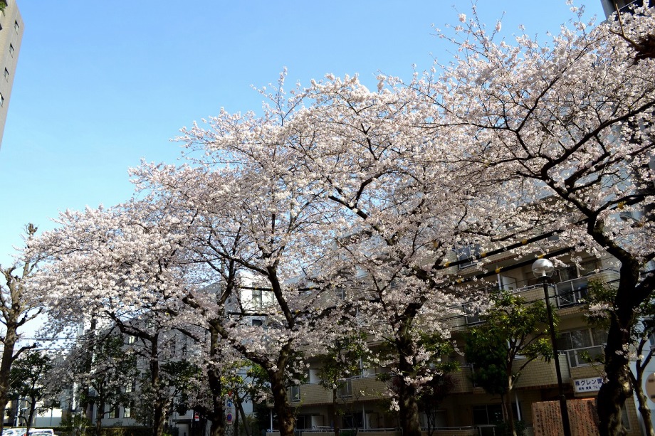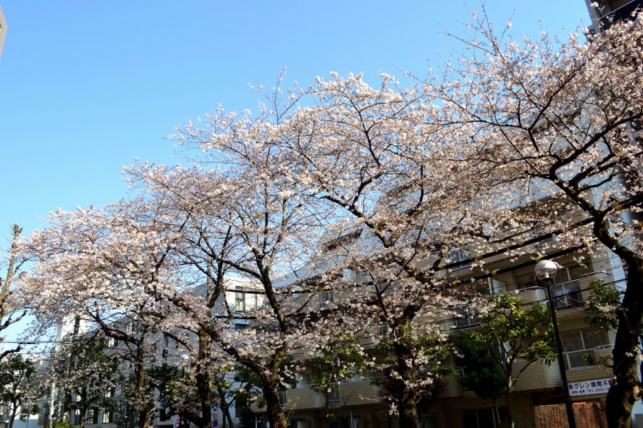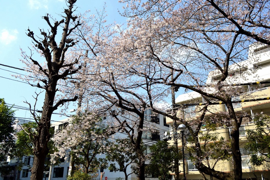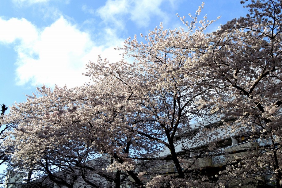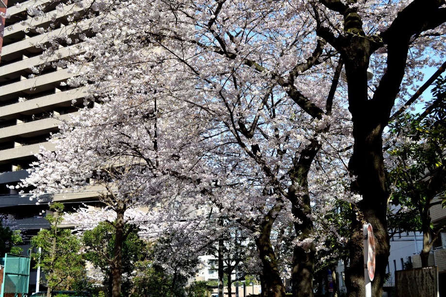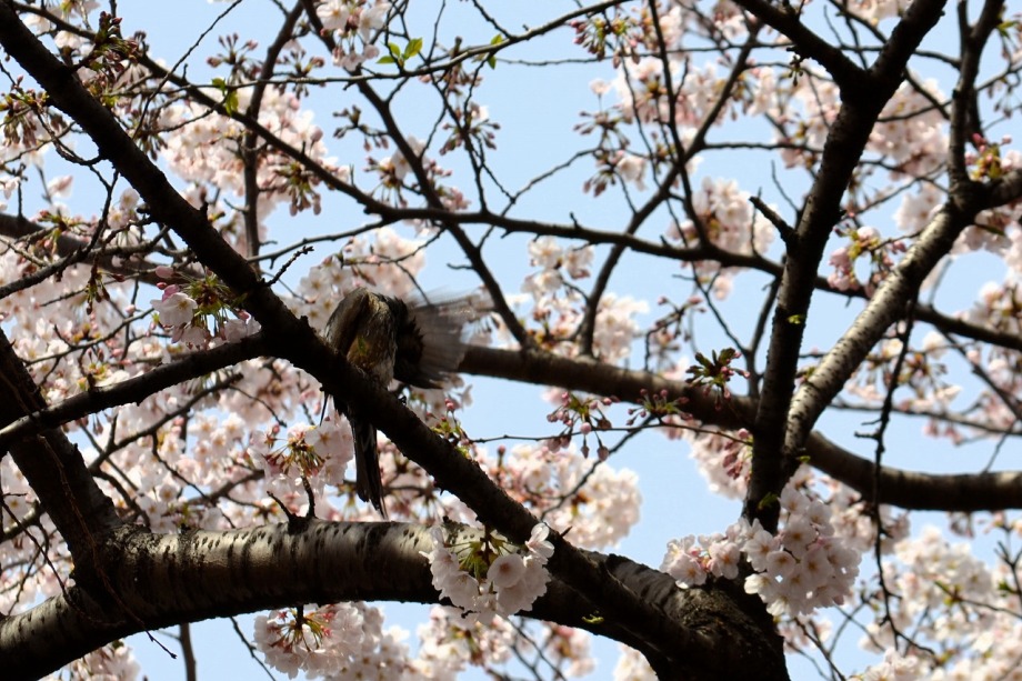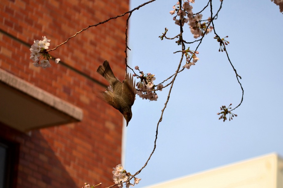 「一言」三田5丁目のバス停の近くに桜の綺麗なところがありますので、桜の花が咲く状況と飛んでくる鳥の写真を撮りました。