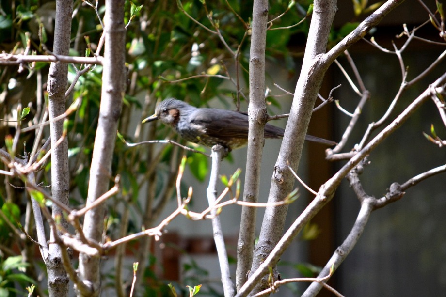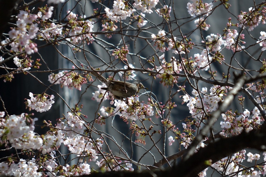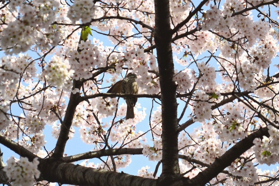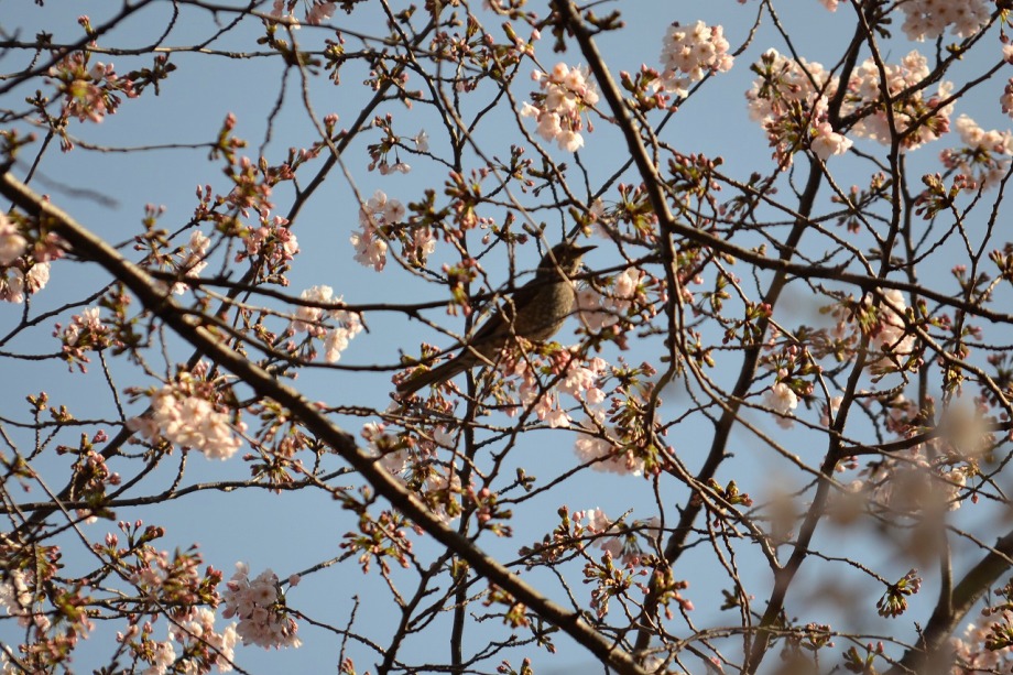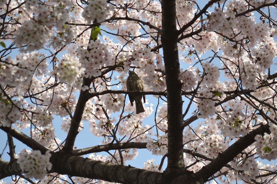 ヒヨドリが多く飛んできますが、桜の花の影になり、鳥の写真は暗く、綺麗な写真が撮れませんでしたが、鳥の習性などが