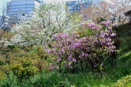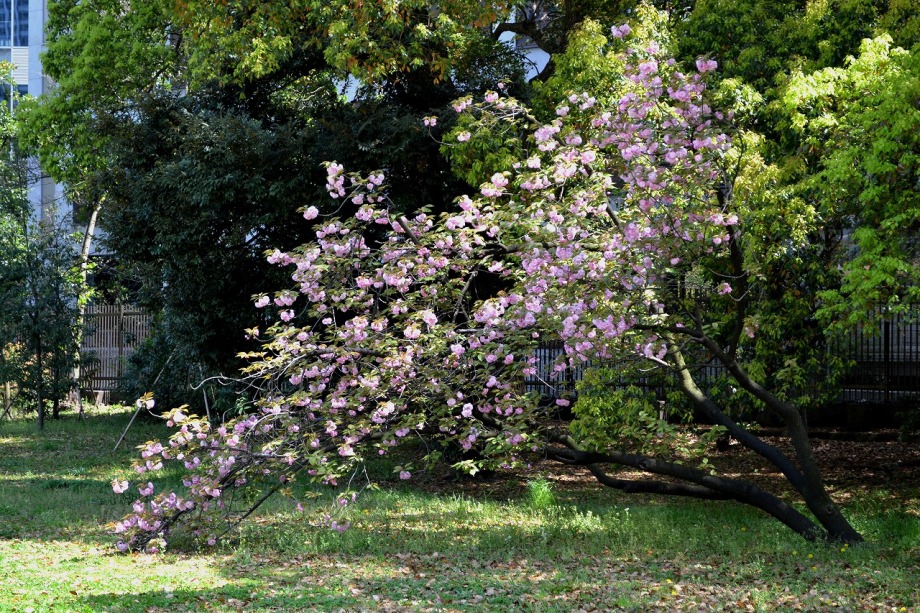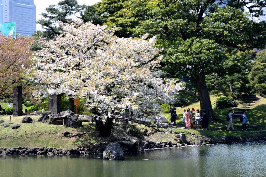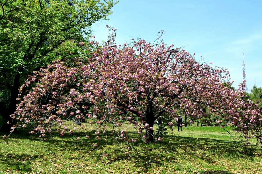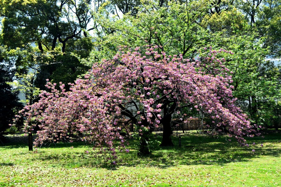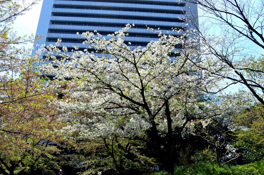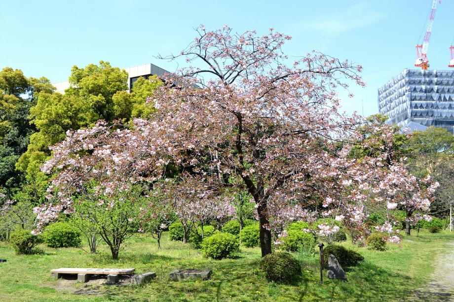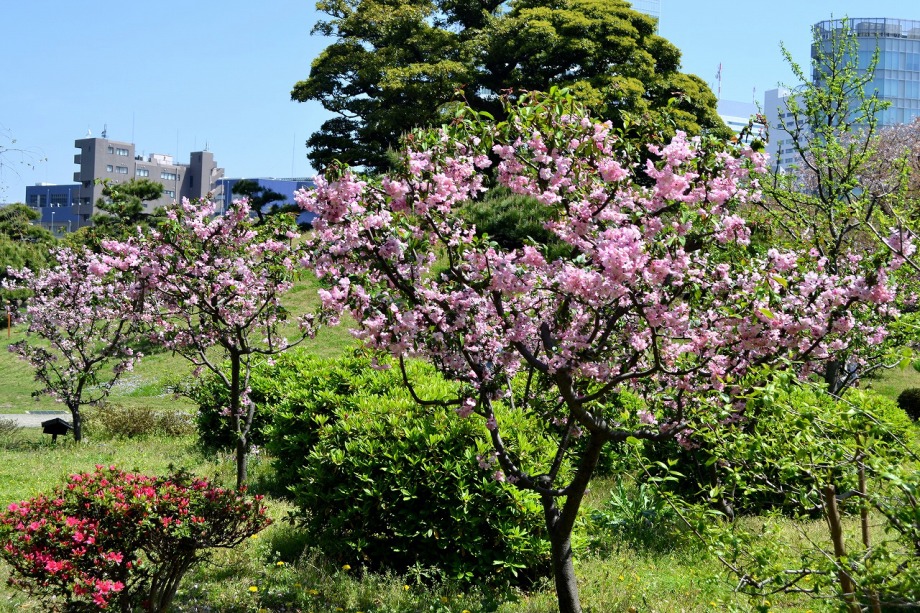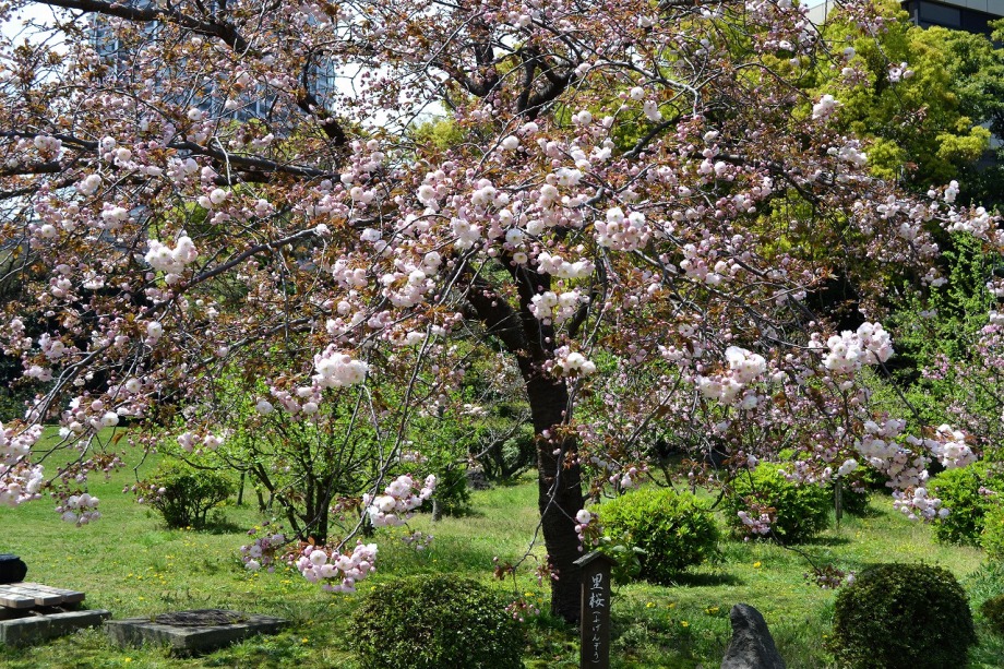 「一言」旧離宮には色々なサトザクラがあり、見頃です。関山というサトザクラは濃いピンク色の花が咲きますが、もう少しすると 満開になるという感じでした。御衣黄は黄緑色の花が咲きますが、満開でした。白い花が咲くフゲンゾウというサトザクラ も満開でした。はたくさん植えられている花海棠も満開でした。ツツジも咲き始めていました。鳥もたくさん来ており、芝を 突いていました。