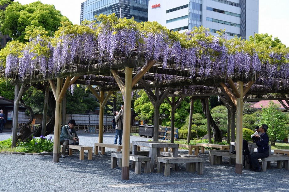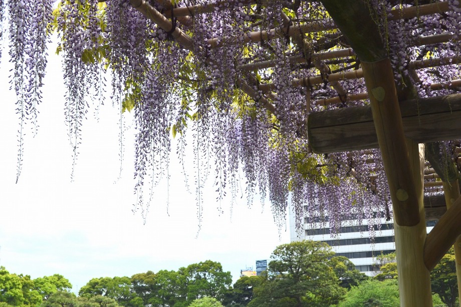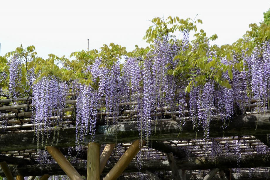 「一言」旧芝離宮に行くと、入った直ぐのところにある藤棚に藤の花が咲いていました。藤の花の房が大きくなっていて綺麗でした。