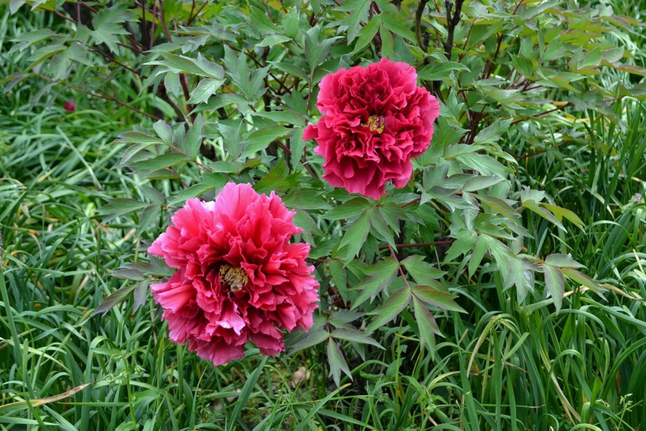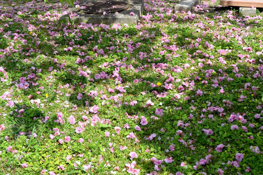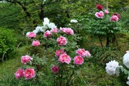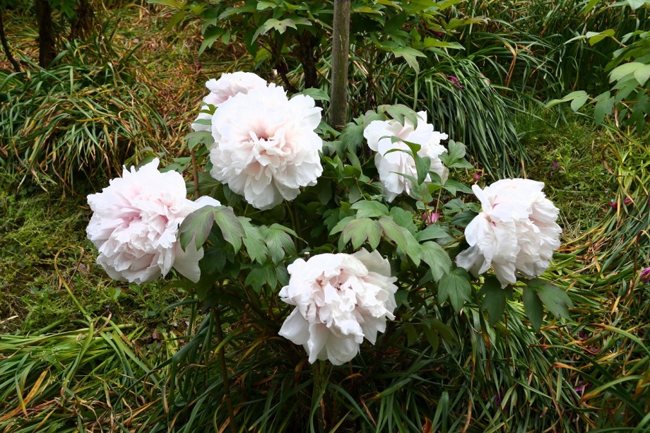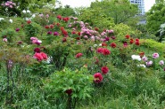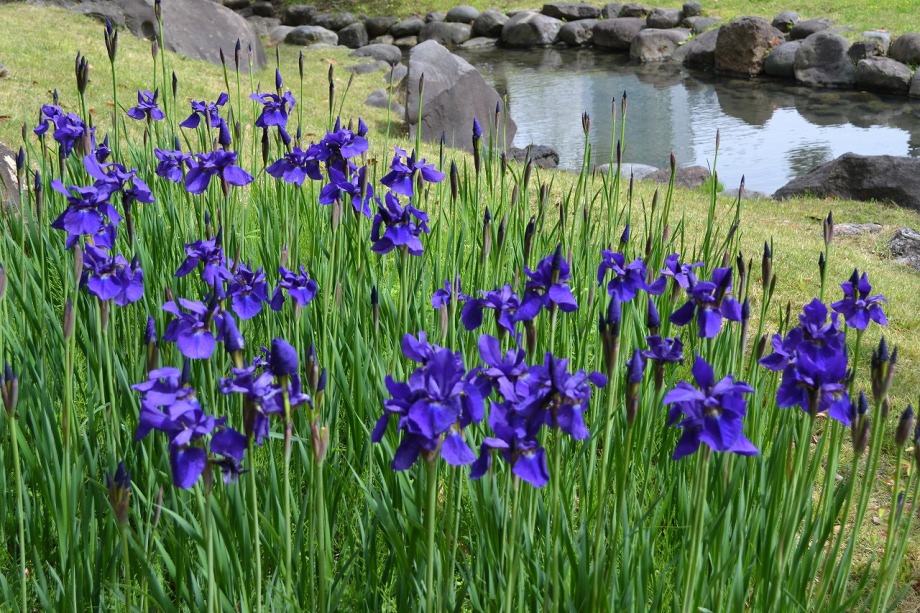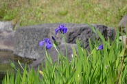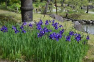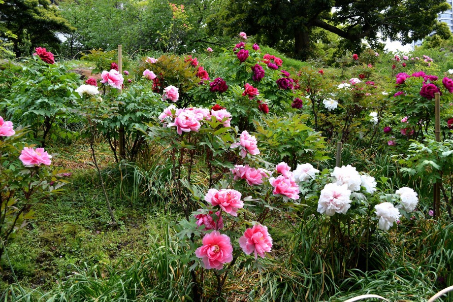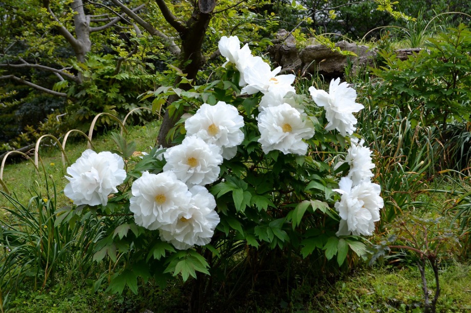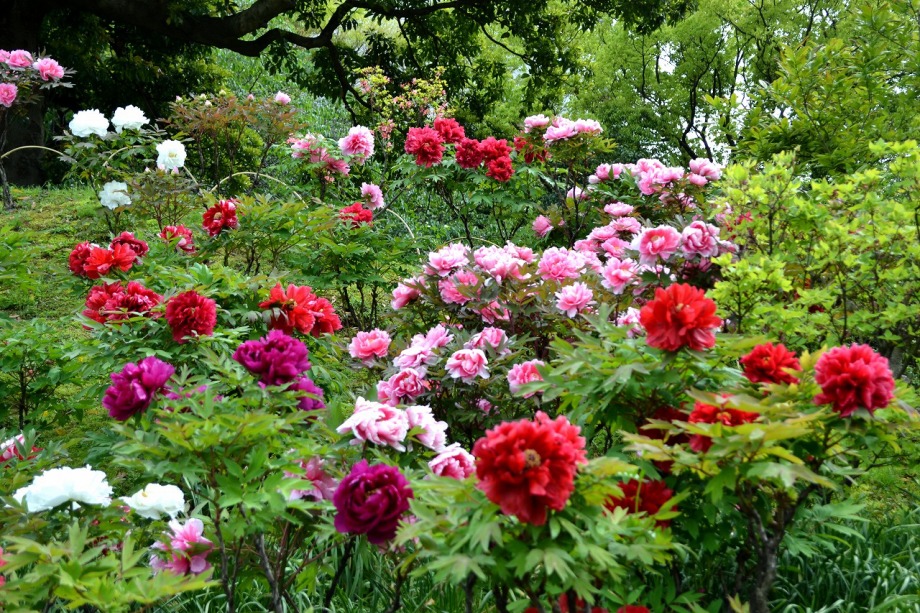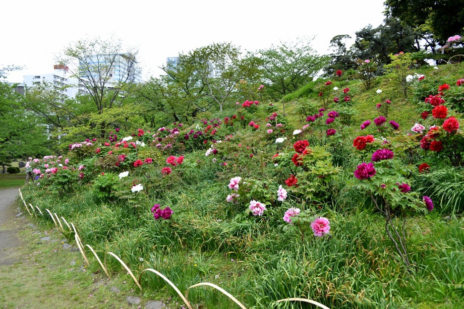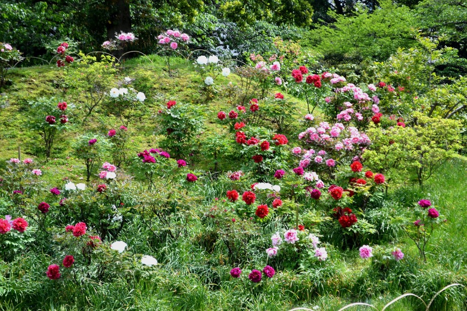 池の横にはアヤメが咲いていました。庭園の奥には牡丹の花が満開で非常に綺麗でした。ここの牡丹は小高い丘の中腹 に植えられており、色とりどりの大きな花がたくさん咲いていて迫力がありました。ボタン桜の花も散りかけていましたが、 まだ花が残っていました。地面に散ったボタン桜の花も花が房ごと散っていたので、綺麗でした。