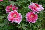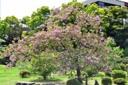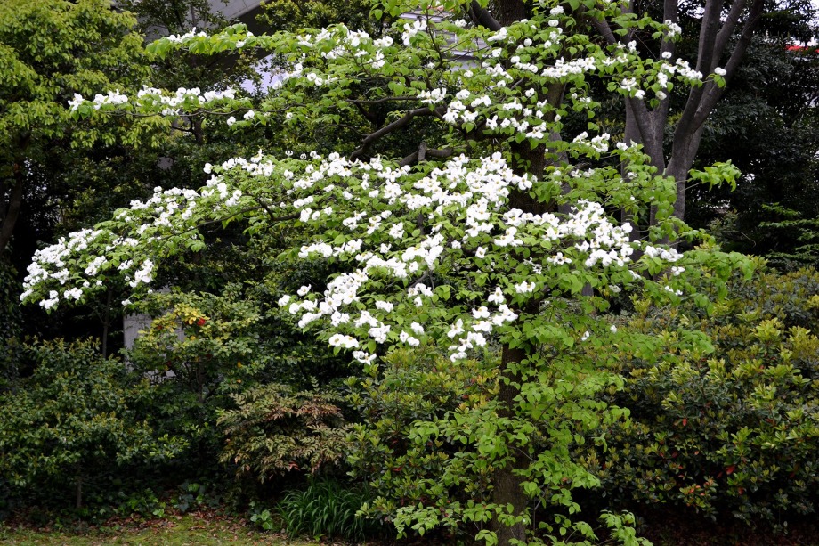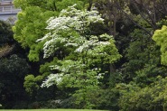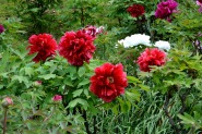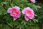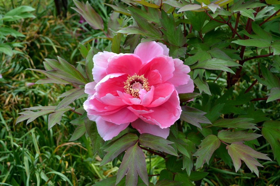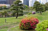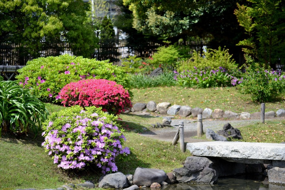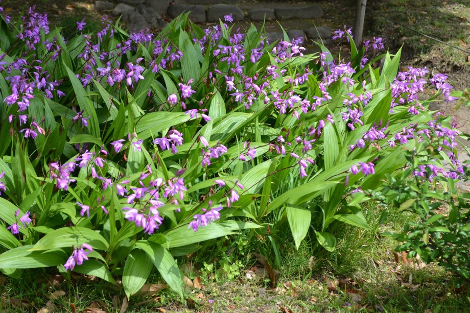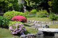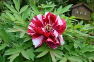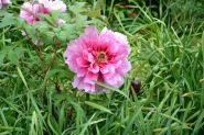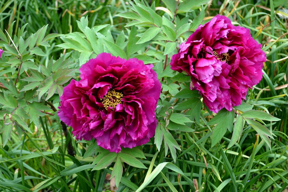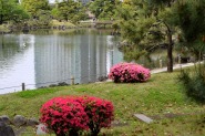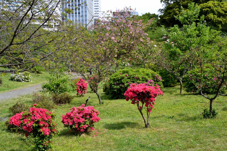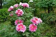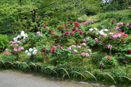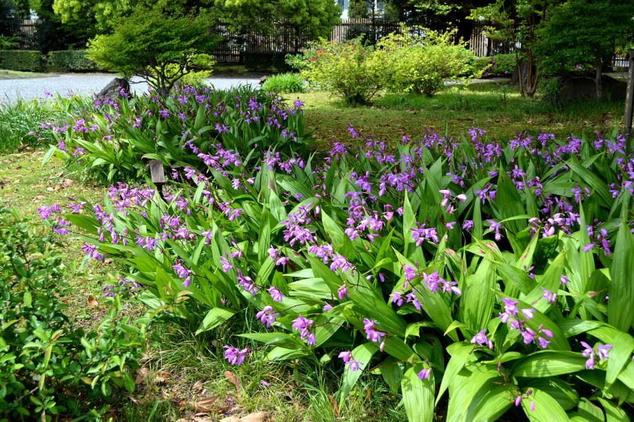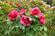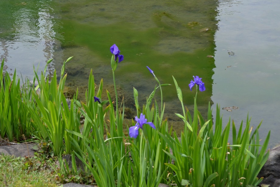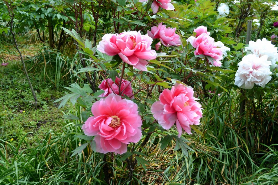 池の横にはアヤメが咲いていました。庭園の奥には牡丹の花が満開で非常に綺麗でした。ここの牡丹は小高い丘の中腹 に植えられており、色とりどりの大きな花がたくさん咲いていて迫力がありました。ボタン桜の花も散りかけていましたが、 まだ花が残っていました。地面に散ったボタン桜の花も花が房ごと散っていたので、綺麗でした。
