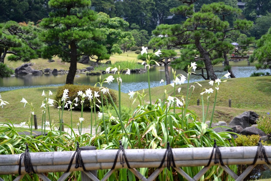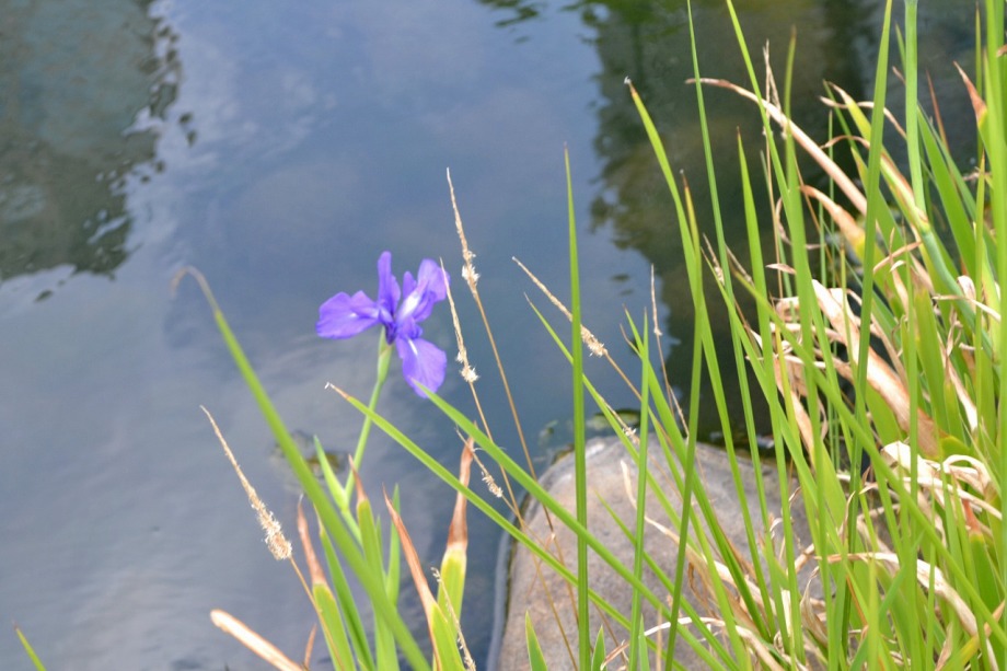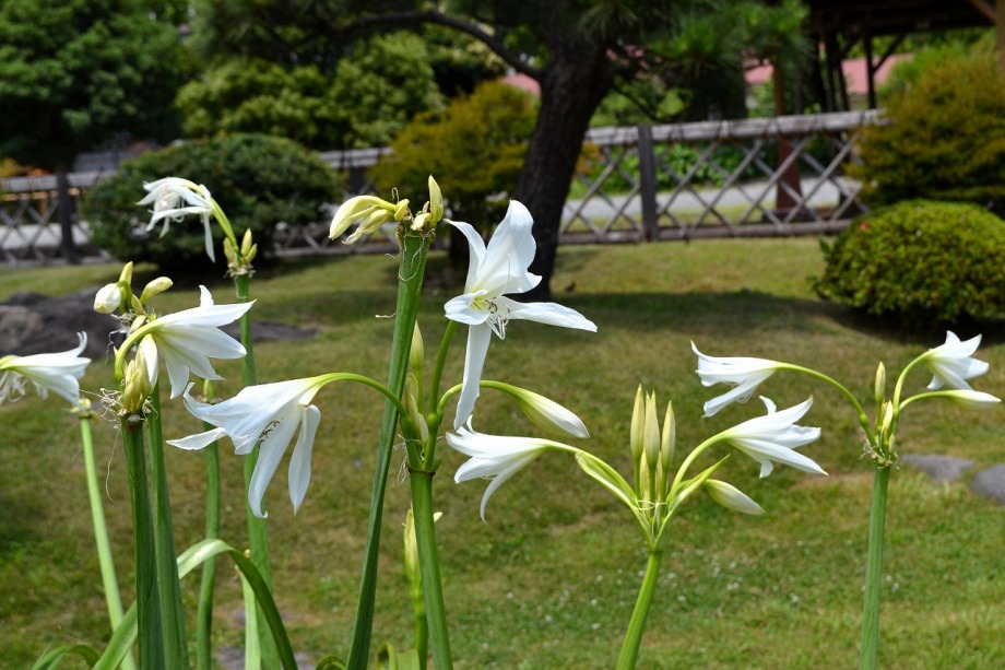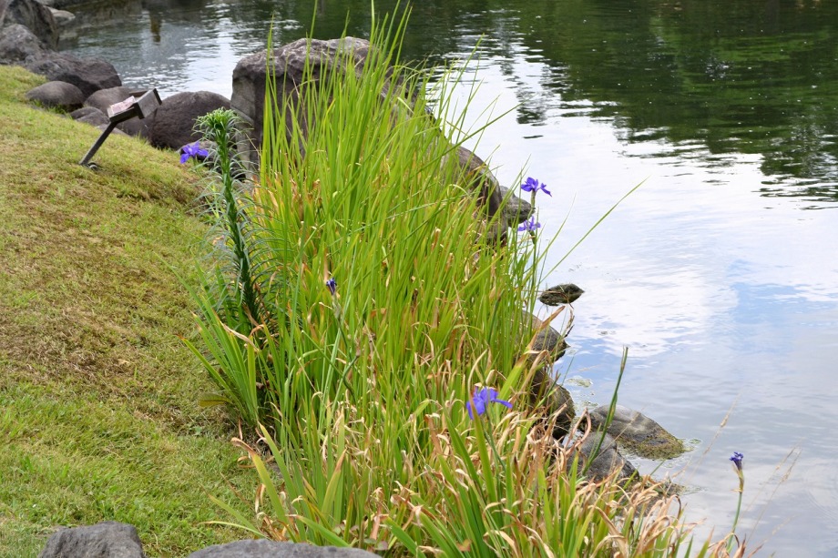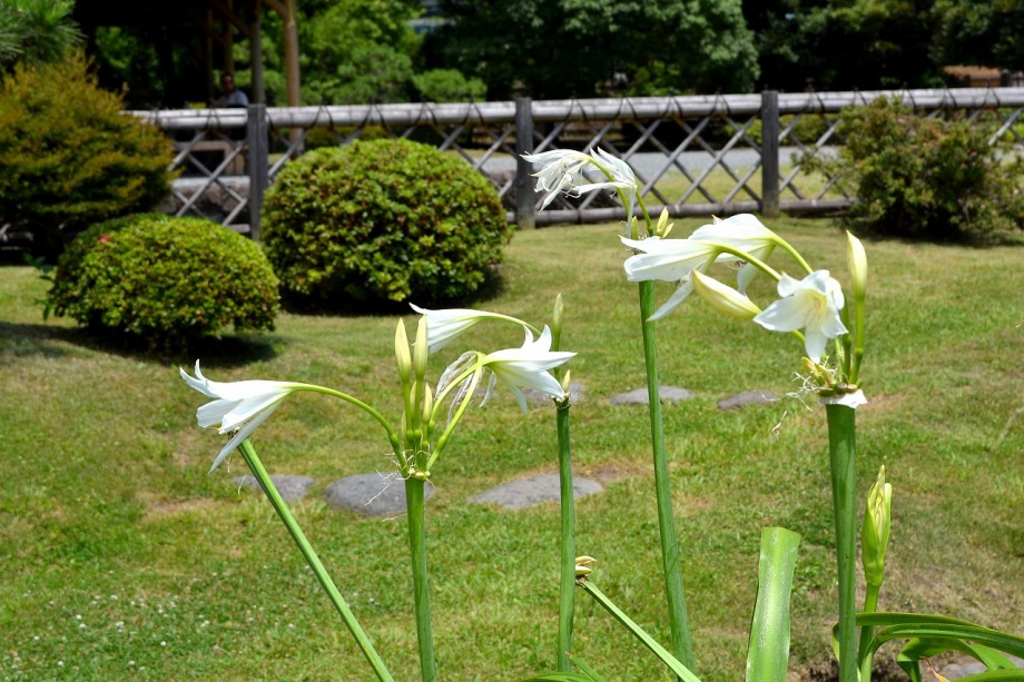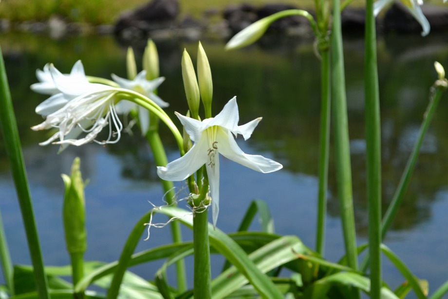 池のまわりには白い花のタカサゴユリ?がたくさん咲いていて、綺麗でした。池の淵にはカキツバタも咲いていました。