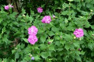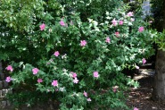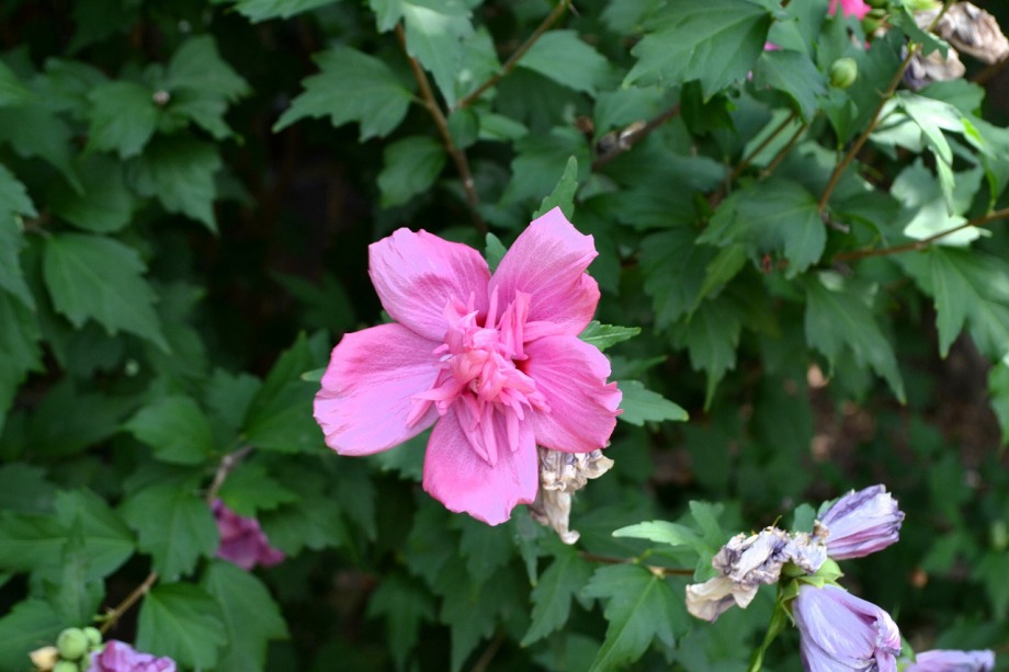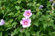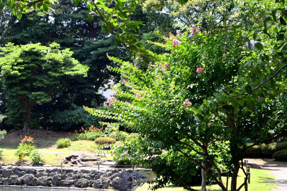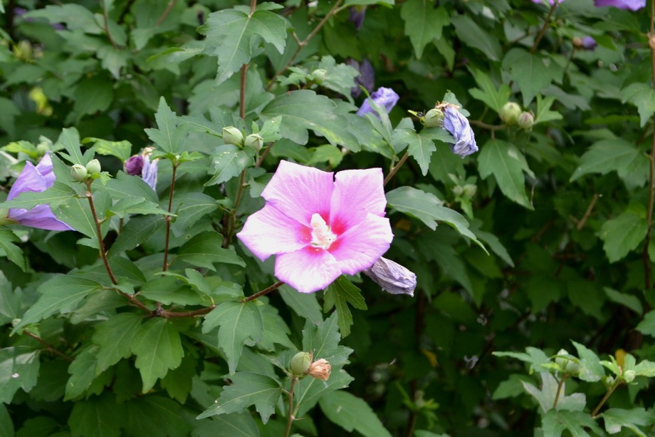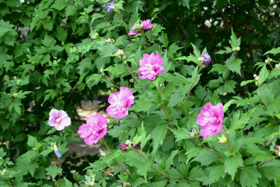 止まっていました。庭園の奥にはムクゲの花が見頃でした。白いムクゲとピンク色の八重のムクゲが咲いていました。