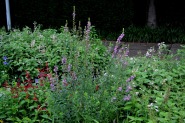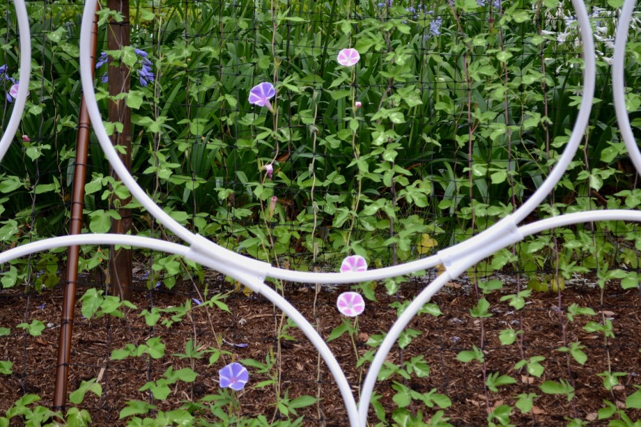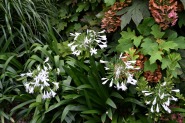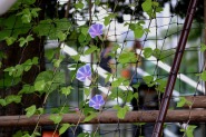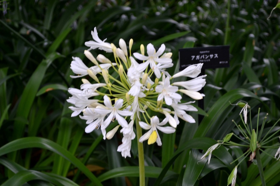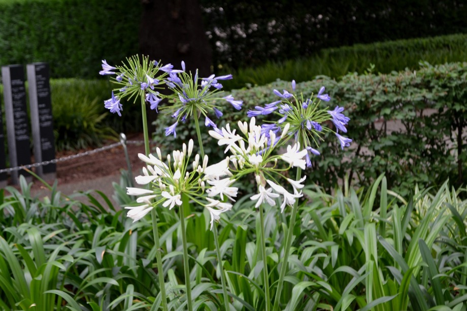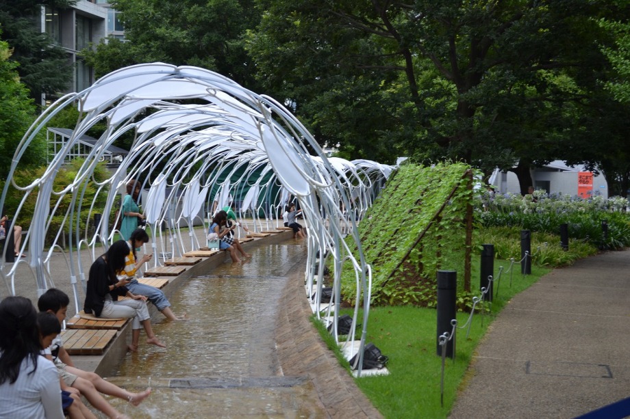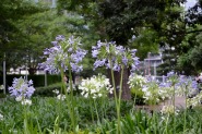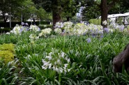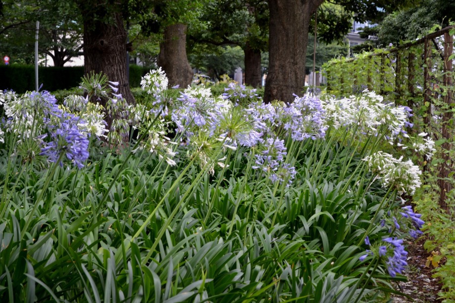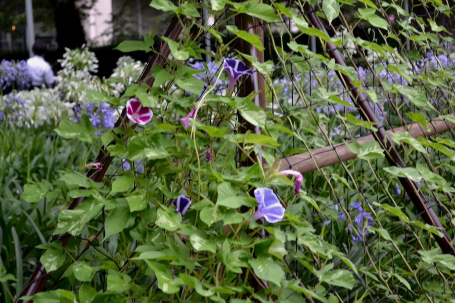 東京ミッドタウンの横の広場にはアガパンサスがたくさん咲いていました。小川に足をつける場所では朝顔が咲いていました。