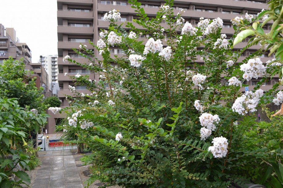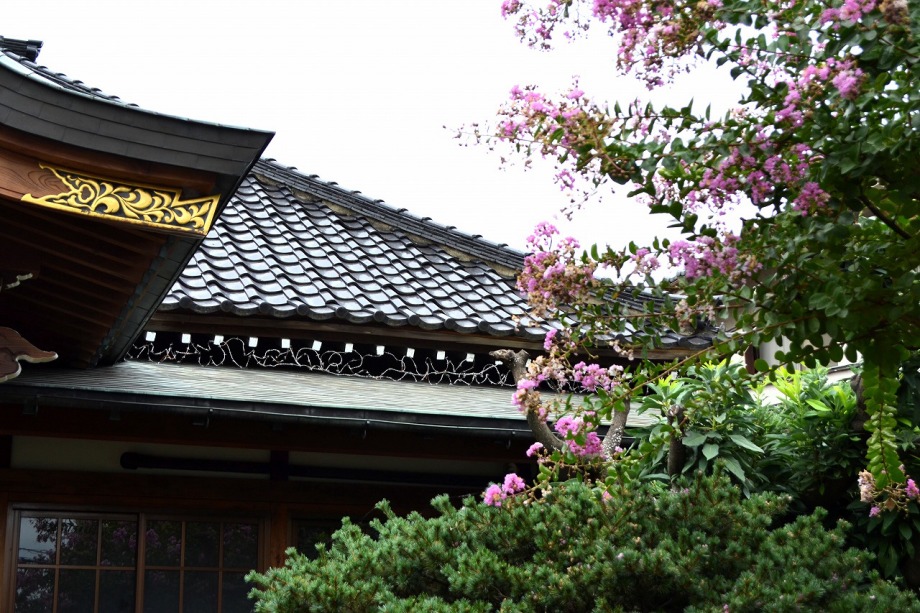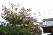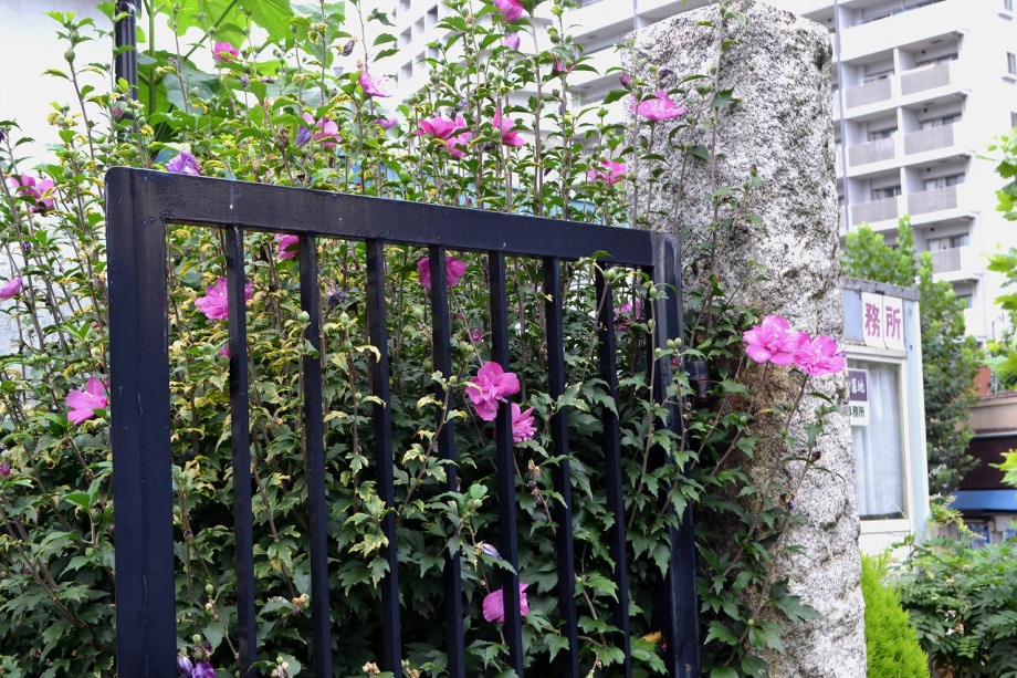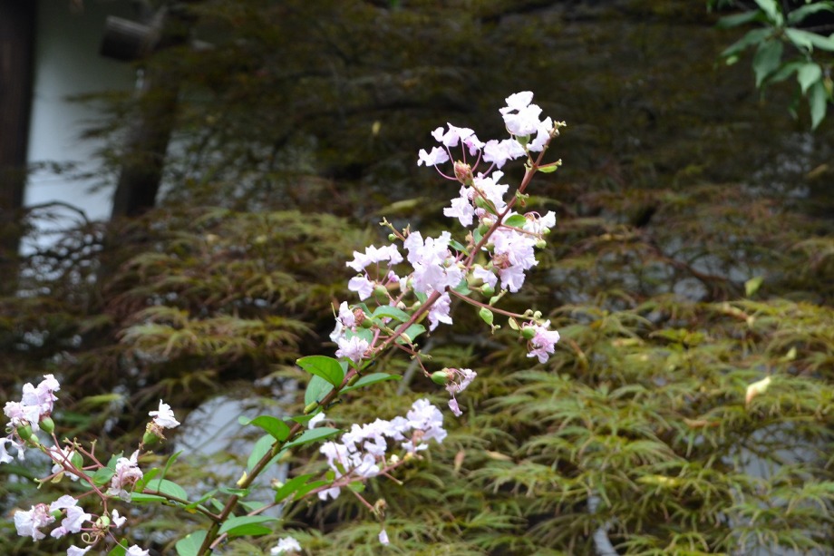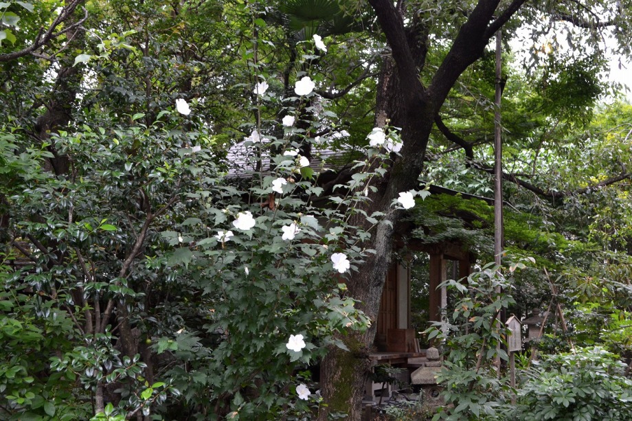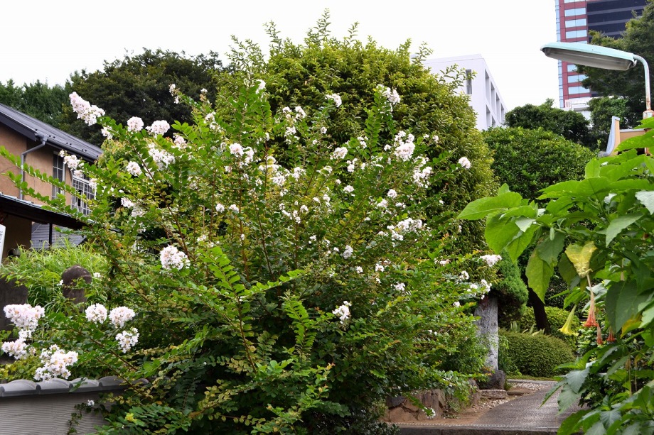 参道にはピンク色のムクゲや白い百日紅が咲いています。常林寺には名前の分からない花が色々と咲いていました。