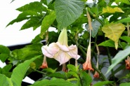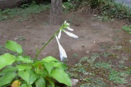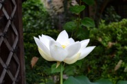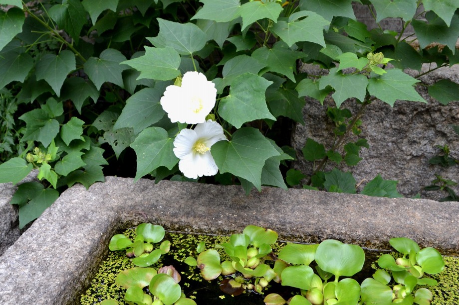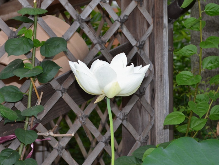三田4丁目の願海寺には、鉢に植えた蓮に白い花が咲いていました。トランペットフラワーは一輪だけが咲いていました。
