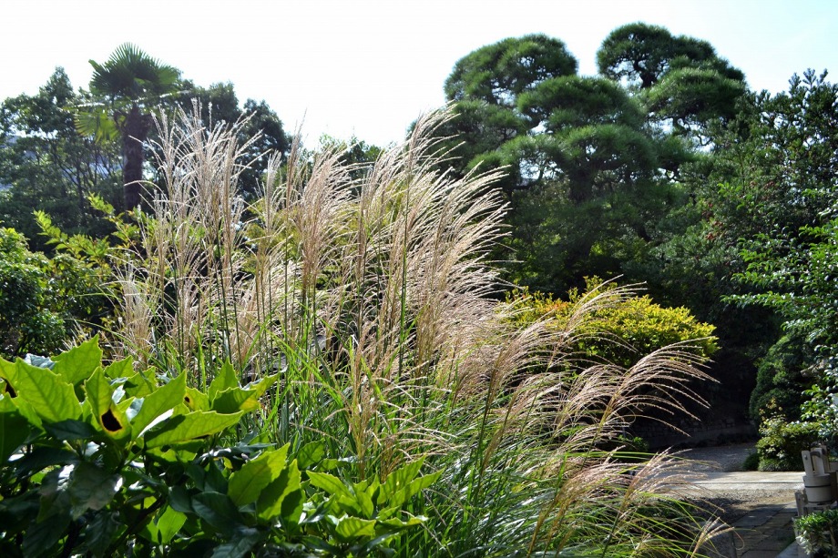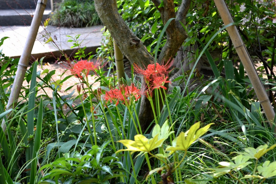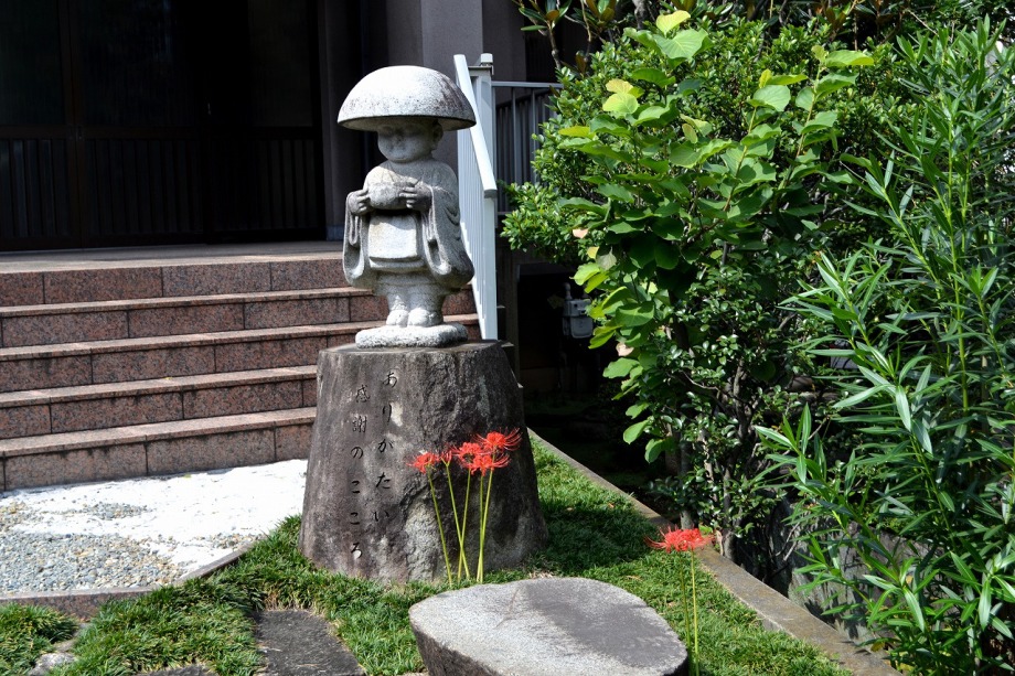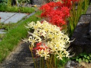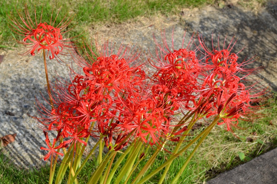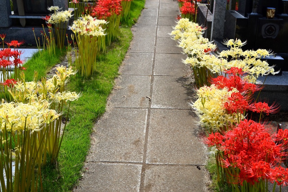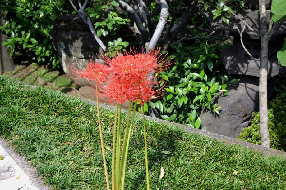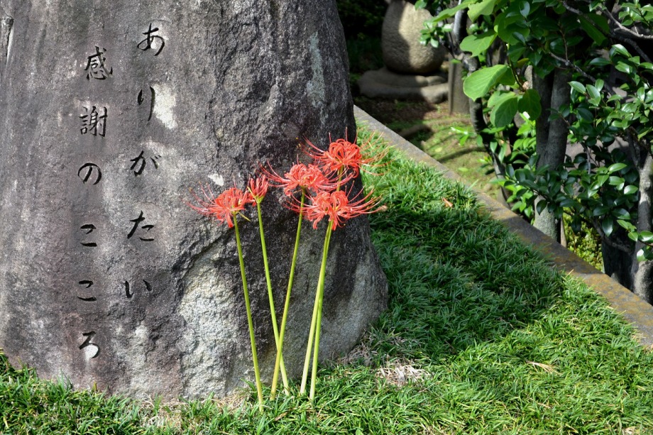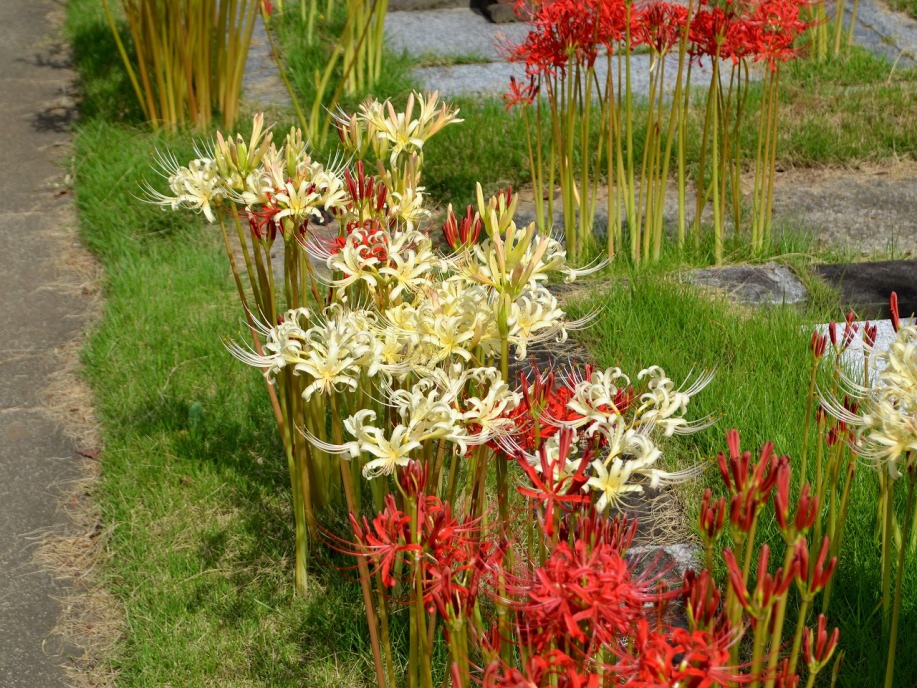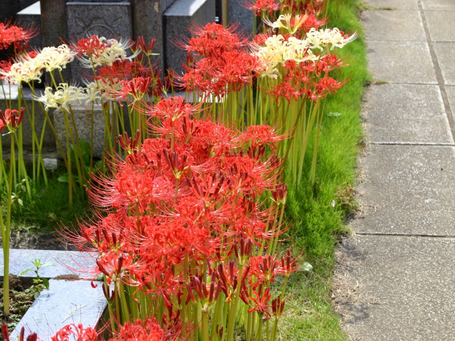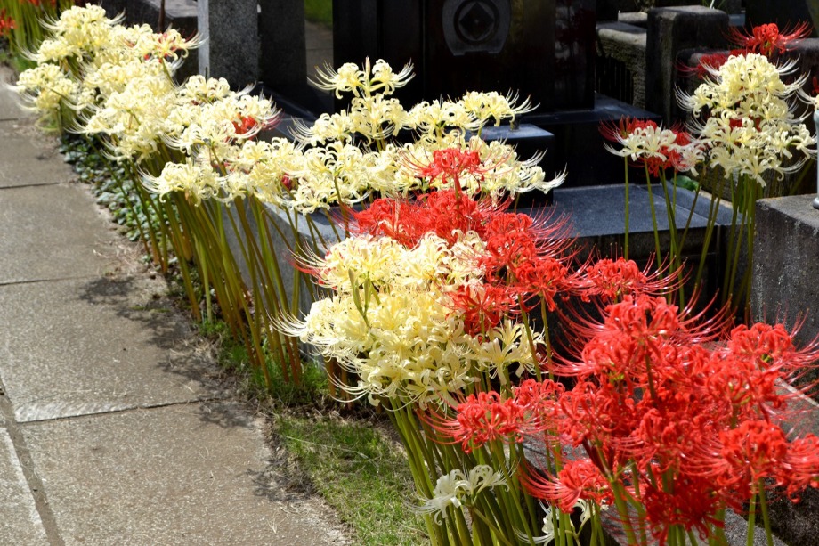 「一言」今日は観た丁目の寺町のお花を見に行きました。慈眼前寺の入口には赤い彼岸花が咲いていました。願海寺には紫色の花や 白い花が咲いていました。玉鳳寺の墓地には、白い彼岸花や赤い彼岸花が非常にたくさん咲いていて、見事でした。実相寺には 大きなススキの穂が伸びていました。薬王寺にはまだ、ガクアジサイが咲いていました。また、ホトトギスの花が咲いていました。 寺町の多くのお寺が彼岸花を植えていて、咲いていました。秋を感じることが出来ます。