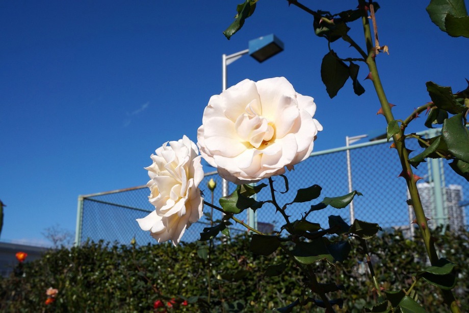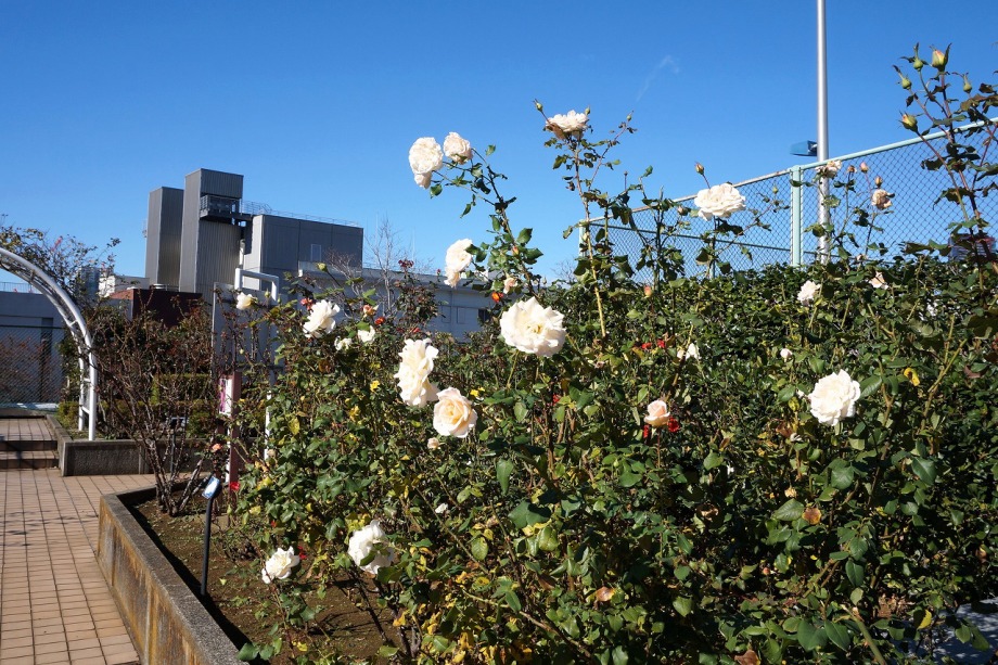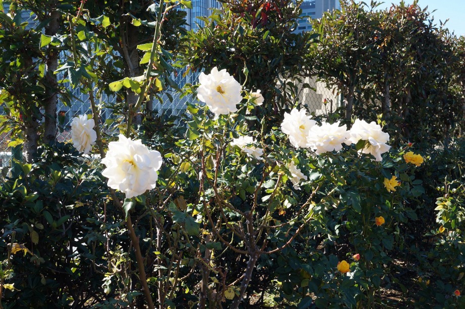 色は白い花が多い感じですが、ピンク色の混ざった花もありました。濃いピンクの花は一輪だけでした。芝浦中央公園にもバラの