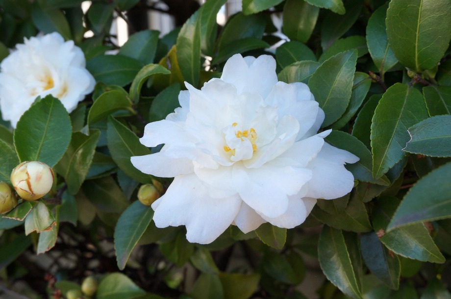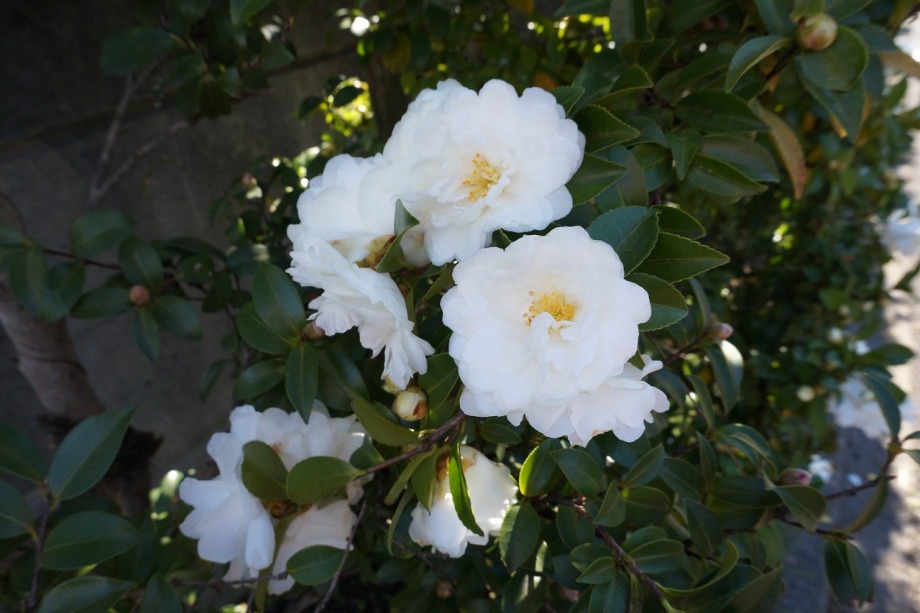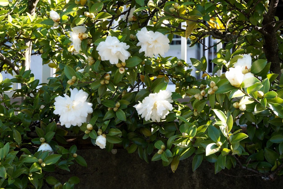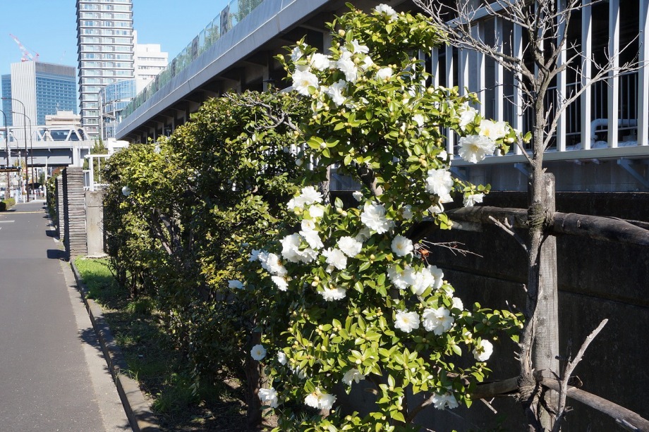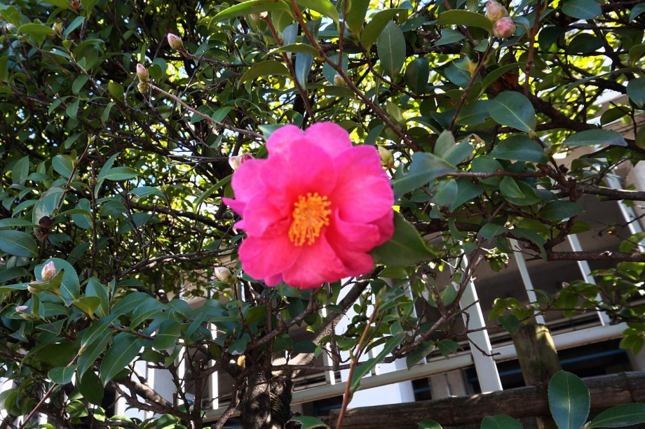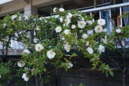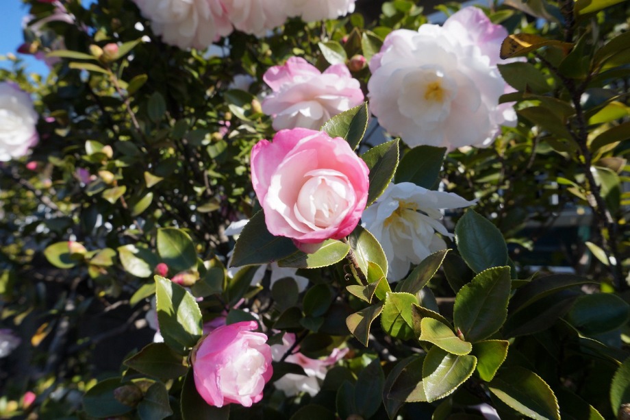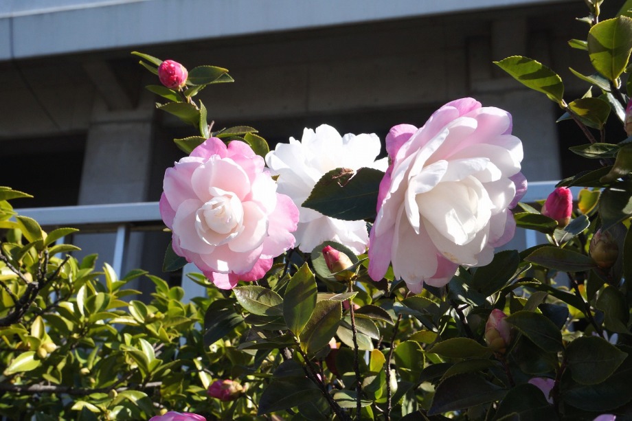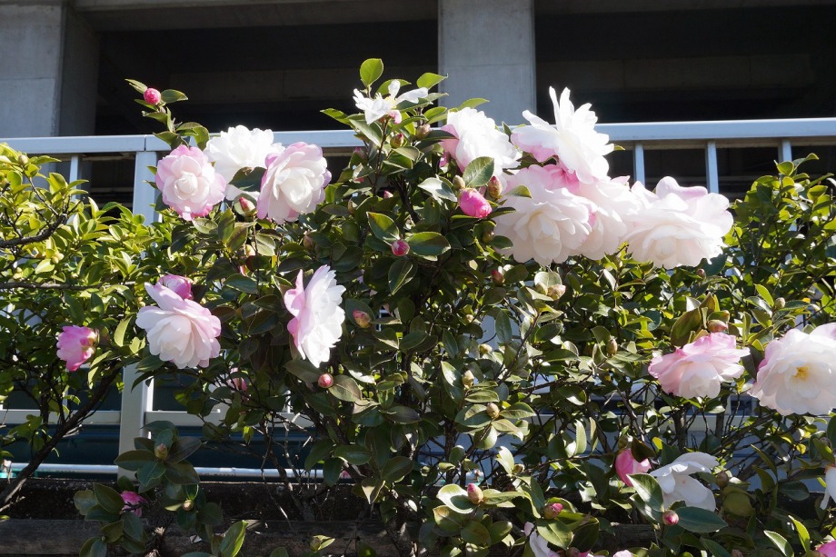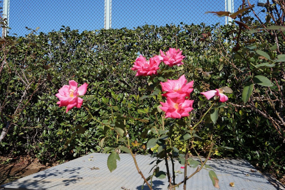 色も鮮やかな花が多く、綺麗でしたので、写真を撮りました。また、運動場の下の道端にはサザンカがたくさん花が咲いていました。