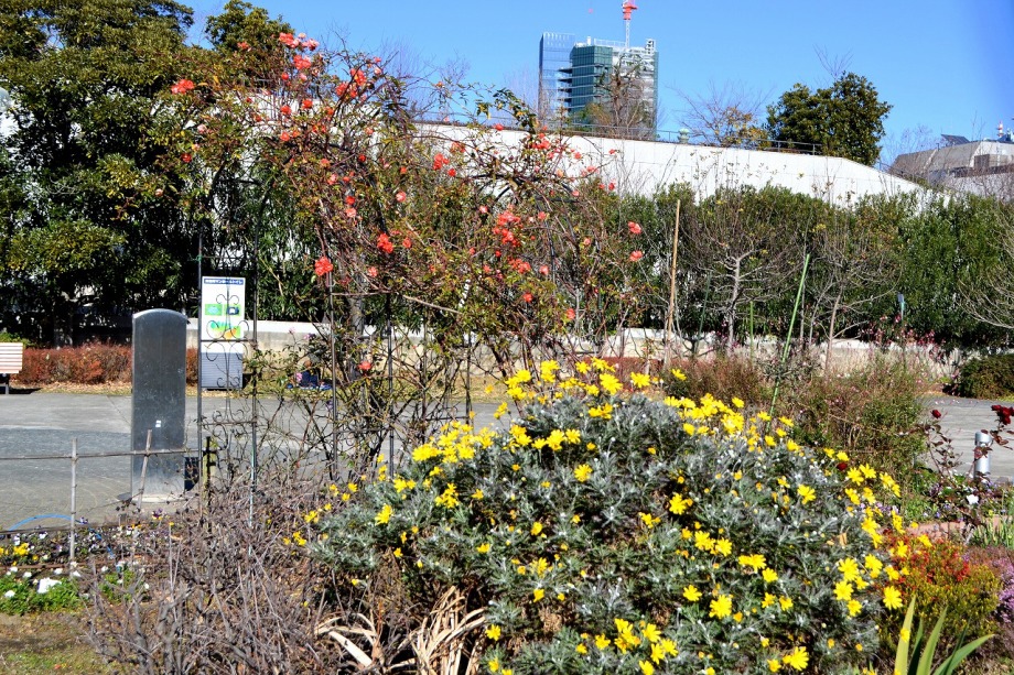 「一言」今日はもみじ谷の紅葉を見に行きましたが、もみじ谷には工事中で入れませんでした。外から見ると紅葉は 見頃になっている感じでした。そこで、芝公園や芝プリンス公園に行きましたら、色々とお花が咲いていました。 芝公園にはトランペットフラワーがたくさん花を咲かせていました。芝プリンス公園にはバラが咲いていました。 花の数は少ないが、色々な色の綺麗な花が咲いていました。