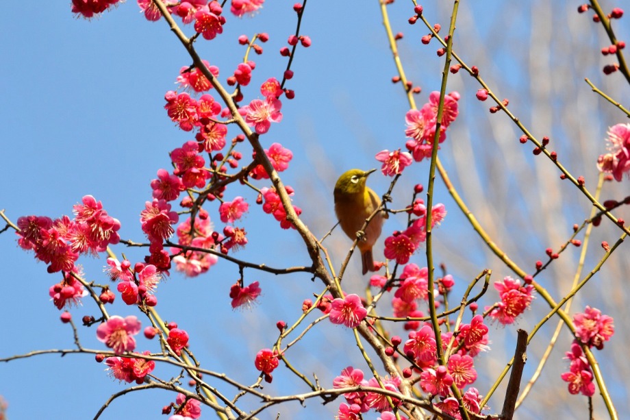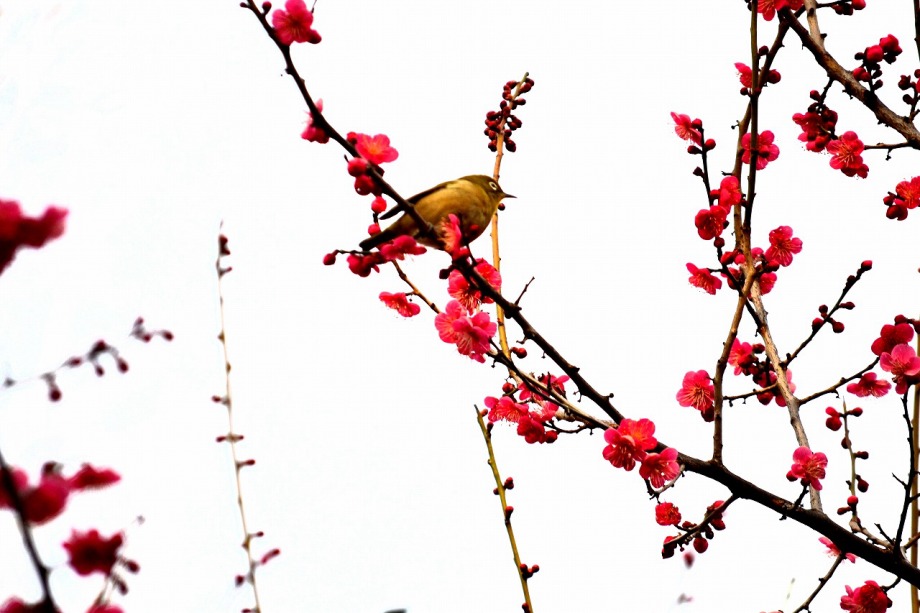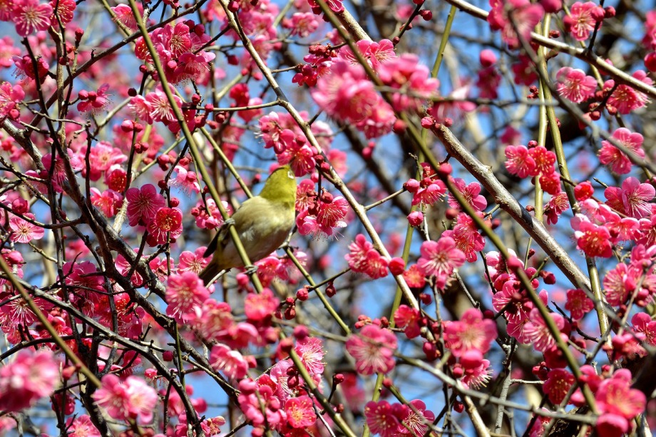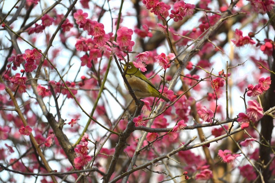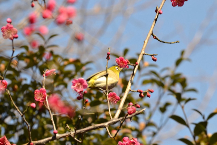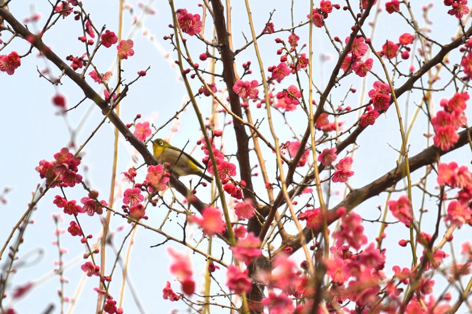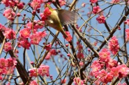 「一言」28日は天気が良いので、亀塚公園に梅の花を見に行きました。梅の花がたくさん咲いていましたが、ヒヨドリやメジロが飛んで来ていました。 メジロは忙しそうに梅の花をついばんでいました。ヒヨドリは木の高いところに止まりますが、メジロは木の中に花を啄んでいるので、写真を 撮るのが難しい感じでしたが、楽しく見ていました。31日にまた亀塚公園に行き、メジロやヒヨドリの写真を撮りました。梅の花も増えていました。