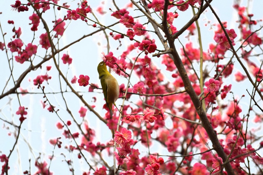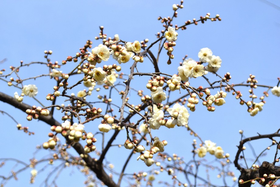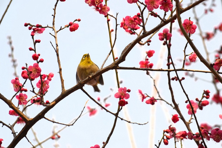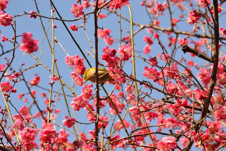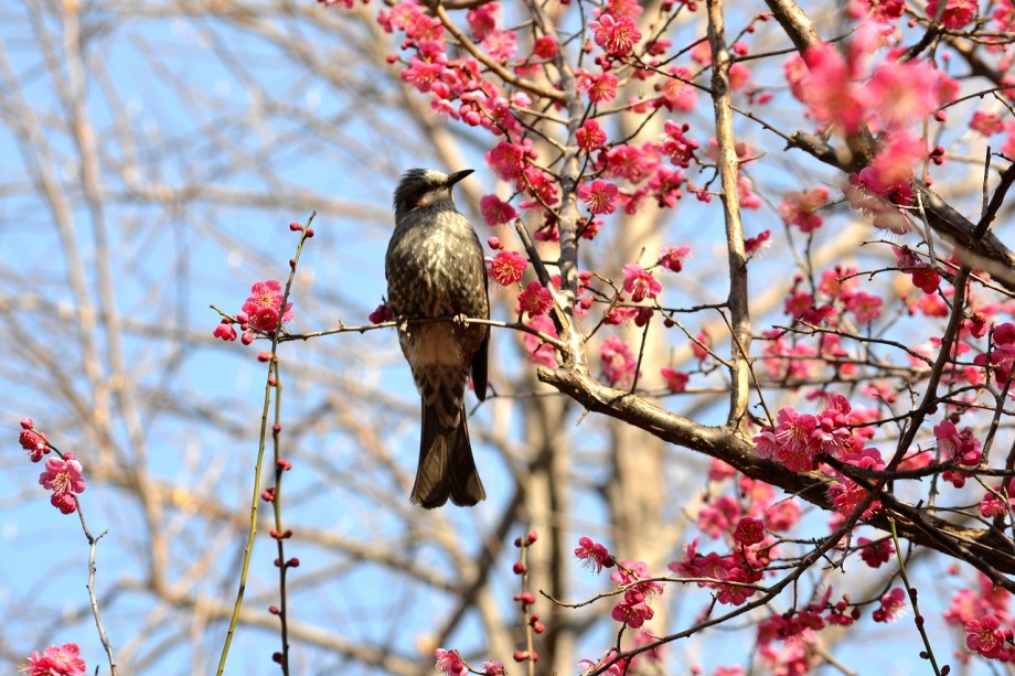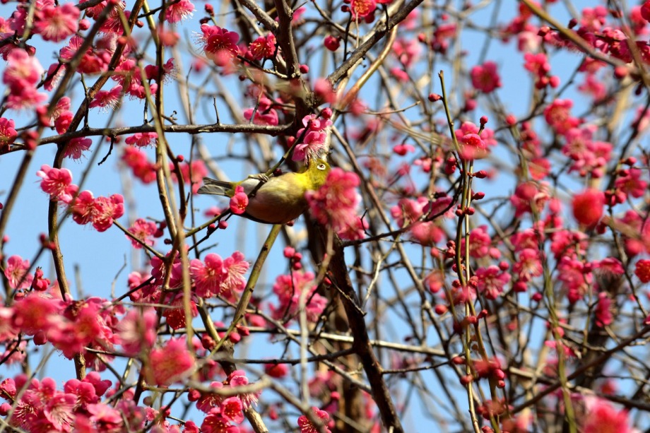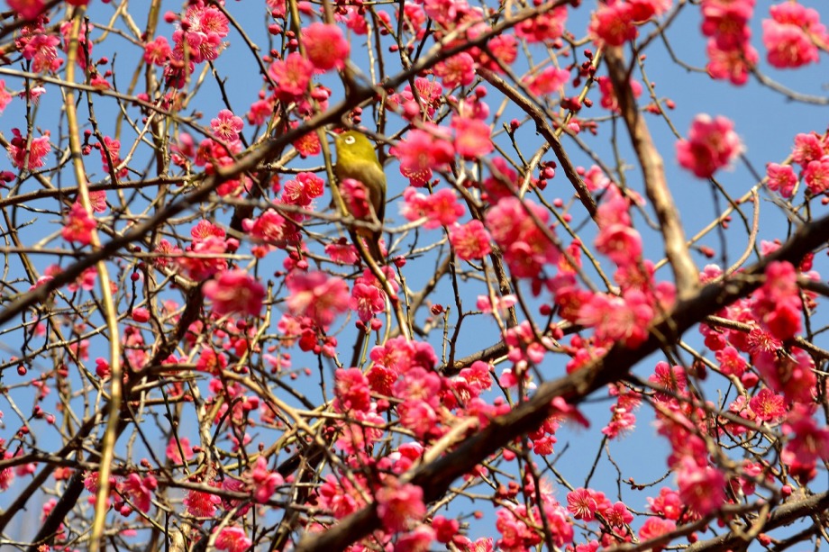 「一言」28日は天気が良いので、亀塚公園に梅の花を見に行きました。梅の花がたくさん咲いていましたが、ヒヨドリやメジロが飛んで来ていました。 メジロは忙しそうに梅の花をついばんでいました。ヒヨドリは木の高いところに止まりますが、メジロは木の中に花を啄んでいるので、写真を 撮るのが難しい感じでしたが、楽しく見ていました。31日にまた亀塚公園に行き、メジロやヒヨドリの写真を撮りました。梅の花も増えていました。