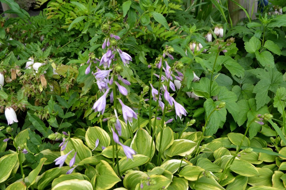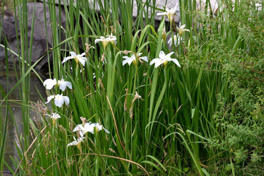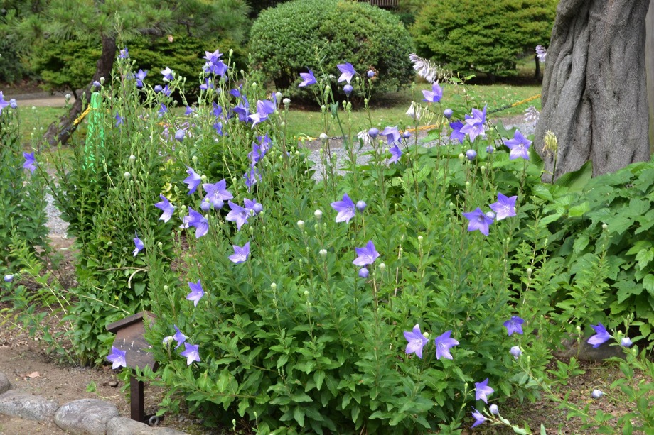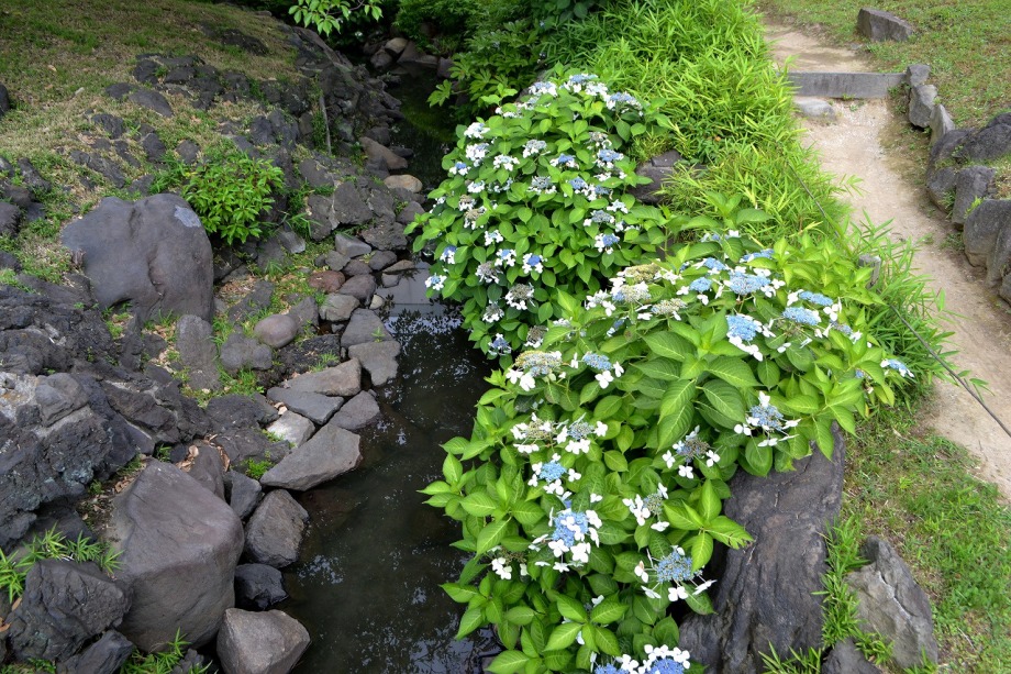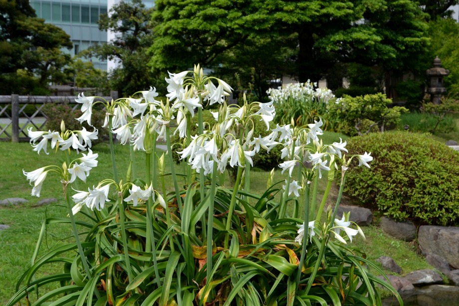 「一言」芝公園のアジサイが見頃になりました。旧芝離宮の入り口には桔梗やホタルフクロが咲いています。真っ白い花のインドハマユウが 満開です。たくさん大きな花が咲くので、庭園を華やかにする感じです。ノカンゾウも咲き出しました。池の周りにアジサイも見頃です。
