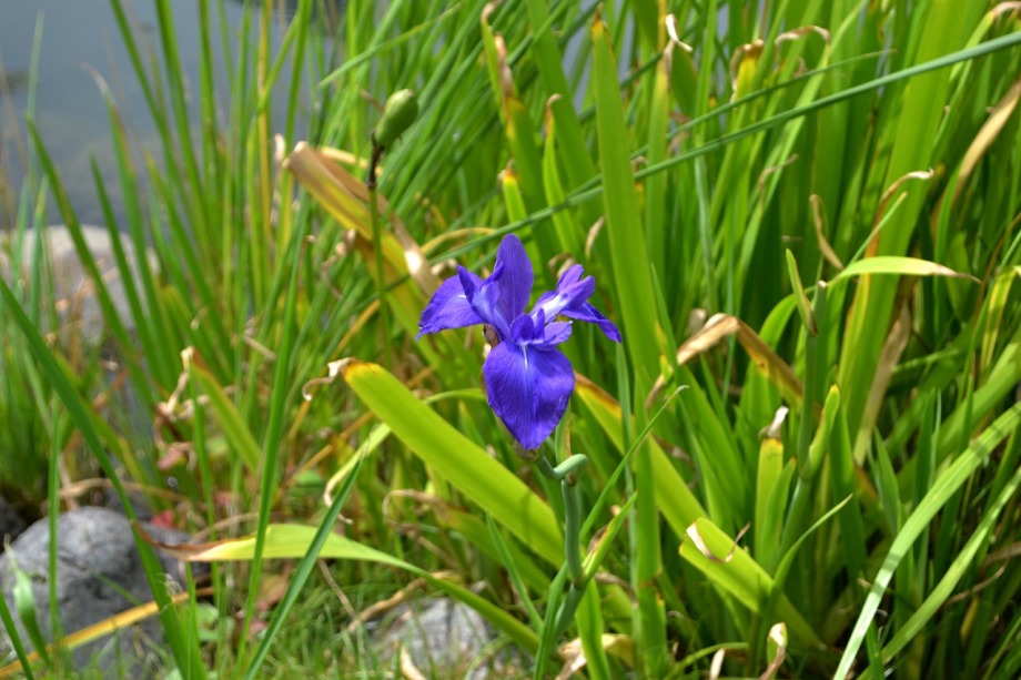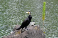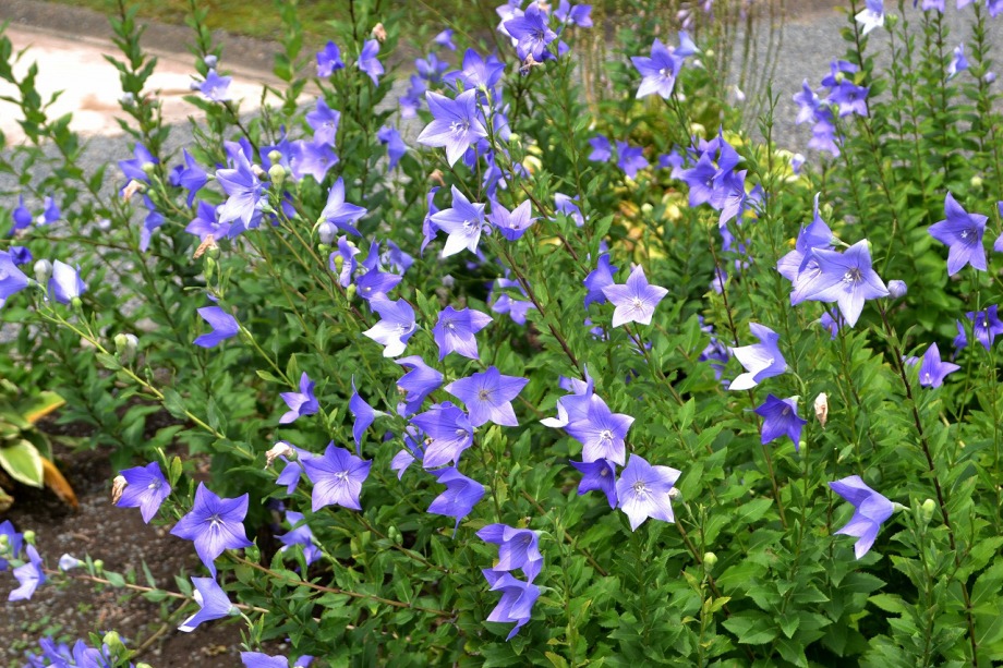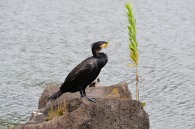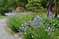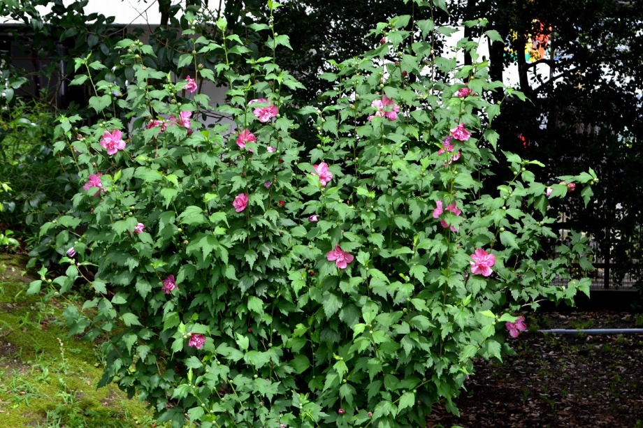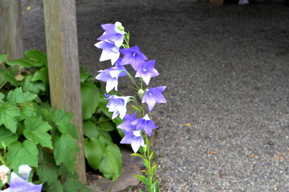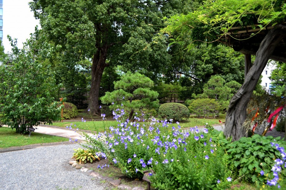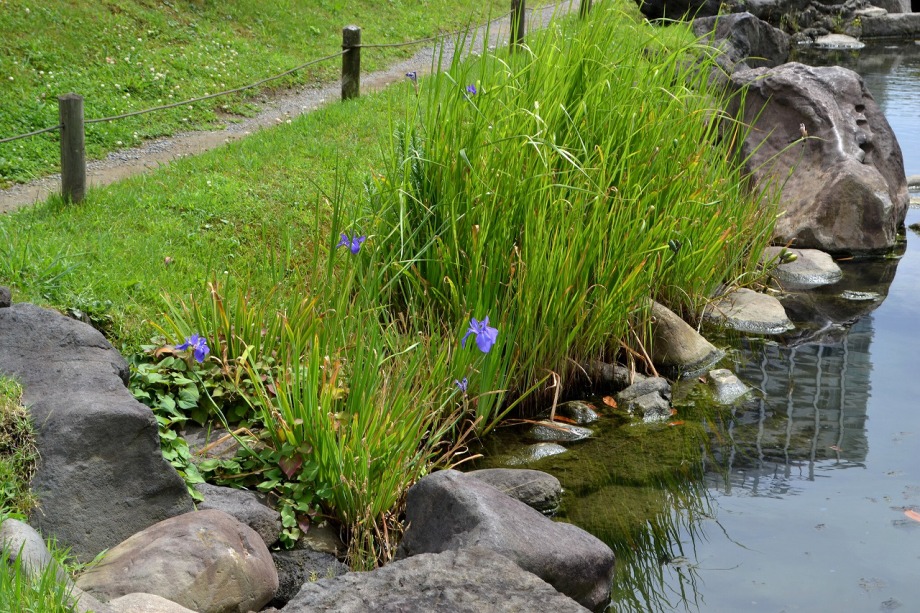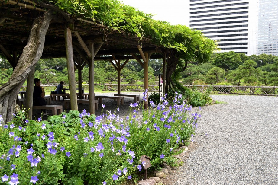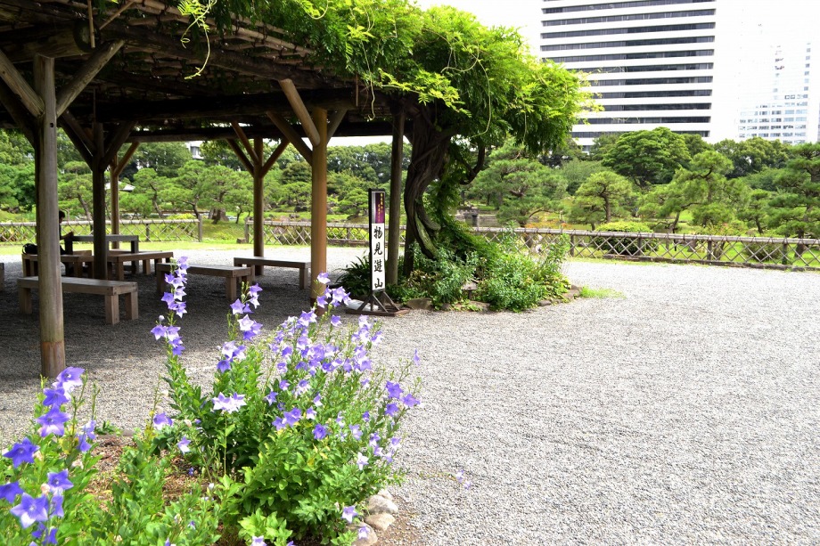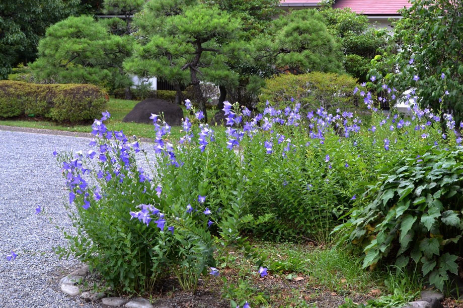 「一言」旧芝離宮の入り口には桔梗がたくさん咲いています。池の淵にはまだカキツバタが咲いています。ムクゲのピンク色の花が咲き出しました。 庭園の奥にはノカンゾウがまだ咲いています。カワウが池に飛んで来ていました。