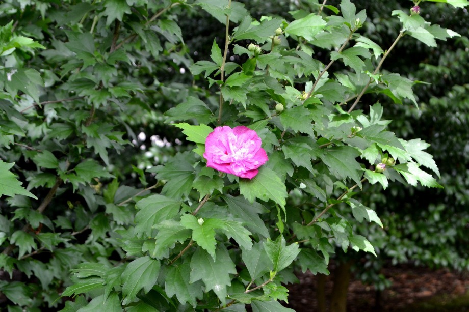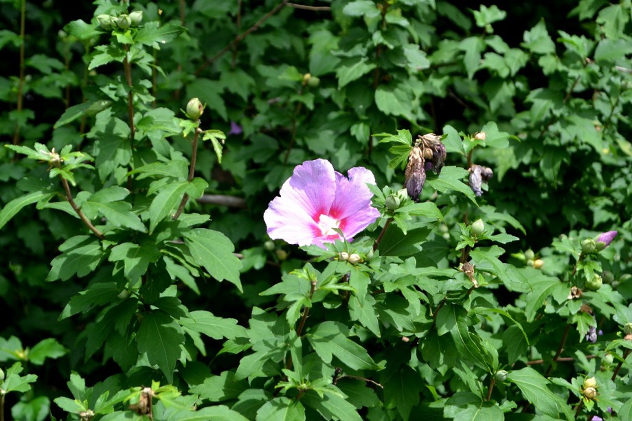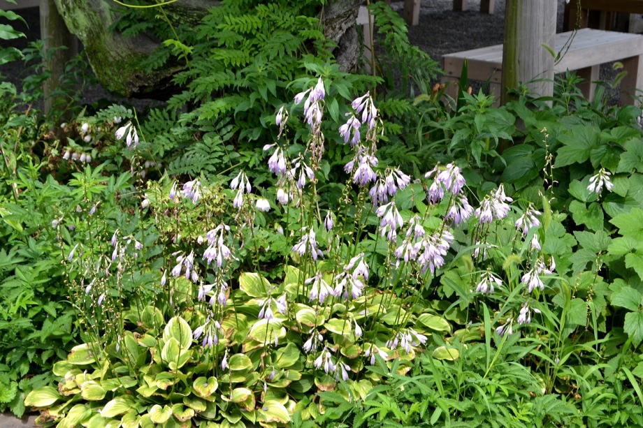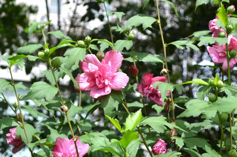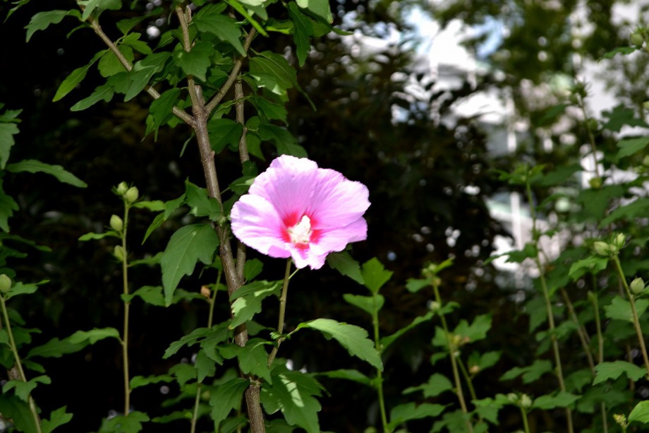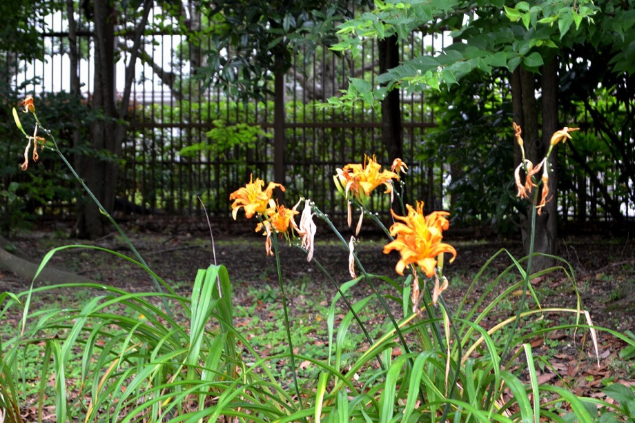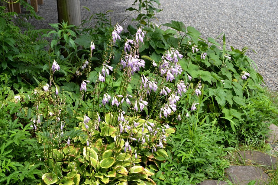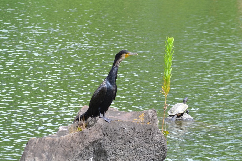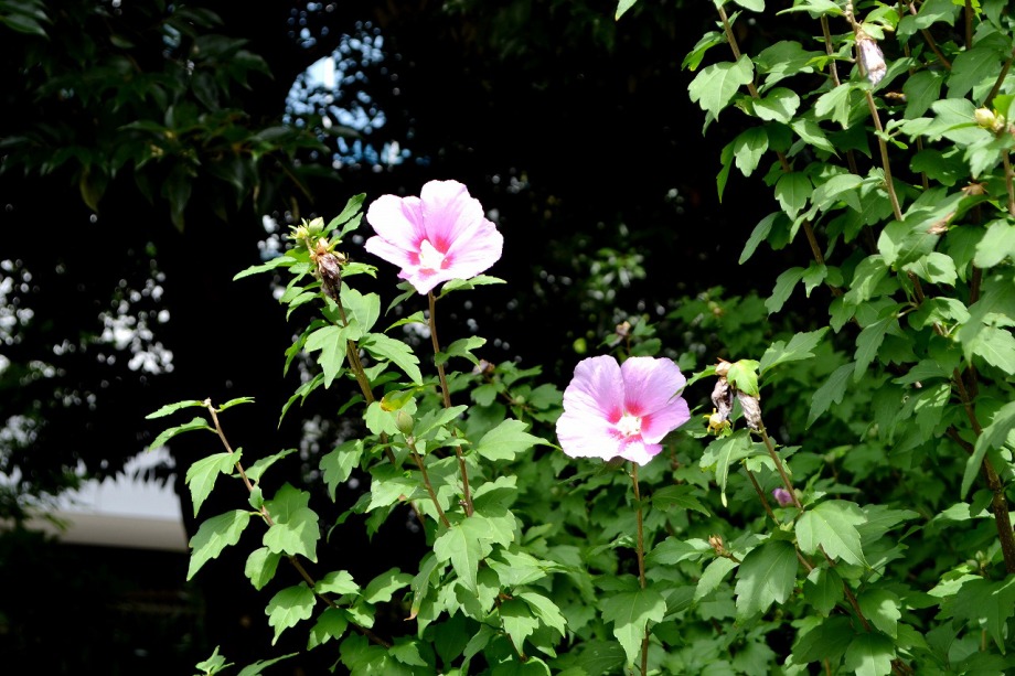 「一言」旧芝離宮の入り口には桔梗がたくさん咲いています。池の淵にはまだカキツバタが咲いています。ムクゲのピンク色の花が咲き出しました。 庭園の奥にはノカンゾウがまだ咲いています。カワウが池に飛んで来ていました。