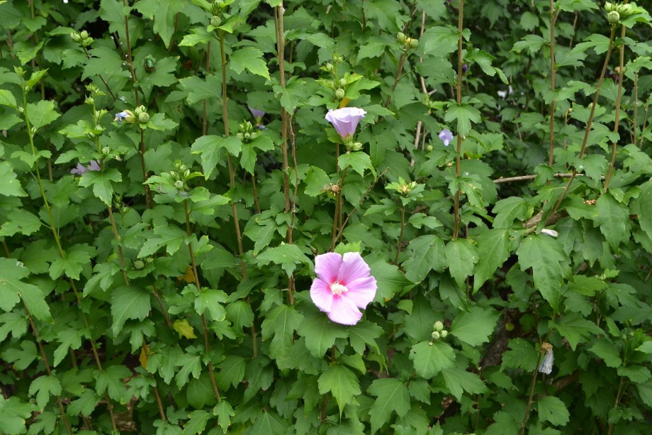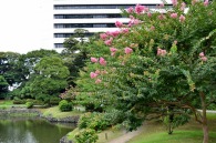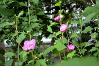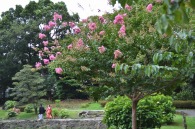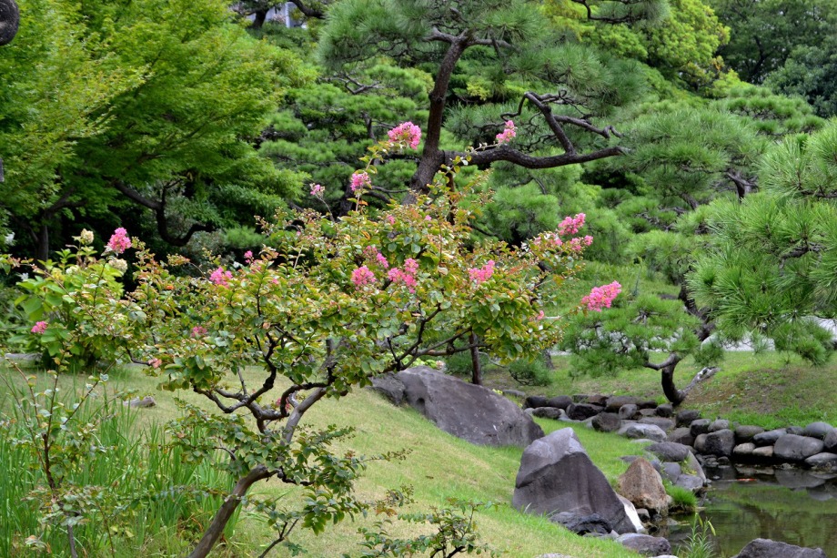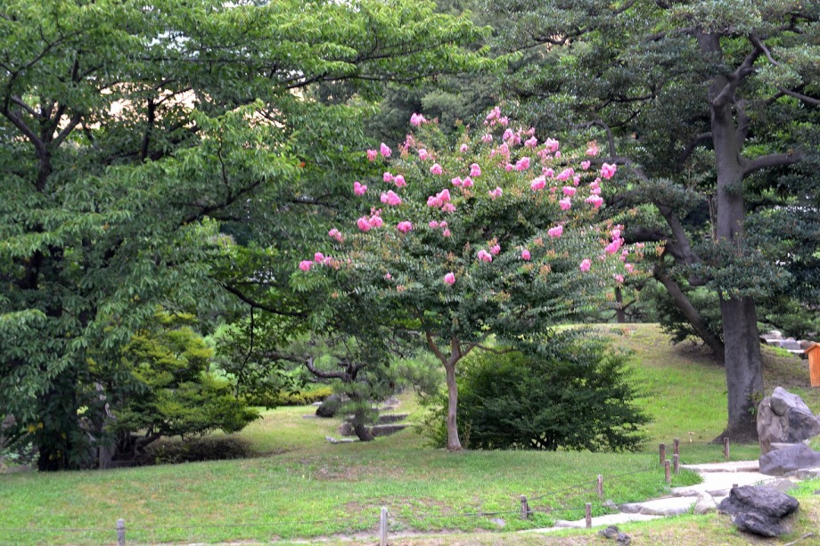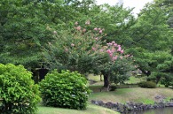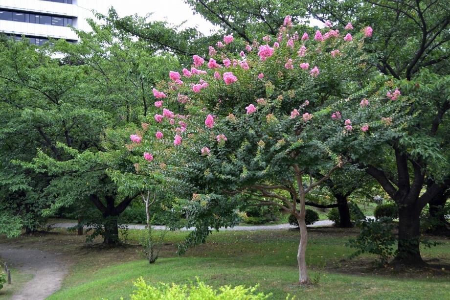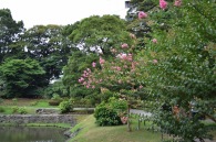 ムクゲも少しだけ咲いていますが、これからたくさん咲く感じです。百日紅の花が咲いていて池の風景に溶け込んで綺麗です。