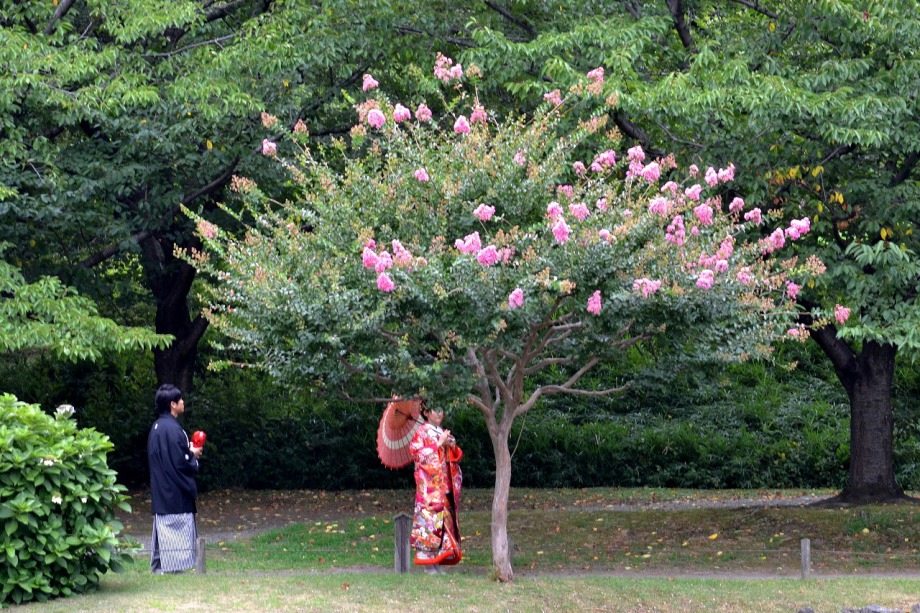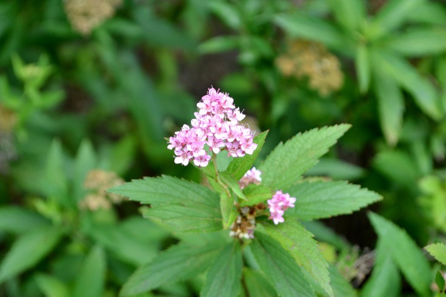 新婚さんが婚礼の衣装で写真を撮っていました。葉が白くなり花が咲いている感じの草がありました。シモツケもまだ咲いています。