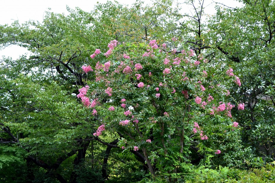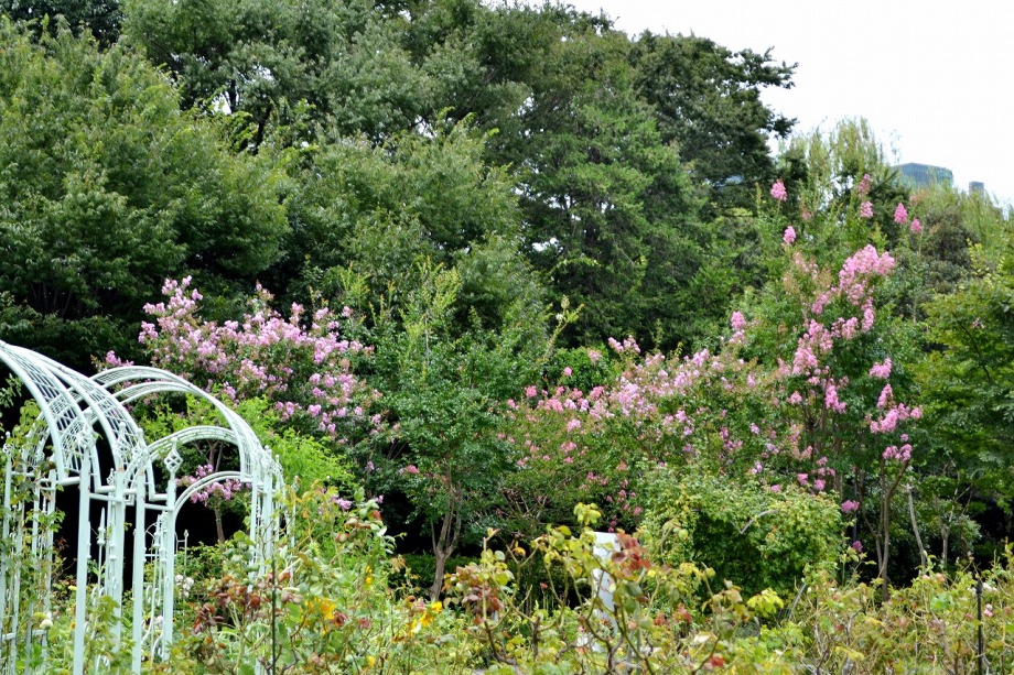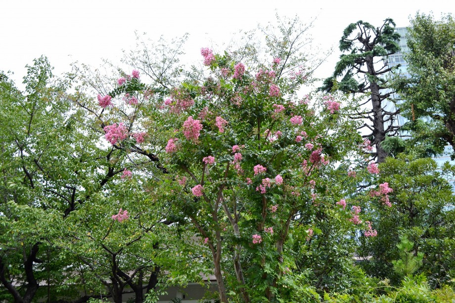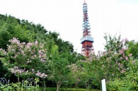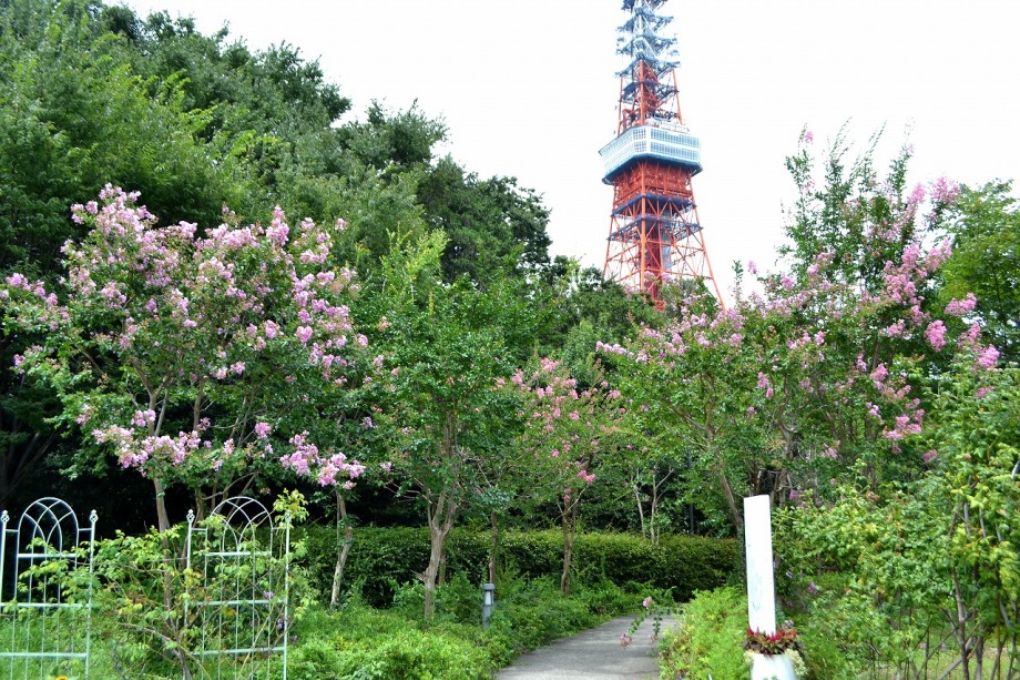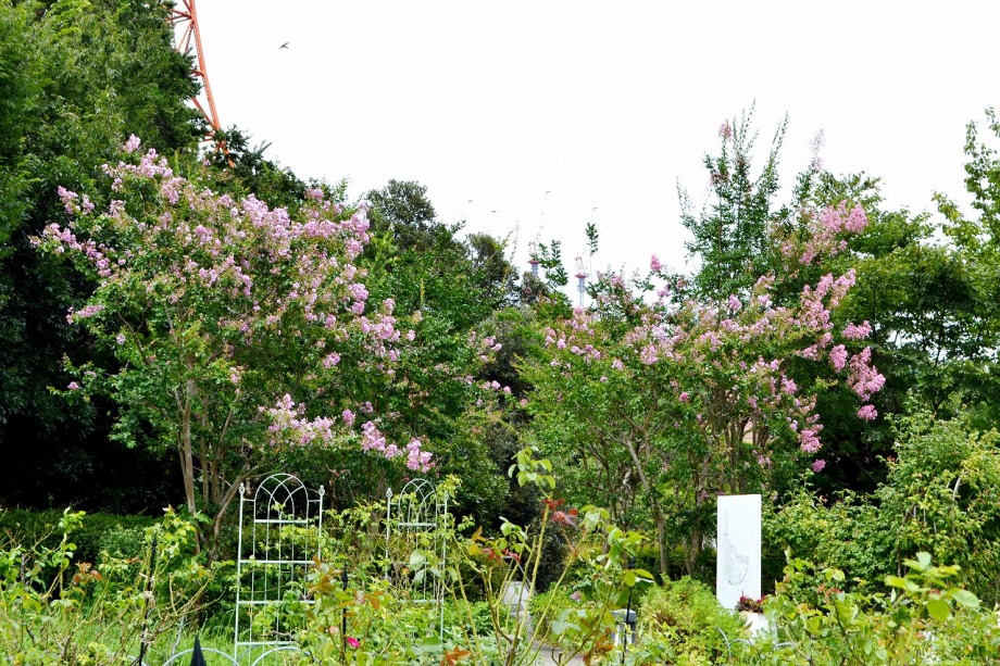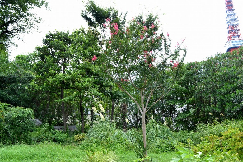 「一言」芝プリンス公園の百日紅が見頃です。東京タワーを背景にピンク色の花が咲いています。バラも少しですが咲いています。 芝公園にはパンパスグラスが大きな穂を出しています。ススキも少しですが穂が出てきました。暑い時期ですが色々な花が 咲いていました。