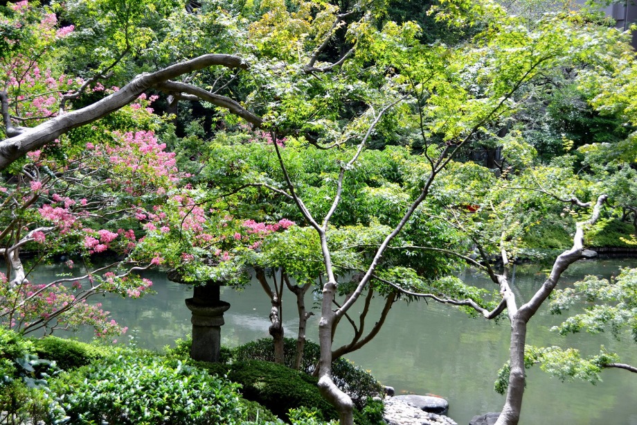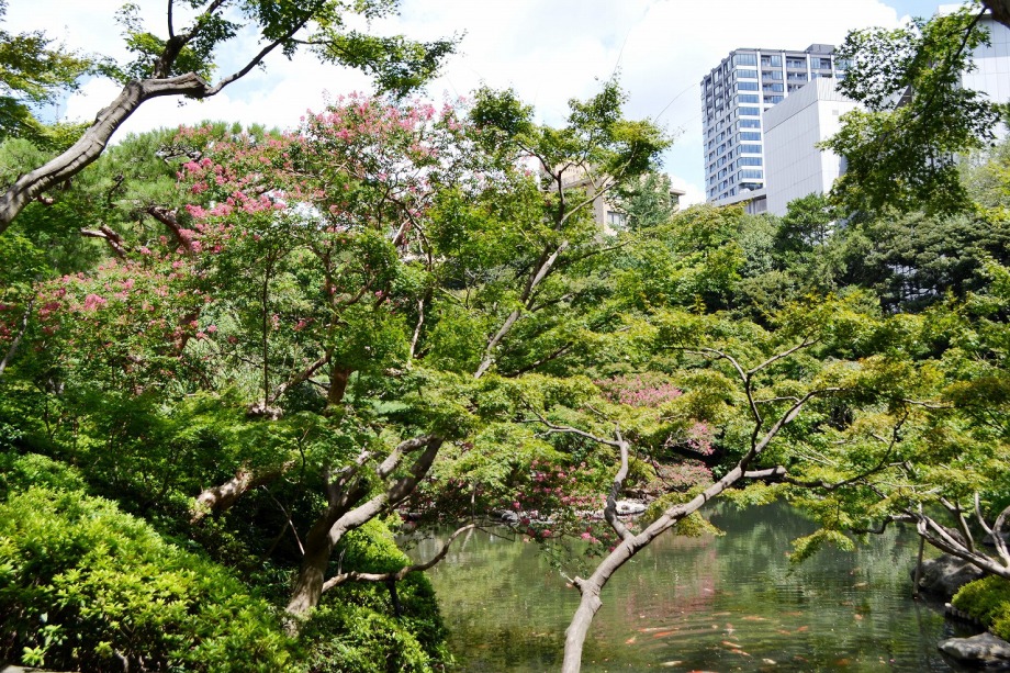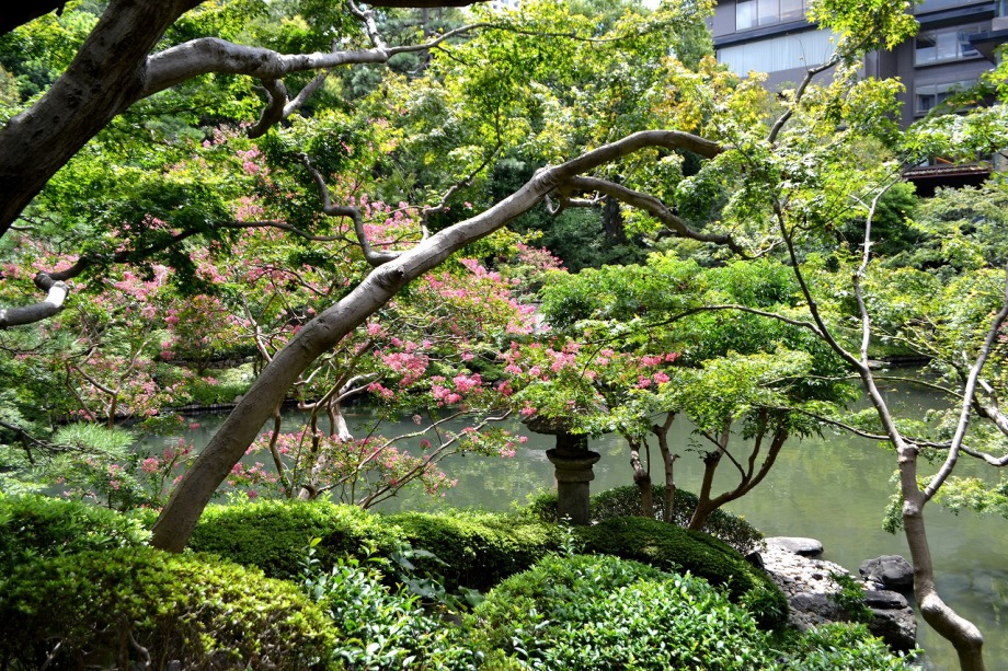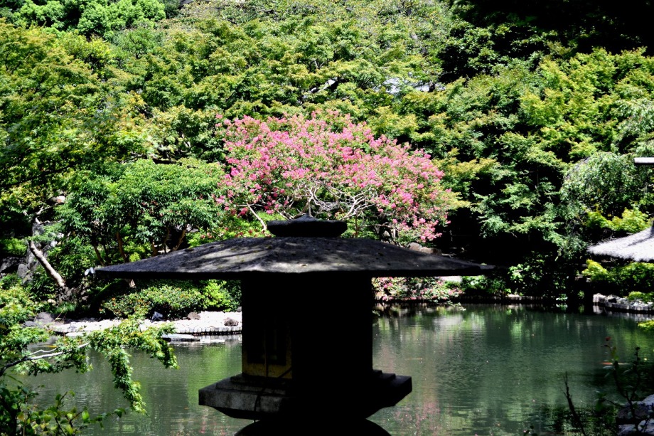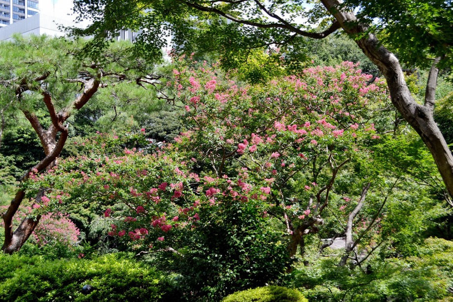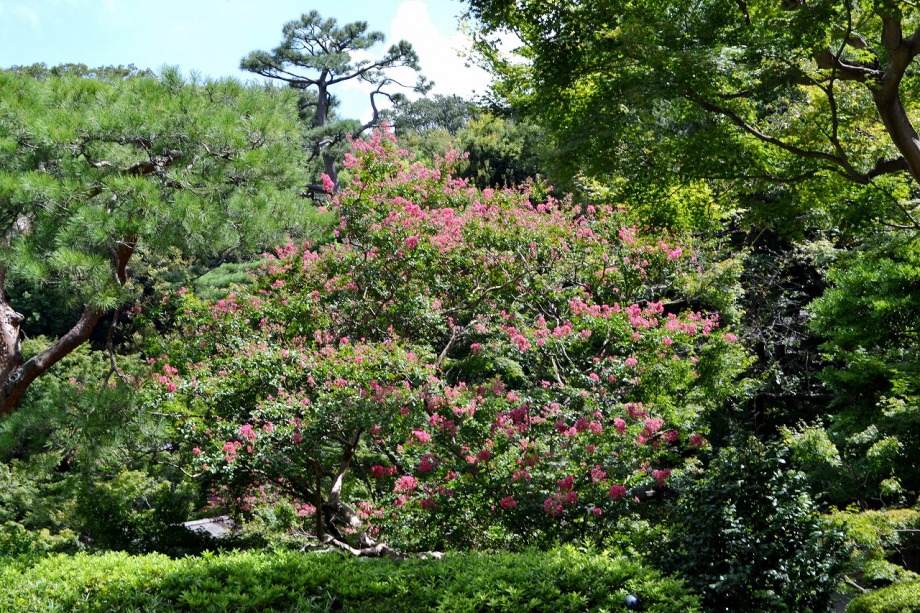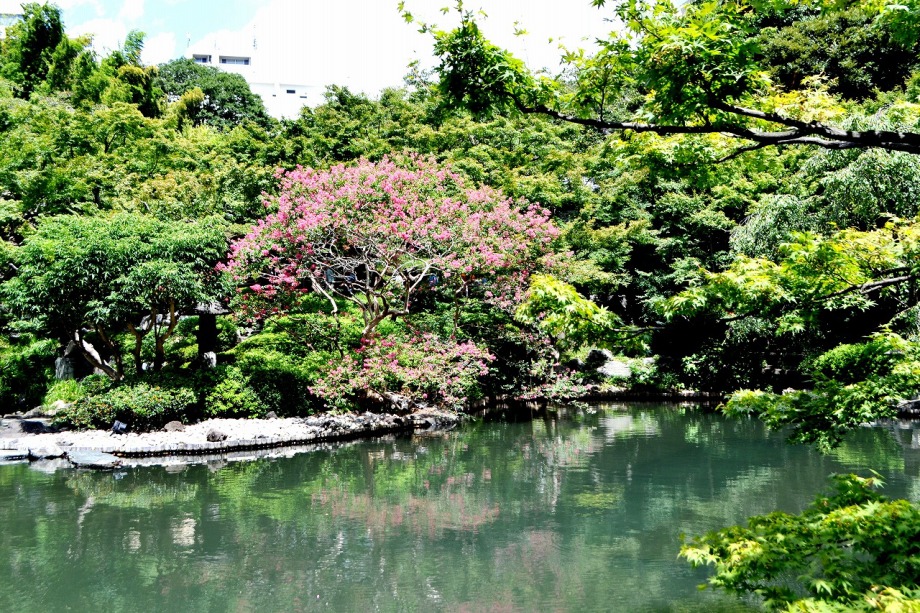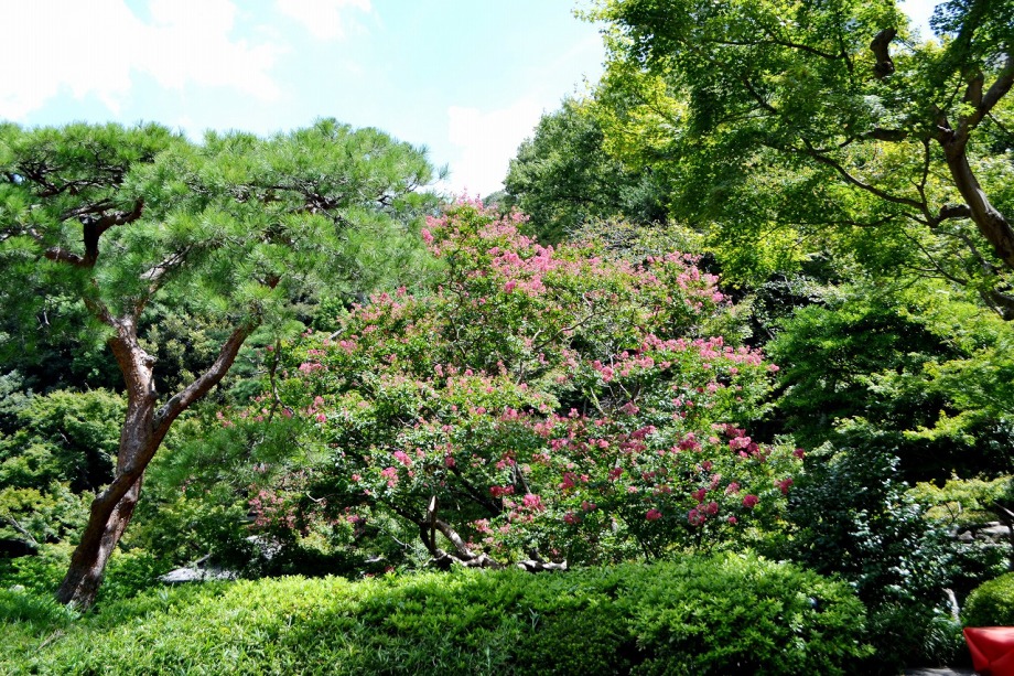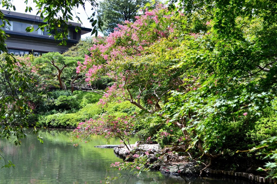 「一言」八芳園にはお花が少ないと聞いていましたが、見に行きましたら。ピンク色の百日紅が池の周りに咲いていました。暑い時期に庭の雰囲気と 調和して良い雰囲気でした。木々は濃い緑色になっており、水の流れもあったので、落ち着いた感じがしました。