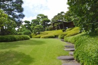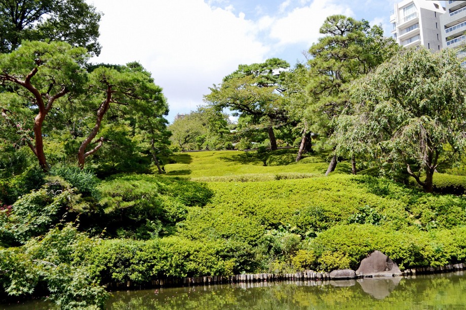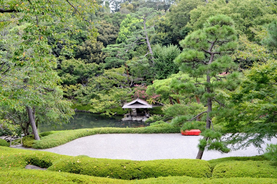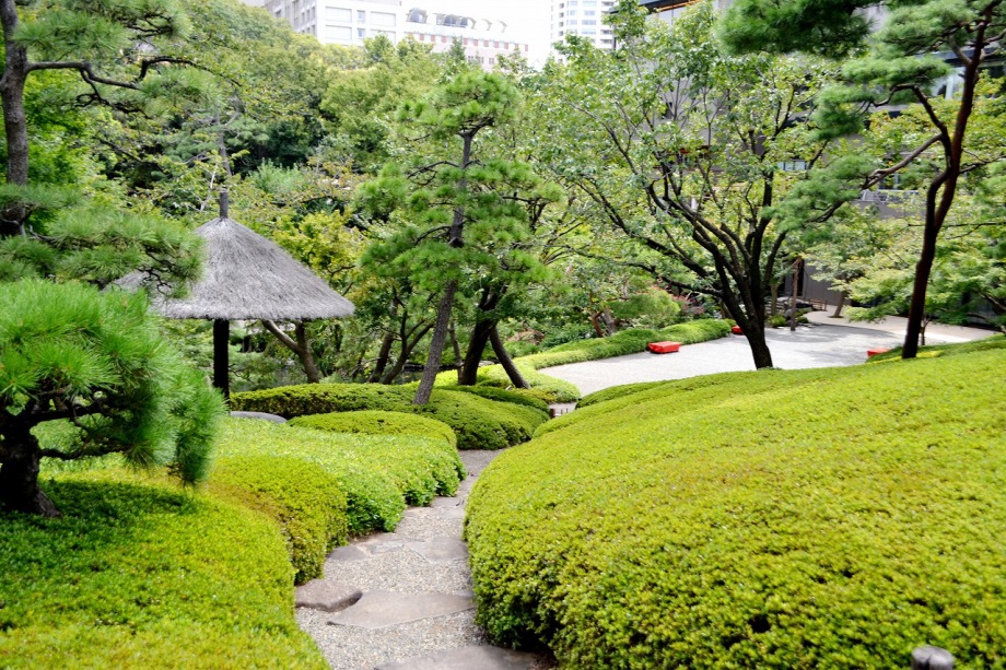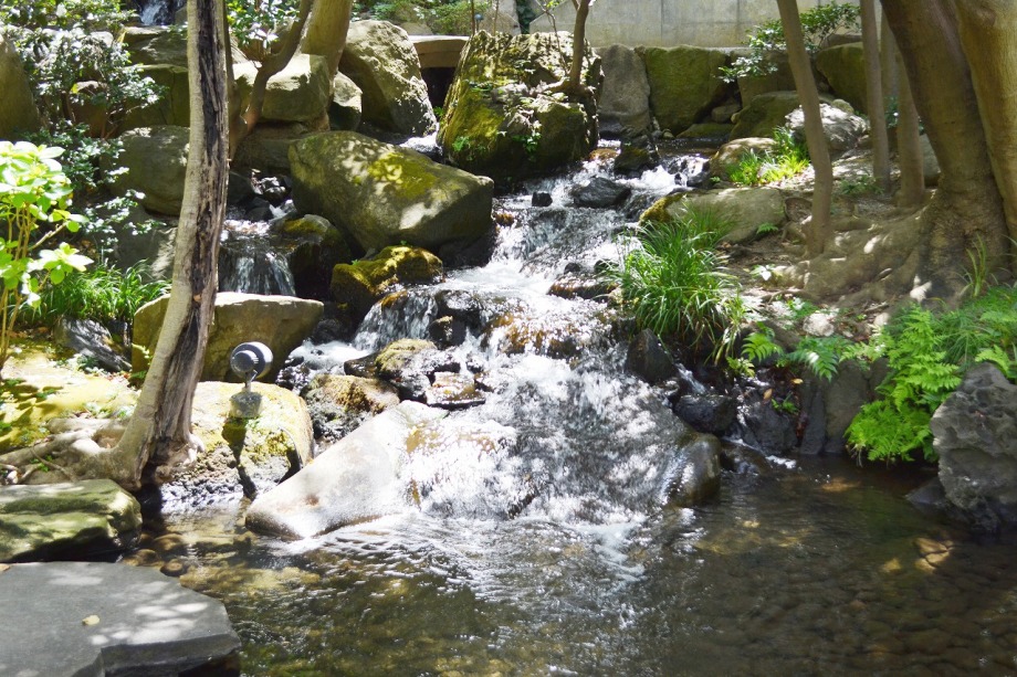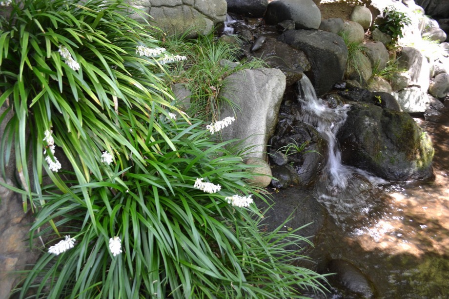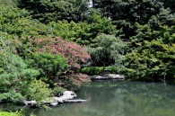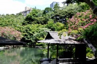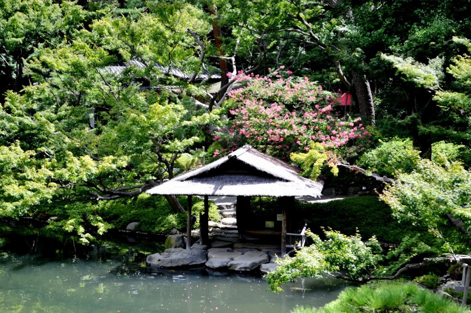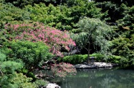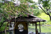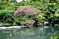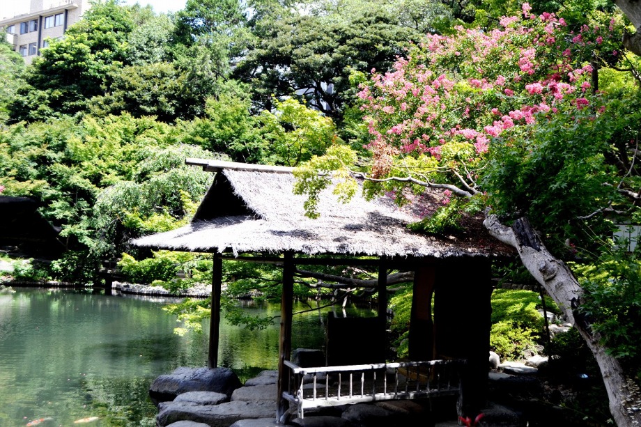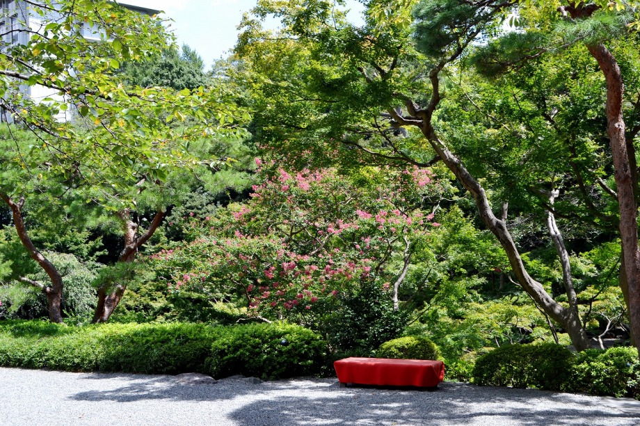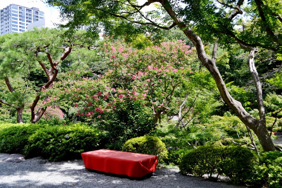 「一言」八芳園にはお花が少ないと聞いていましたが、見に行きましたら。ピンク色の百日紅が池の周りに咲いていました。暑い時期に庭の雰囲気と 調和して良い雰囲気でした。木々は濃い緑色になっており、水の流れもあったので、落ち着いた感じがしました。