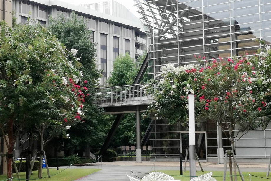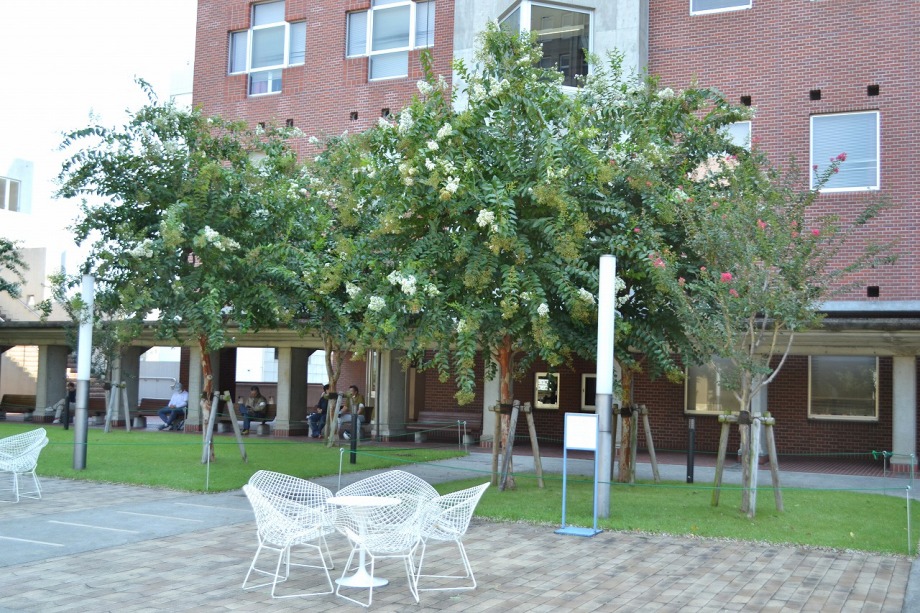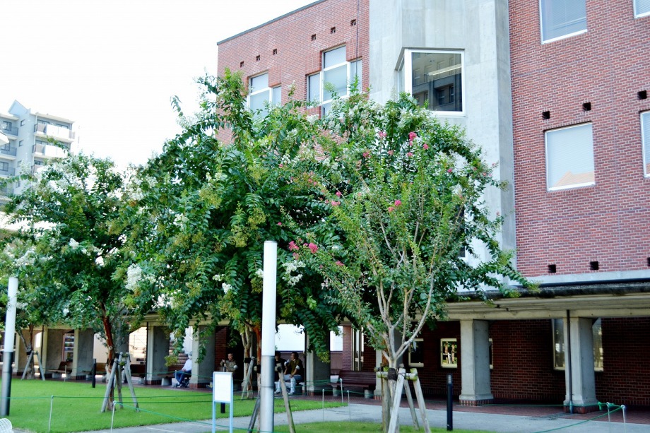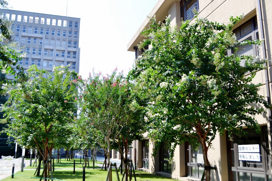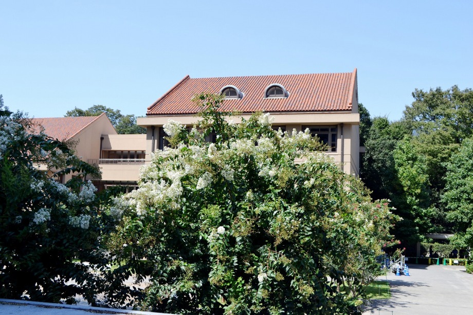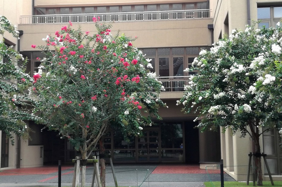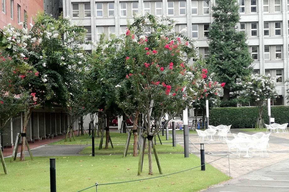「一言」明治学院大学に行ったら、校庭に百日紅の花がたくさん咲いていましたので、写真を撮りました。3日は曇っていましたので、天気が 良くなった5日も写真を撮りに行きました。4日に台風が来たので、ピンク色の花がたくさん散っていました。
