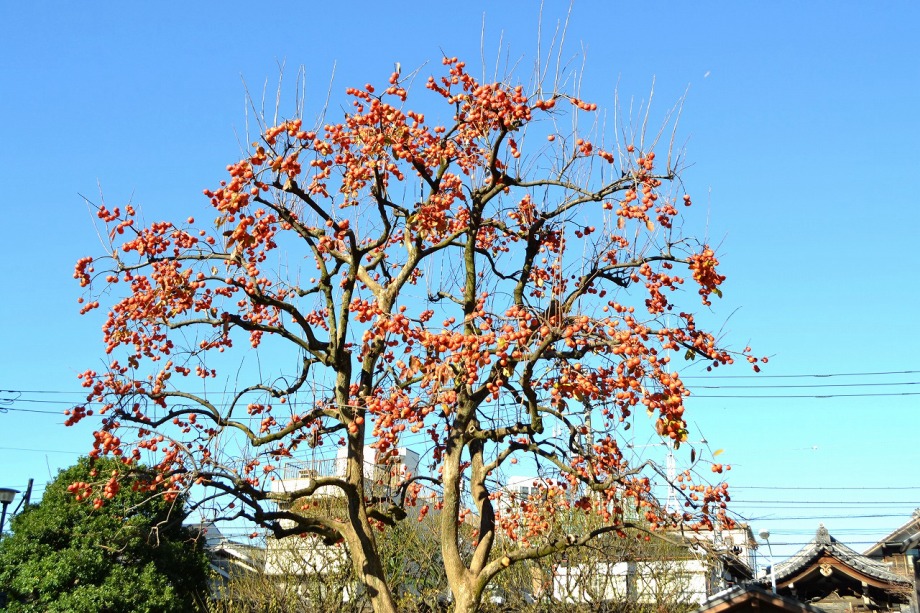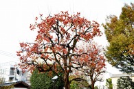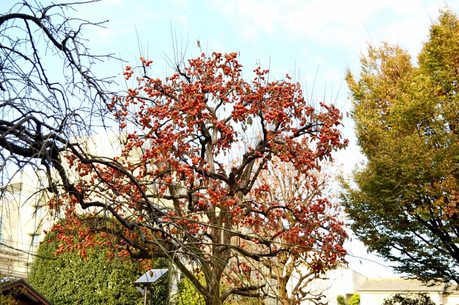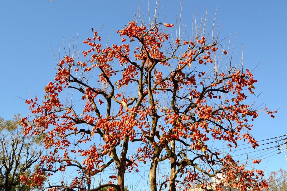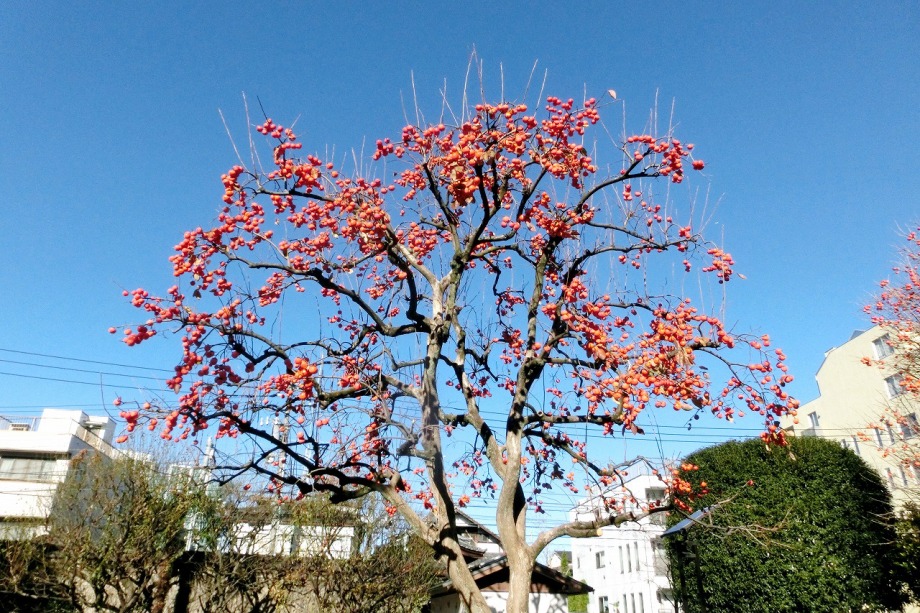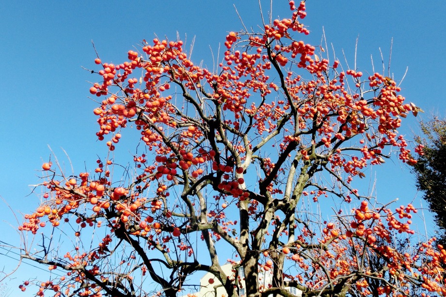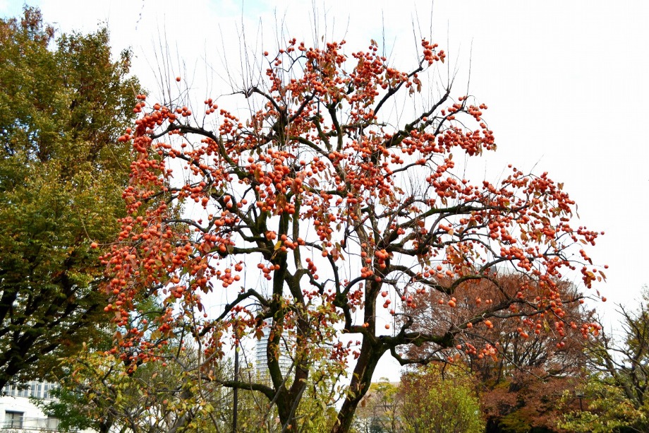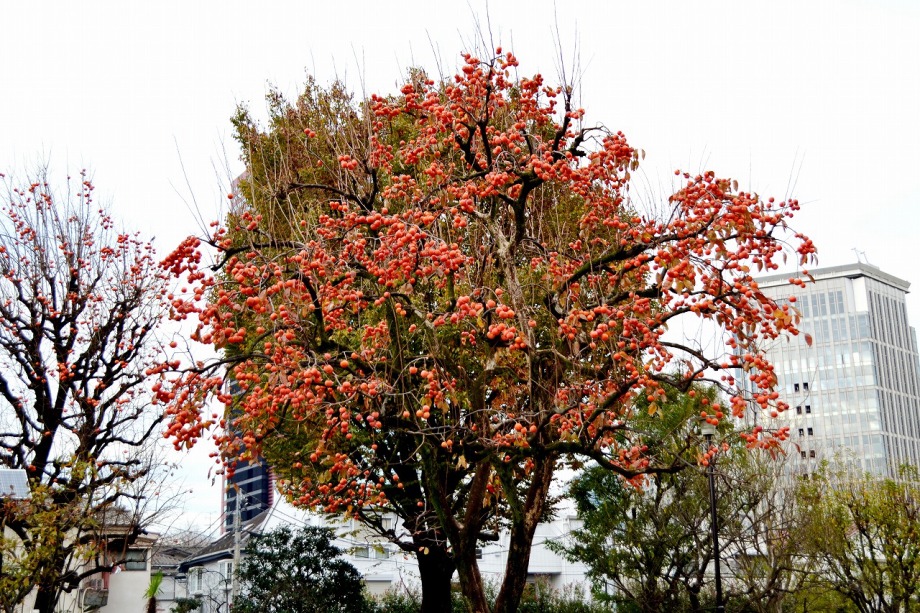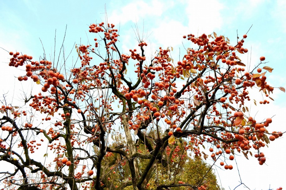 「一言」三田台公園の柿の実がたくさんなっています。今年は驚くほどたくさんの赤い実がなっていますので木が赤く見えます。 大きな柿の木の実にはメジロが集まっています。高いところにメジロが止まっていますので写真を撮るのは難い状況です。