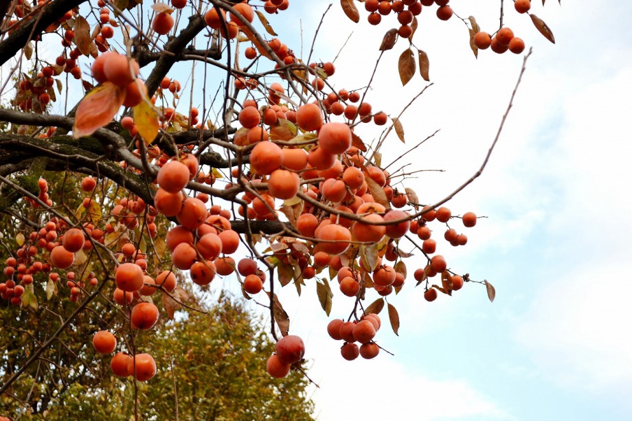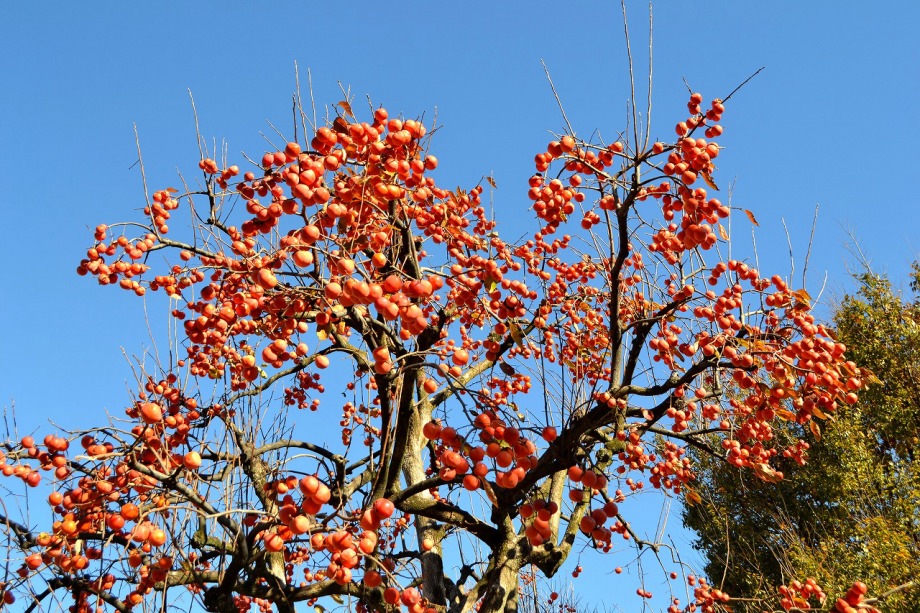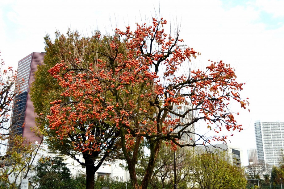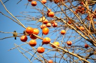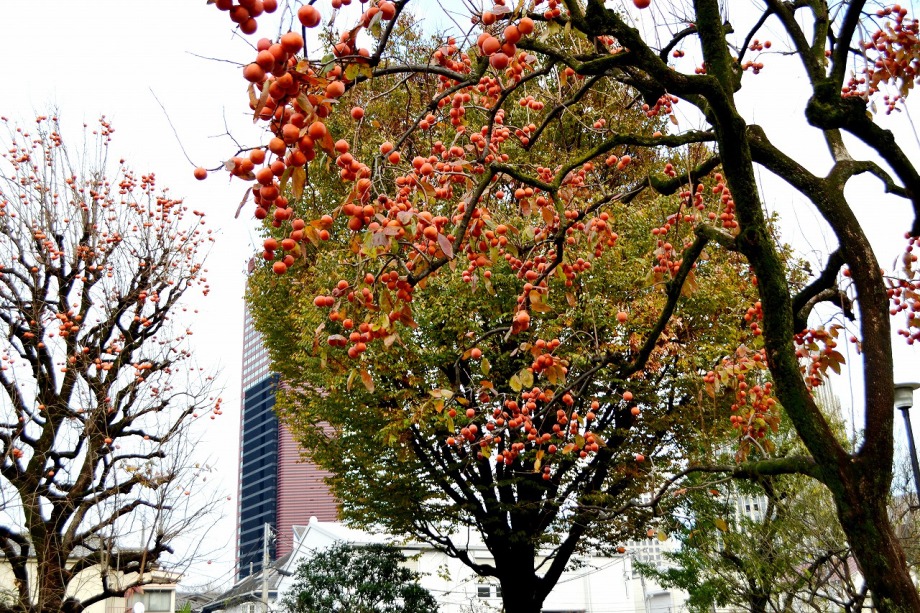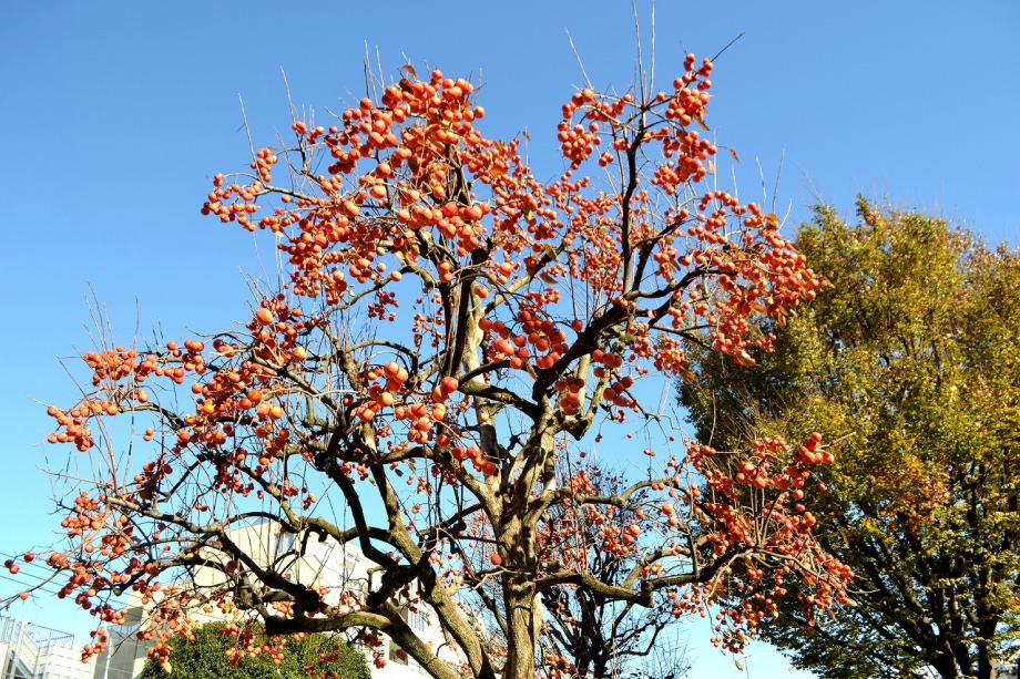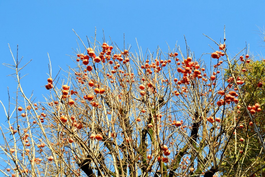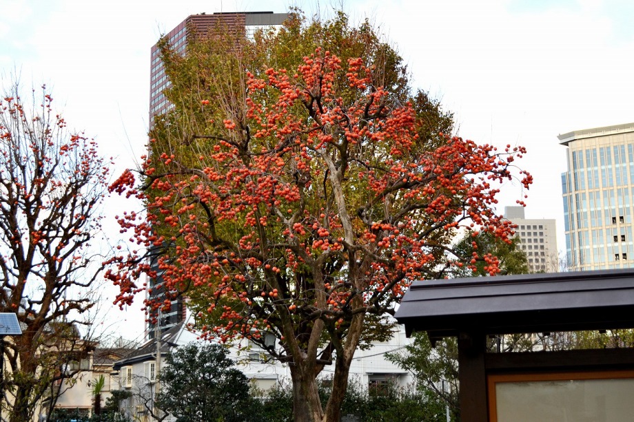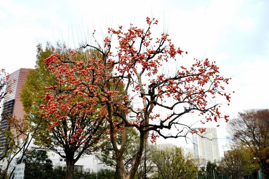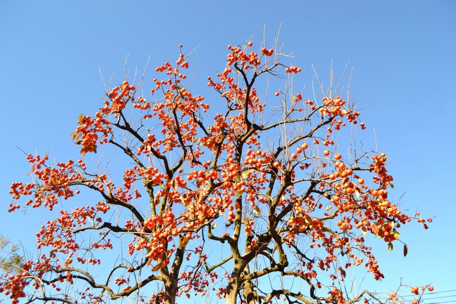 「一言」三田台公園の柿の実がたくさんなっています。今年は驚くほどたくさんの赤い実がなっていますので木が赤く見えます。 大きな柿の木の実にはメジロが集まっています。高いところにメジロが止まっていますので写真を撮るのは難い状況です。