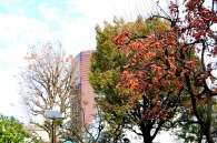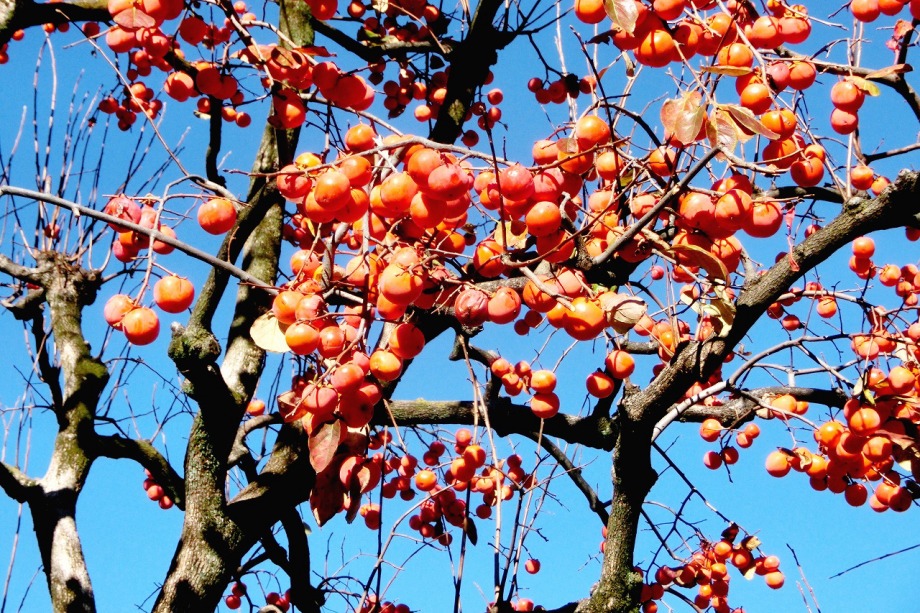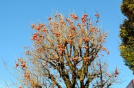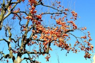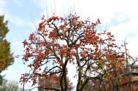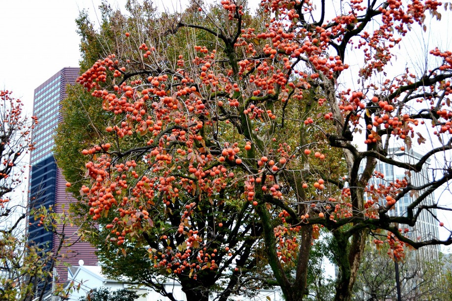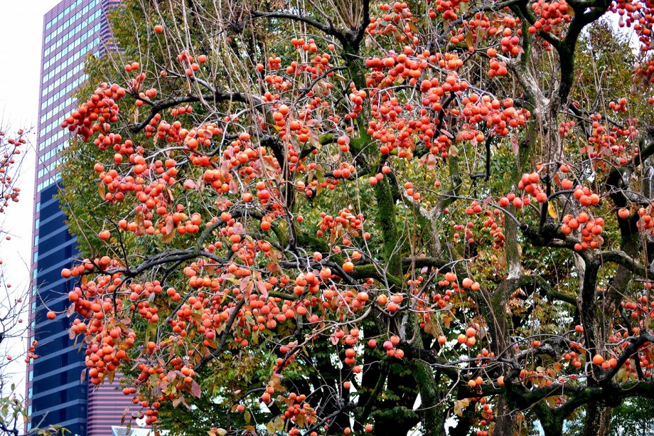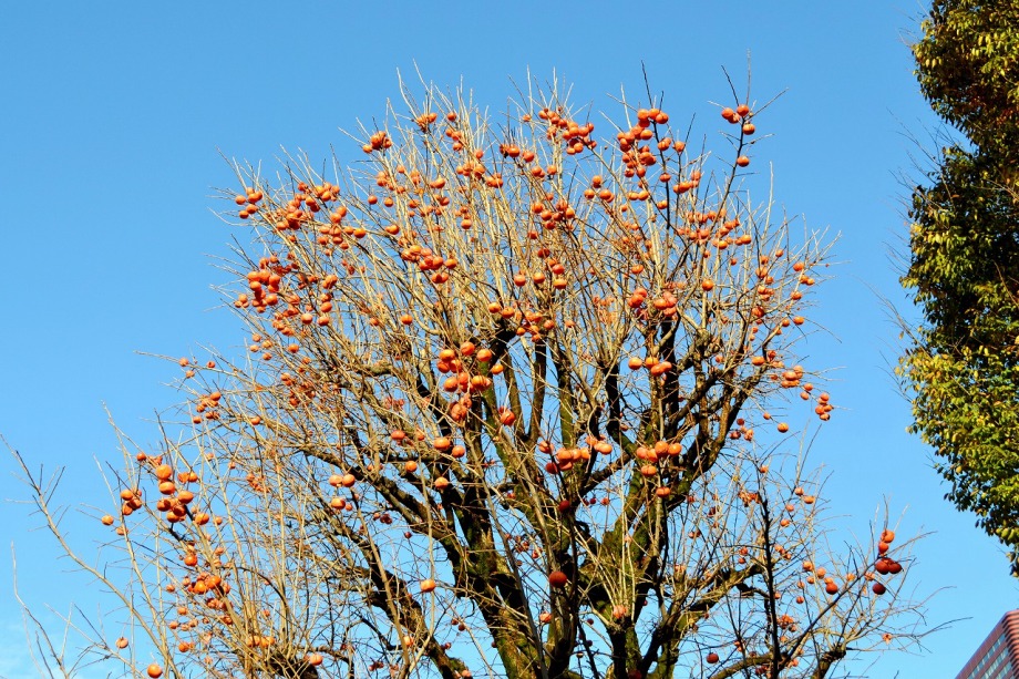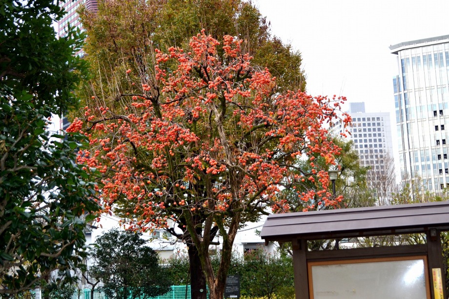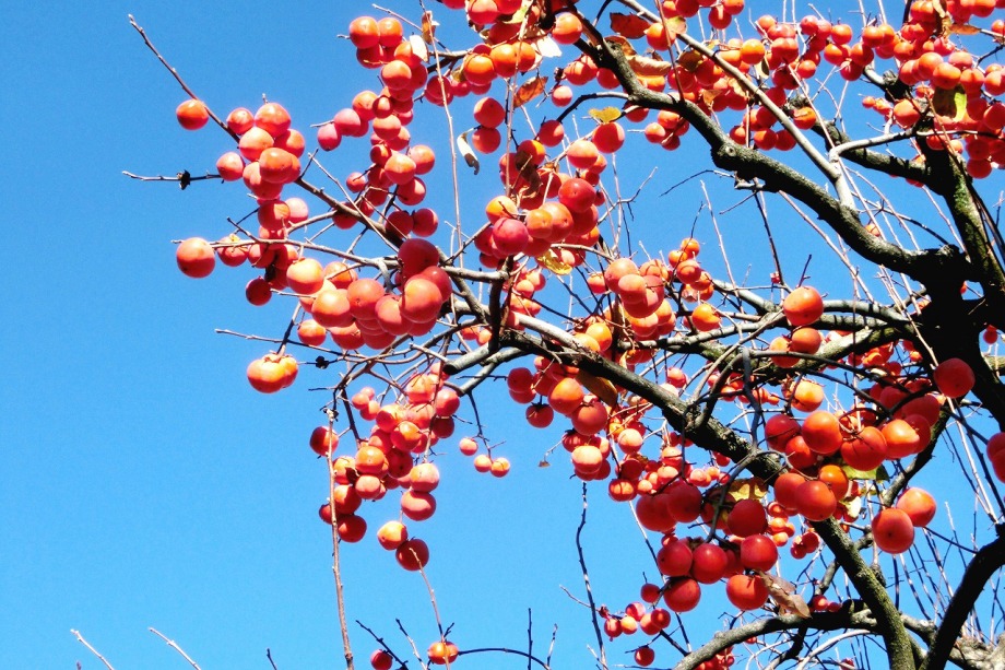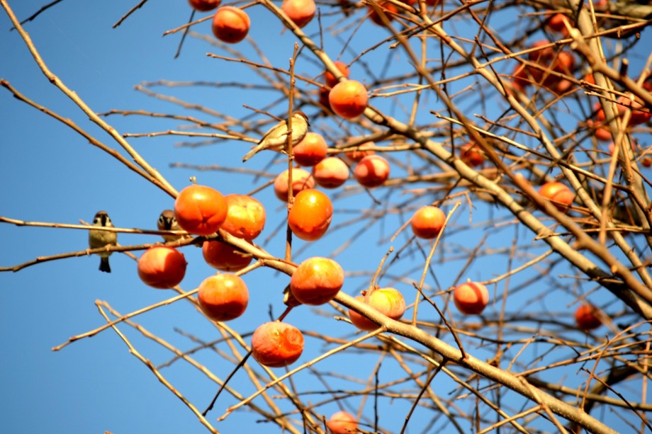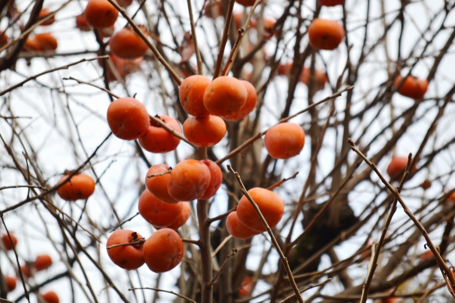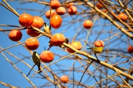 「一言」三田台公園の柿の実がたくさんなっています。今年は驚くほどたくさんの赤い実がなっていますので木が赤く見えます。 大きな柿の木の実にはメジロが集まっています。高いところにメジロが止まっていますので写真を撮るのは難い状況です。