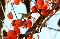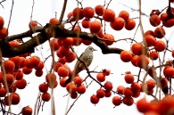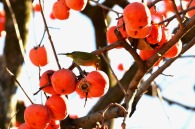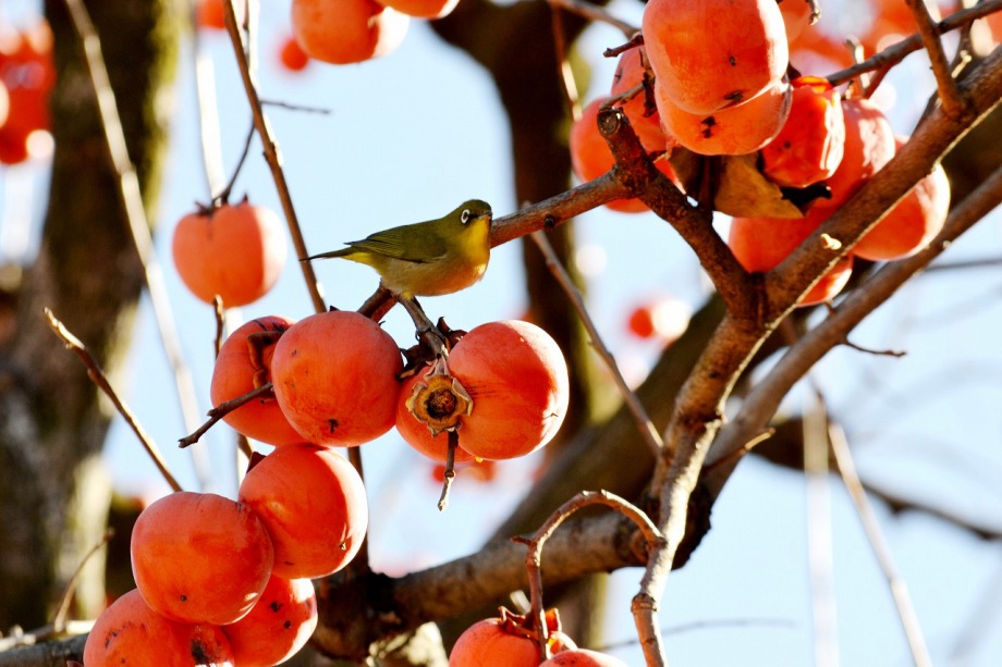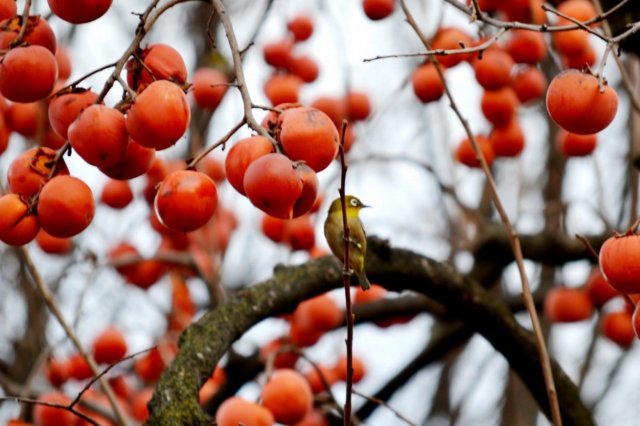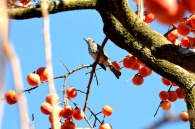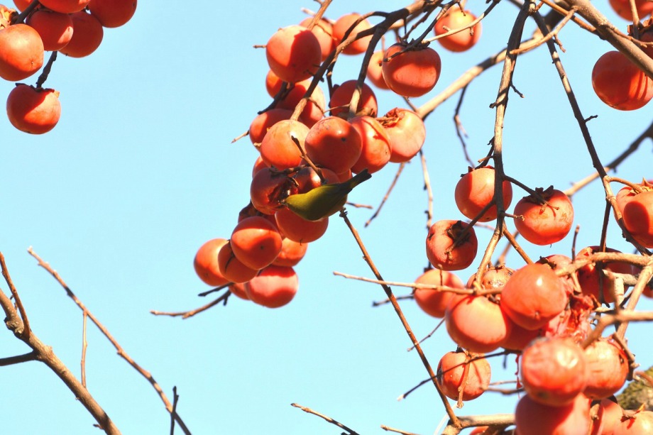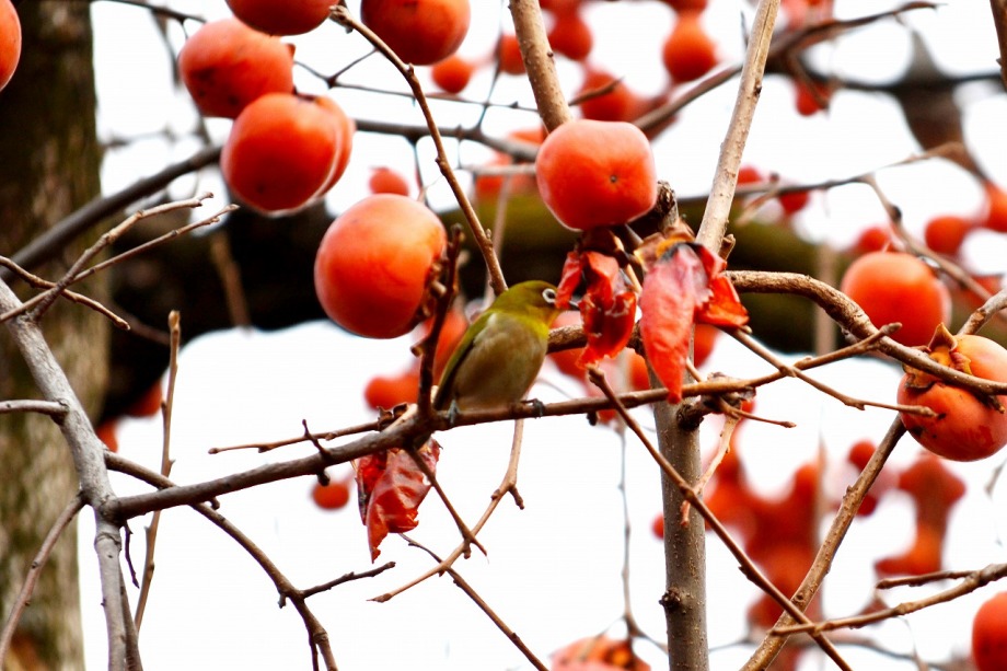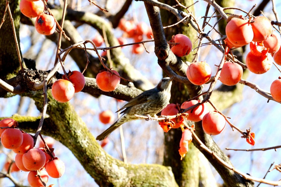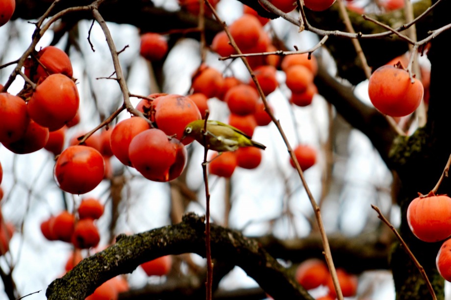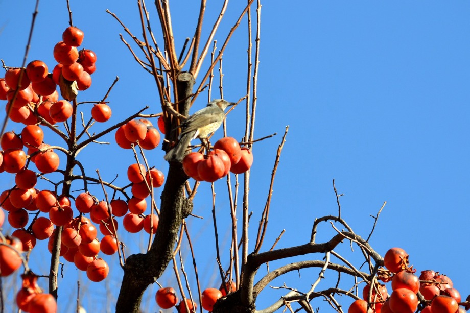 低い柿の木の実にもそろそろ鳥が飛んで来て柿の実を食べていました。