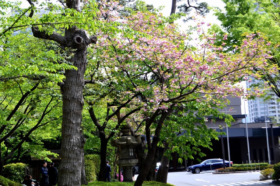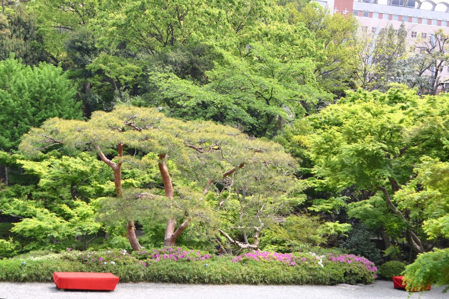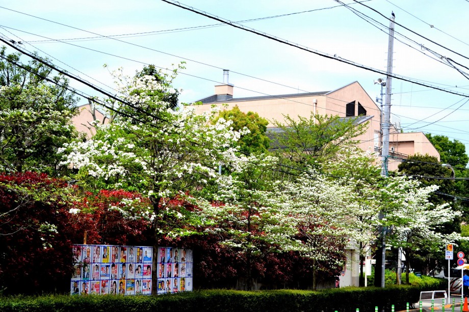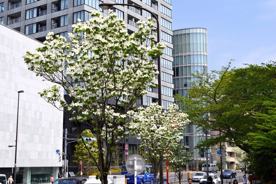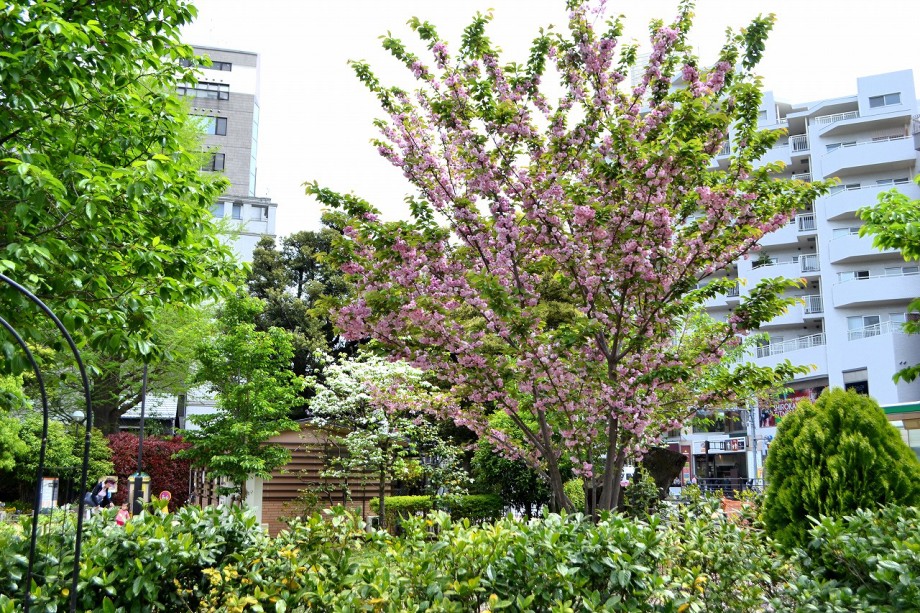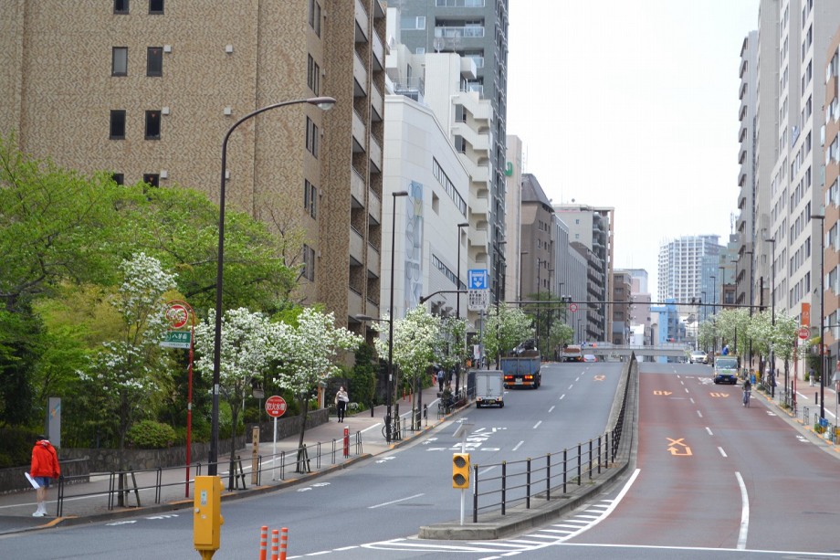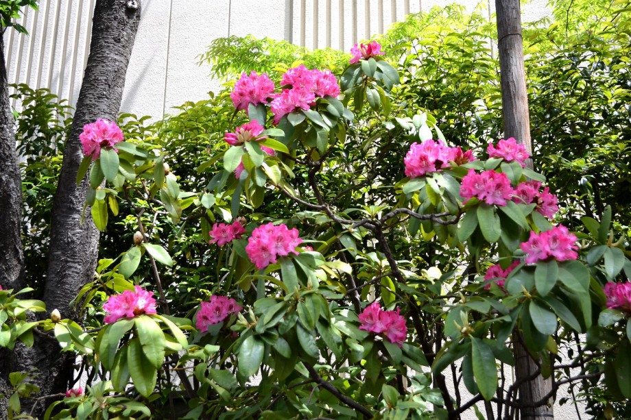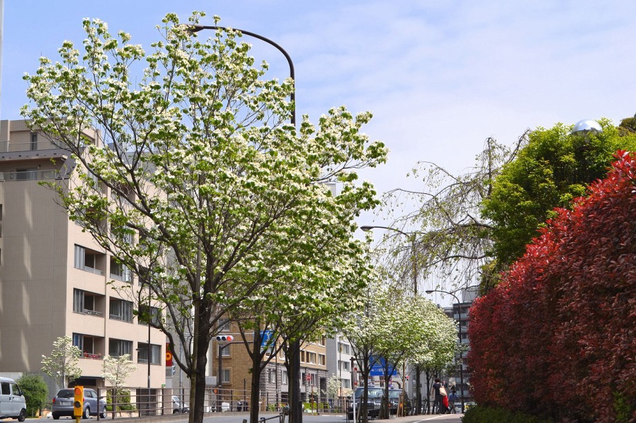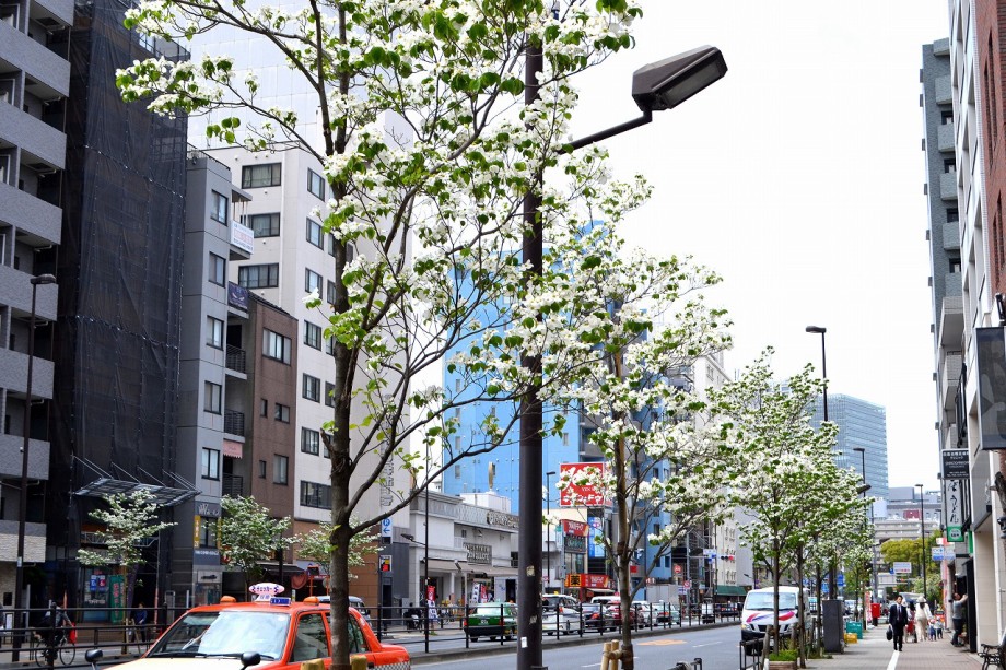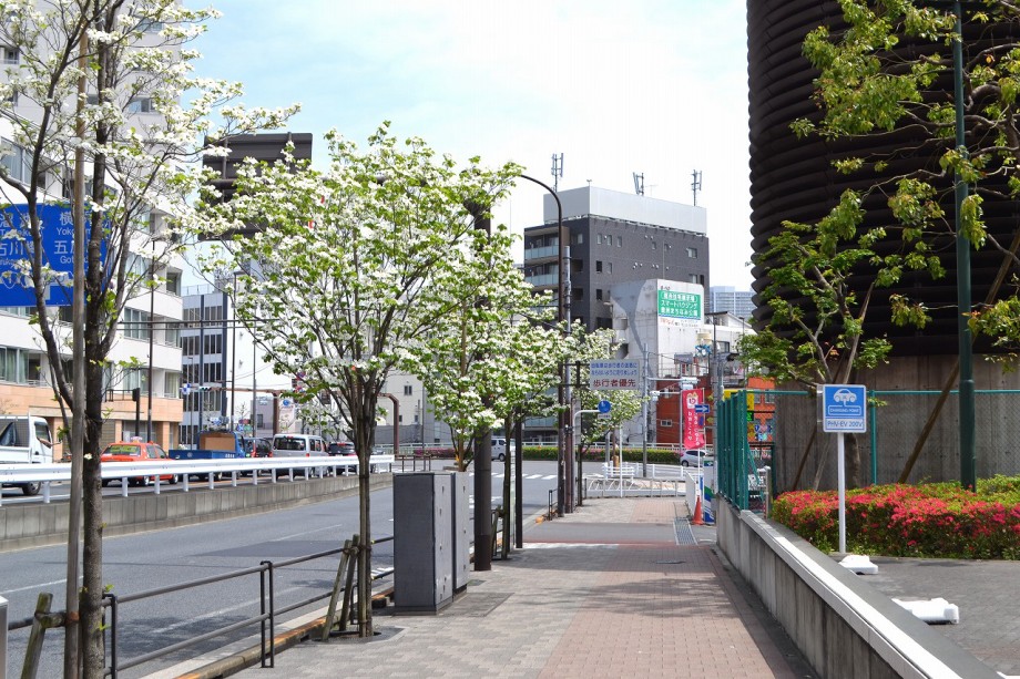 見ていて飽きませんでした。プラチナ通りの並木や東大の医科研の入り口の大きな木も新緑で綺麗になっています。八芳園には八重桜が咲き、 ツツジが咲き出していました。もう少ししたら庭園のツツジが満開になりそうです。目黒通りには花水木の花が見頃になり、道路沿いの並木が良い 雰囲気になりました。