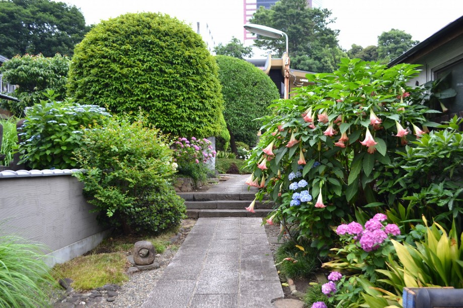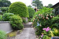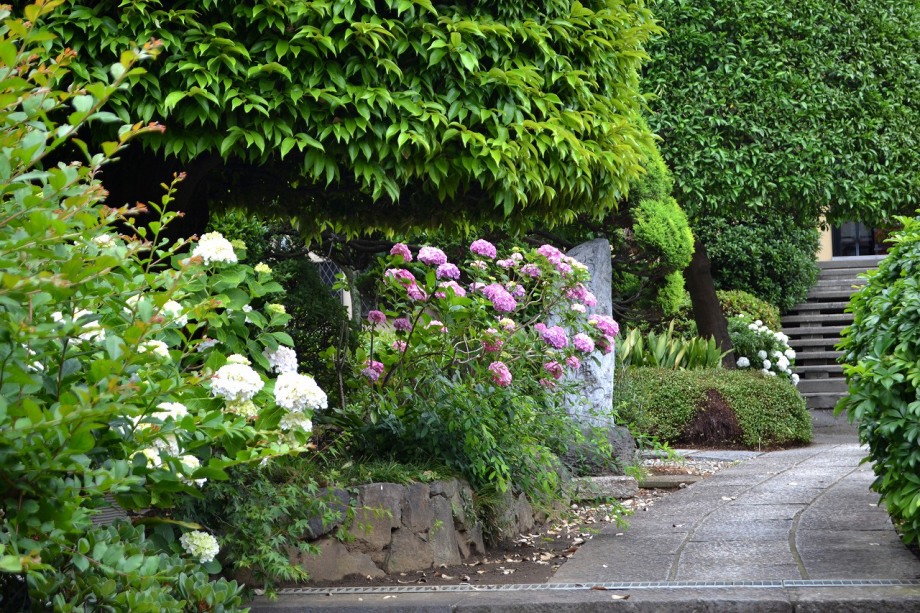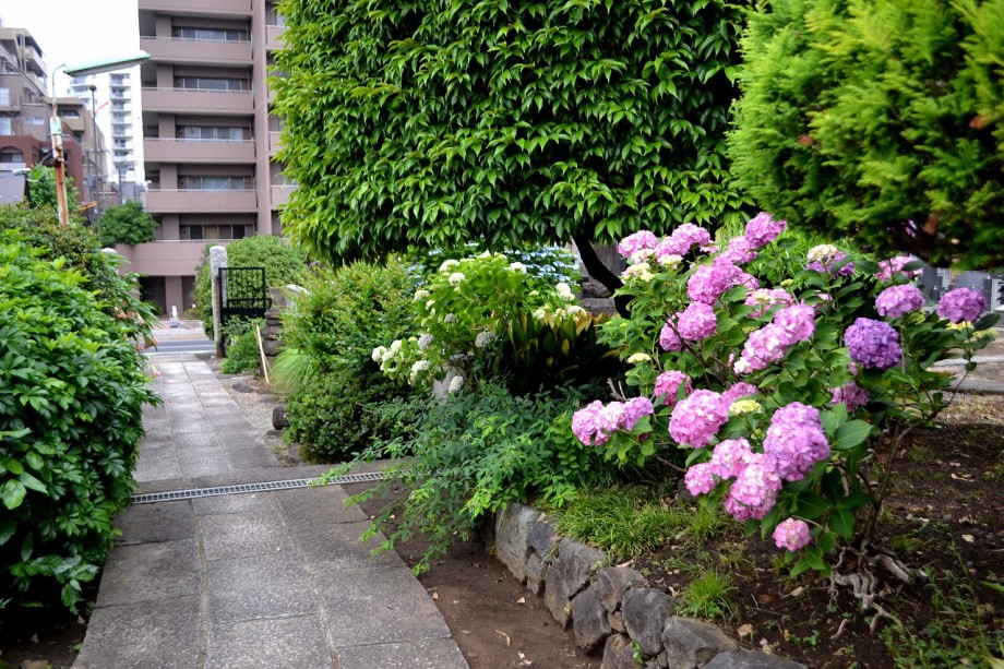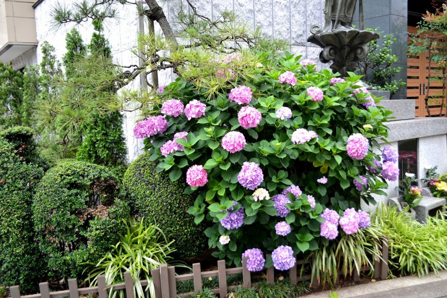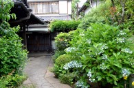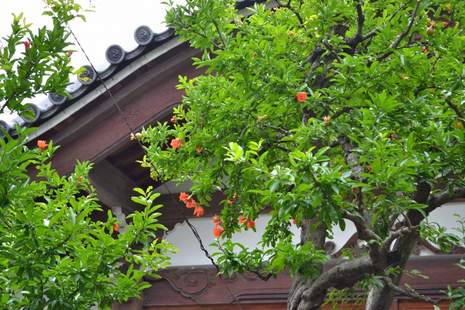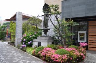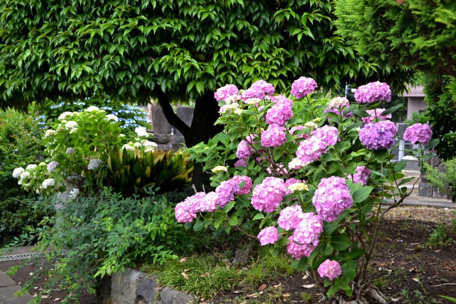 「一言」林泉寺の前の仏像の回りにはサツキや紫陽花が咲いています。願海寺には色々な色の紫陽花が咲いています。特に、トランペットフラワー がたくさんの花が咲いています。常林寺には水鉢に水連の花が咲いています。玉鳳寺にはバラが咲いています。三田台遊園にはガクアジサイ があちこちに咲いています。正山寺には本堂の前にザクロの花が咲いています。