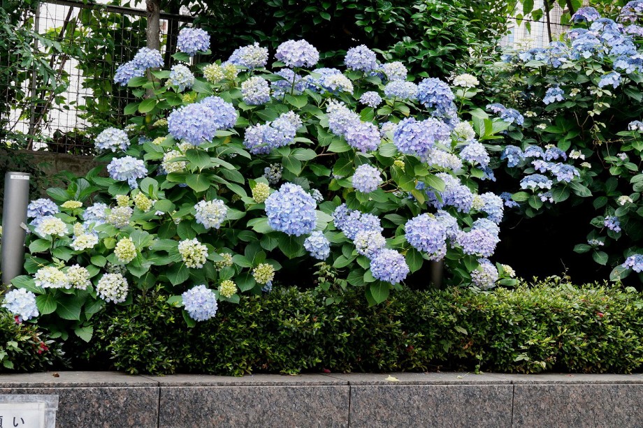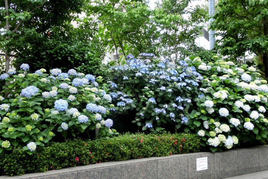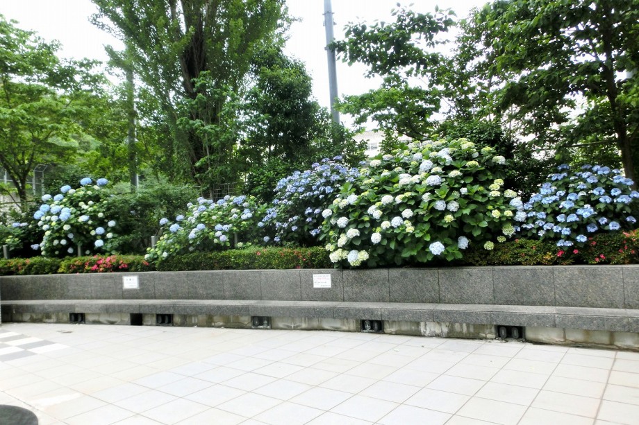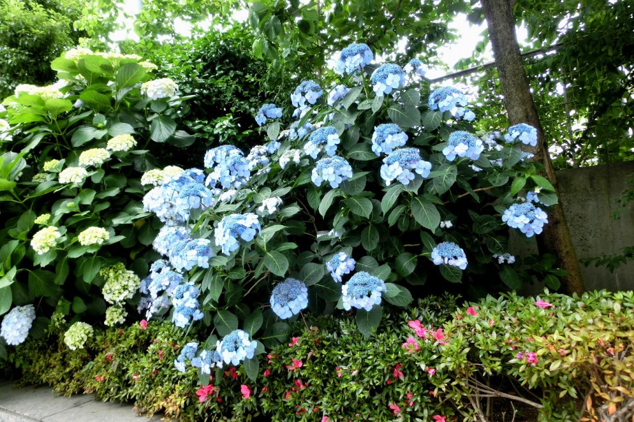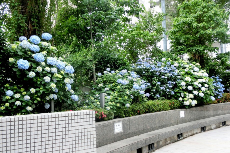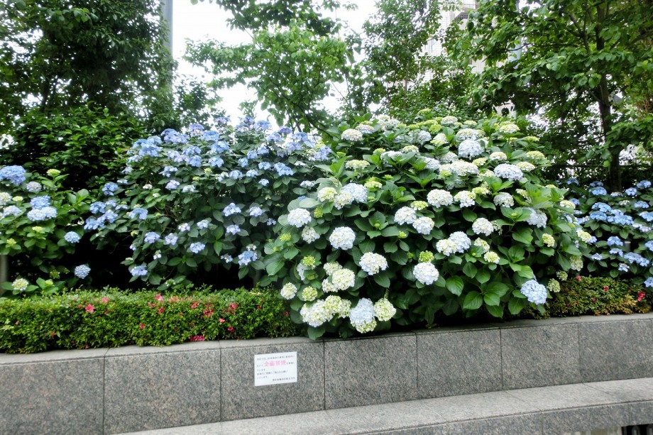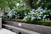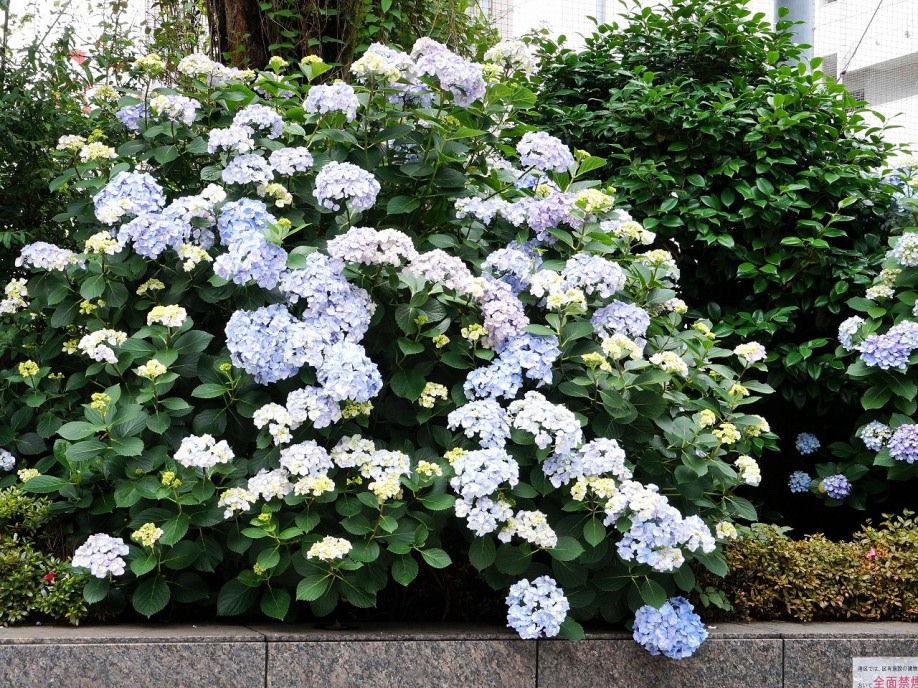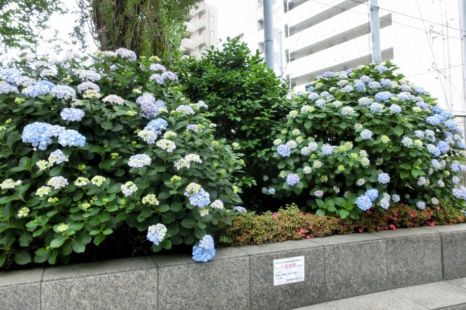 「一言」高輪支所の2階にある紫陽花が見頃です。紫陽花の木が大きくなっておりいっぱい花を咲かせているので迫力があります。 色々な種類の紫陽花の花が咲いていて綺麗です。泉岳寺にも色々な種類の紫陽花の花が咲いており見頃になっています。