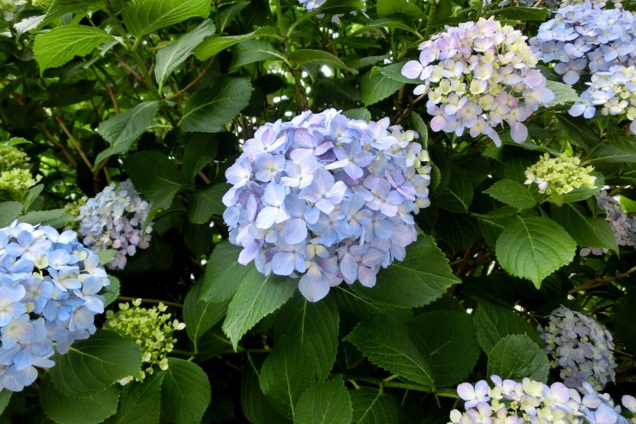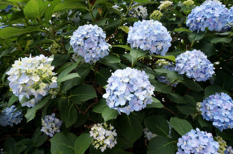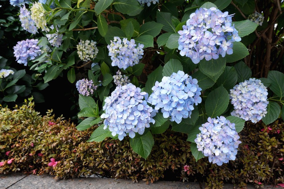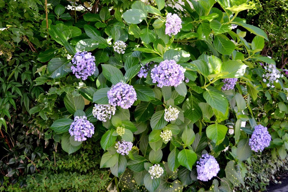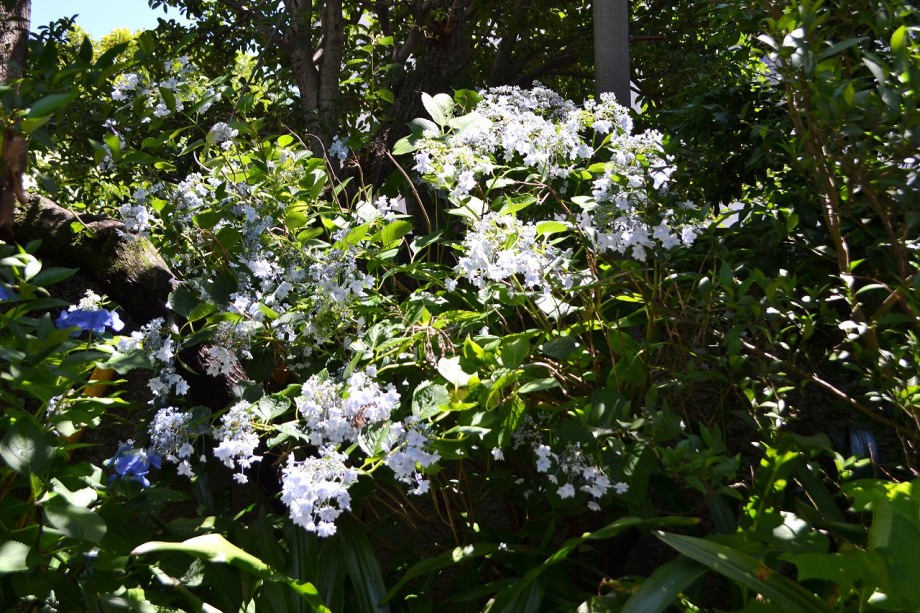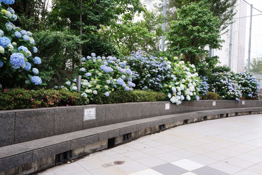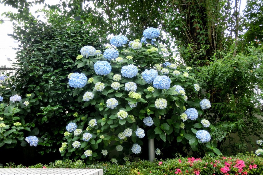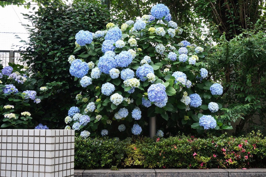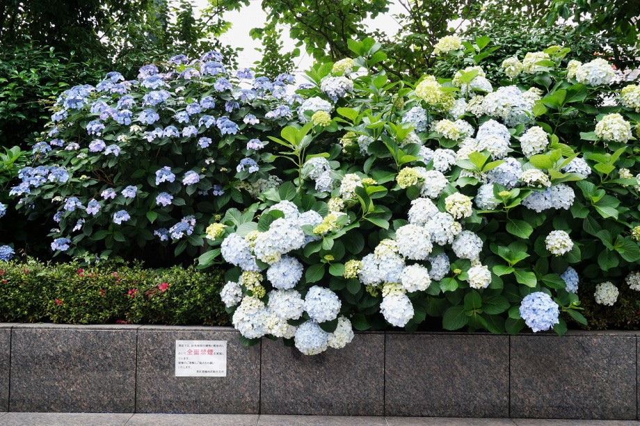 「一言」高輪支所の2階にある紫陽花が見頃です。紫陽花の木が大きくなっておりいっぱい花を咲かせているので迫力があります。 色々な種類の紫陽花の花が咲いていて綺麗です。泉岳寺にも色々な種類の紫陽花の花が咲いており見頃になっています。