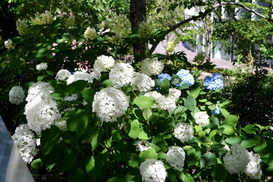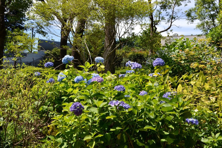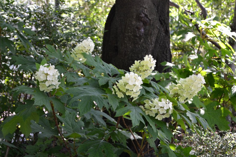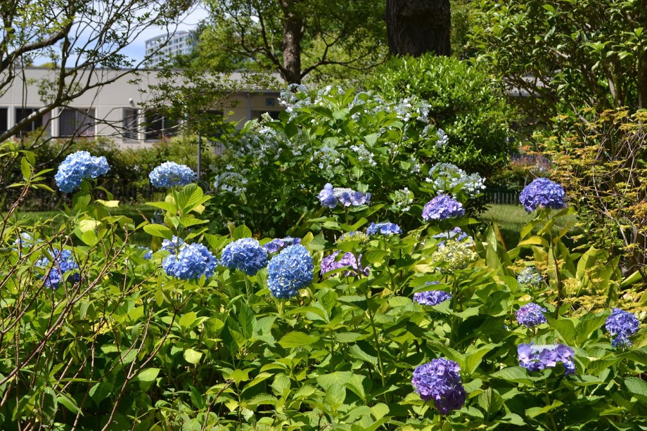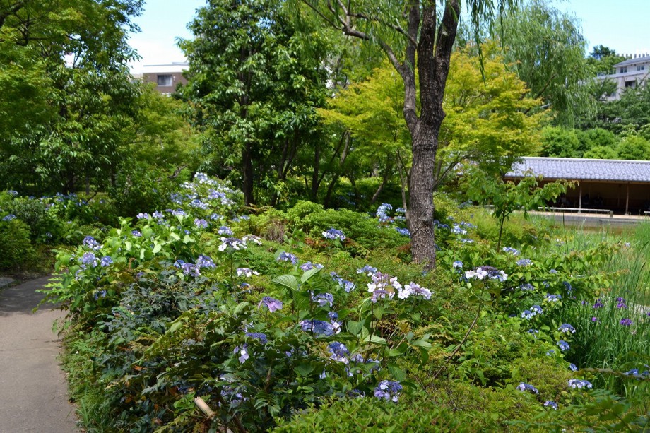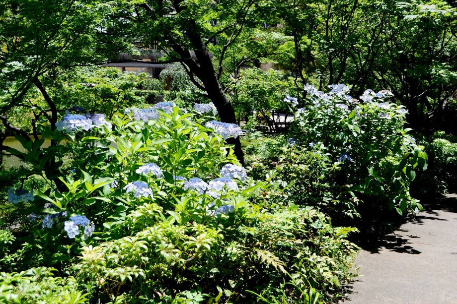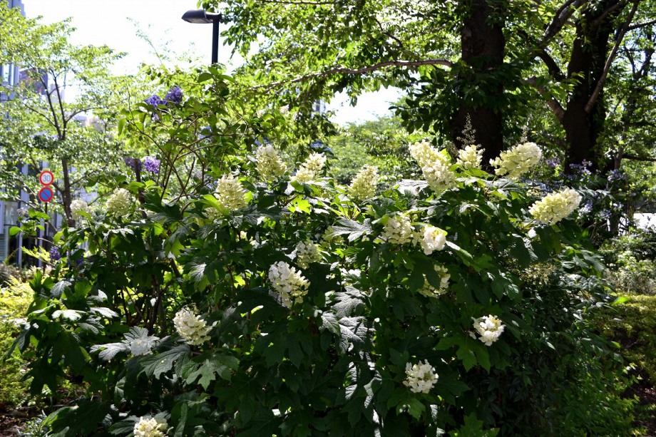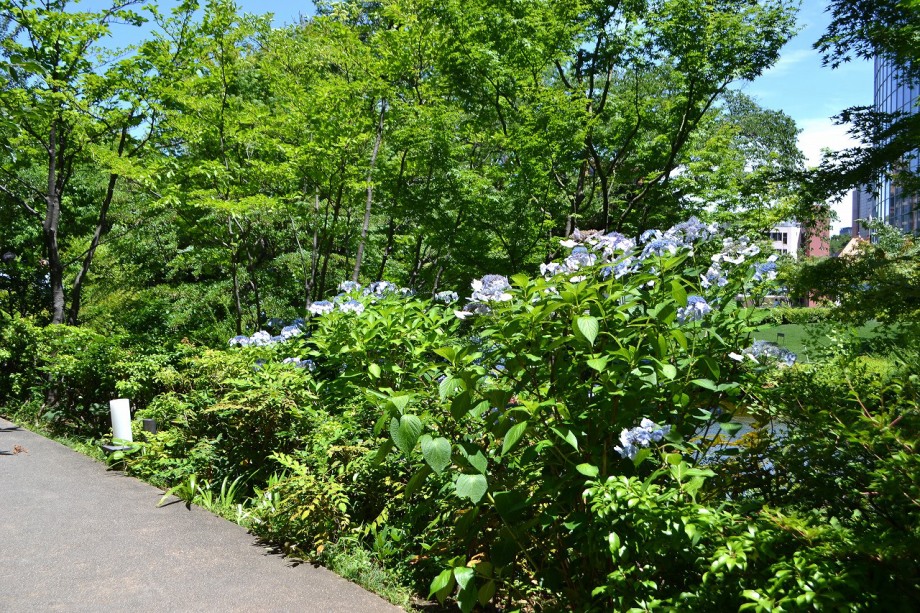 「一言」桧町公園にはビヨウヤナギの黄色い花がたくさん咲いています。紫陽花もたくさん植えており、どれも満開です。 池には花菖蒲や睡蓮の花が咲いています。公園の中にヤマボウシの白い花が満開で、遠くから見ると雪を被った 感じに見えます。東京ミッドタウンの庭園にはカシワバアジサイがあちこちに咲いています。アガパンサスの花が 咲き始めていますが、これからが本番という感じです。
